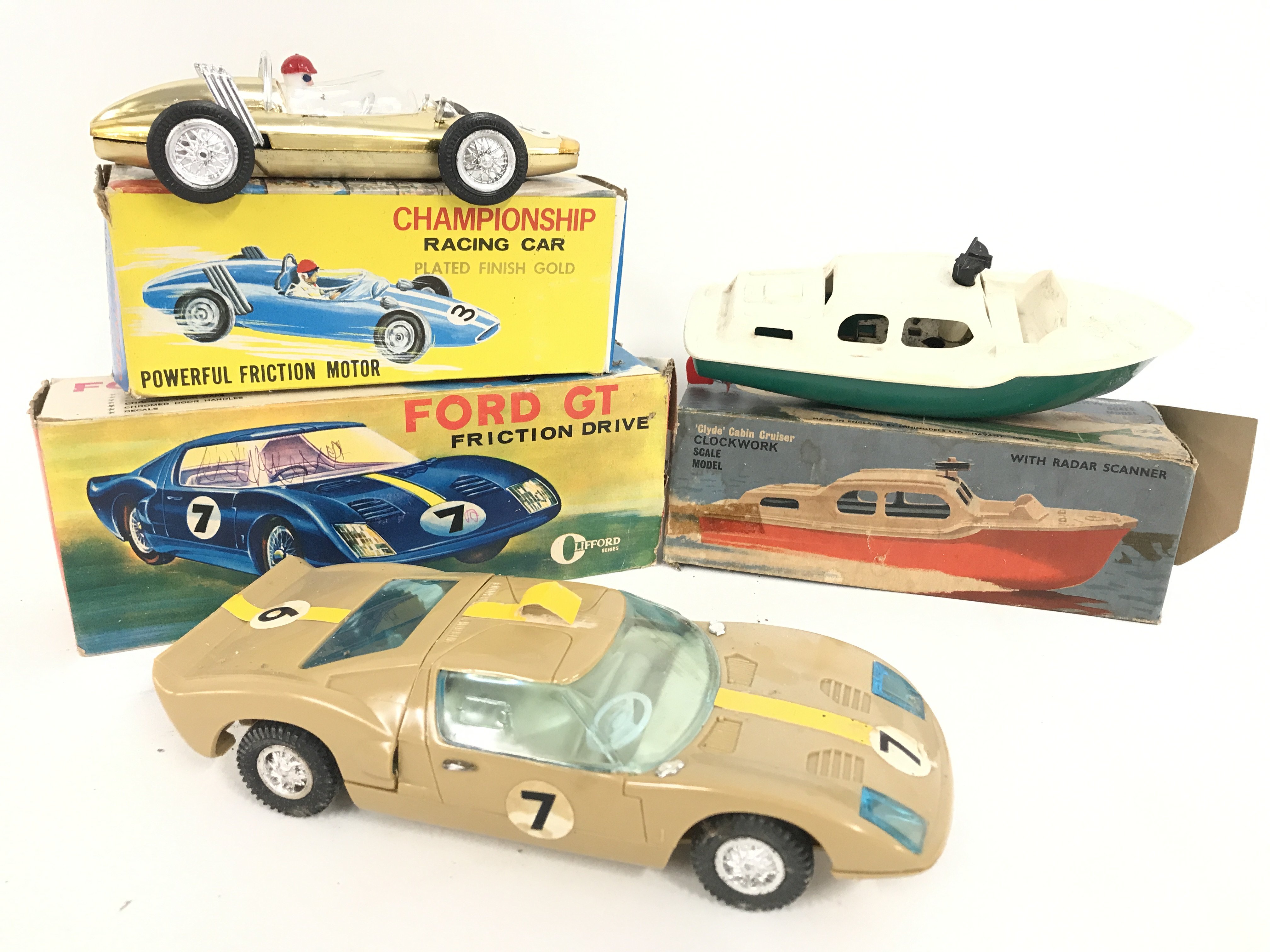 3 Boxed Plastic Vintage Toys. A Clifford Series Friction Drive Ford GT. A Championship Racing Car. And a Clockwork Clyde Cabin Cruiser