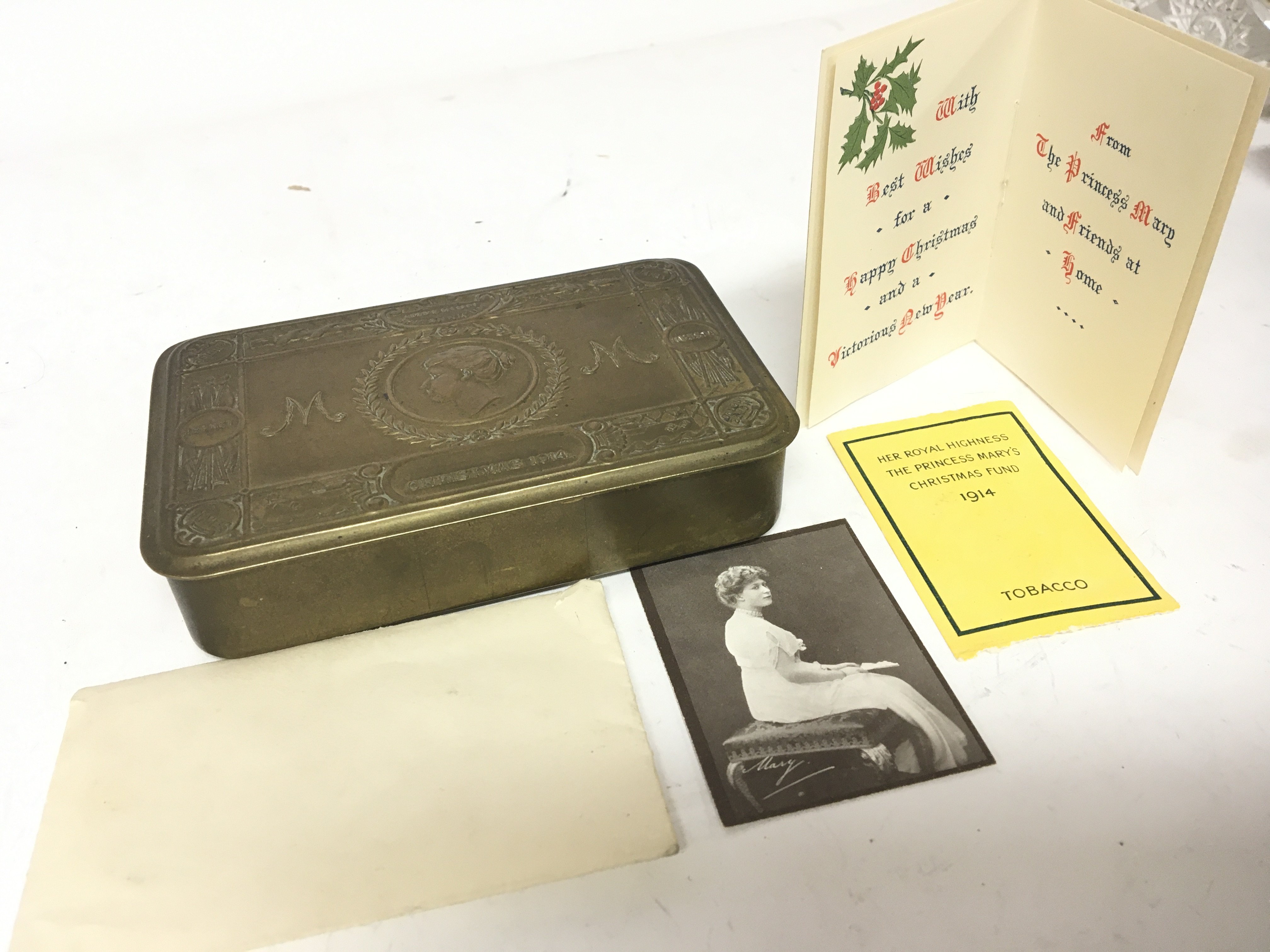A First World War Christmas tin Her Royal Highness The Princess Mary Christmas Fund with card envelope and photo.