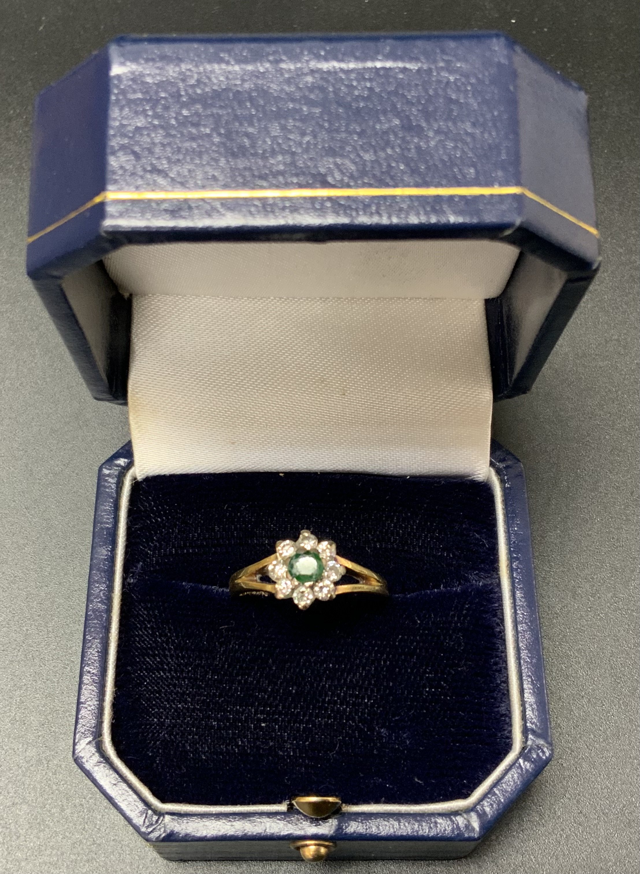 An 18ct gold emerald and diamond cluster ring, Size H. (A)