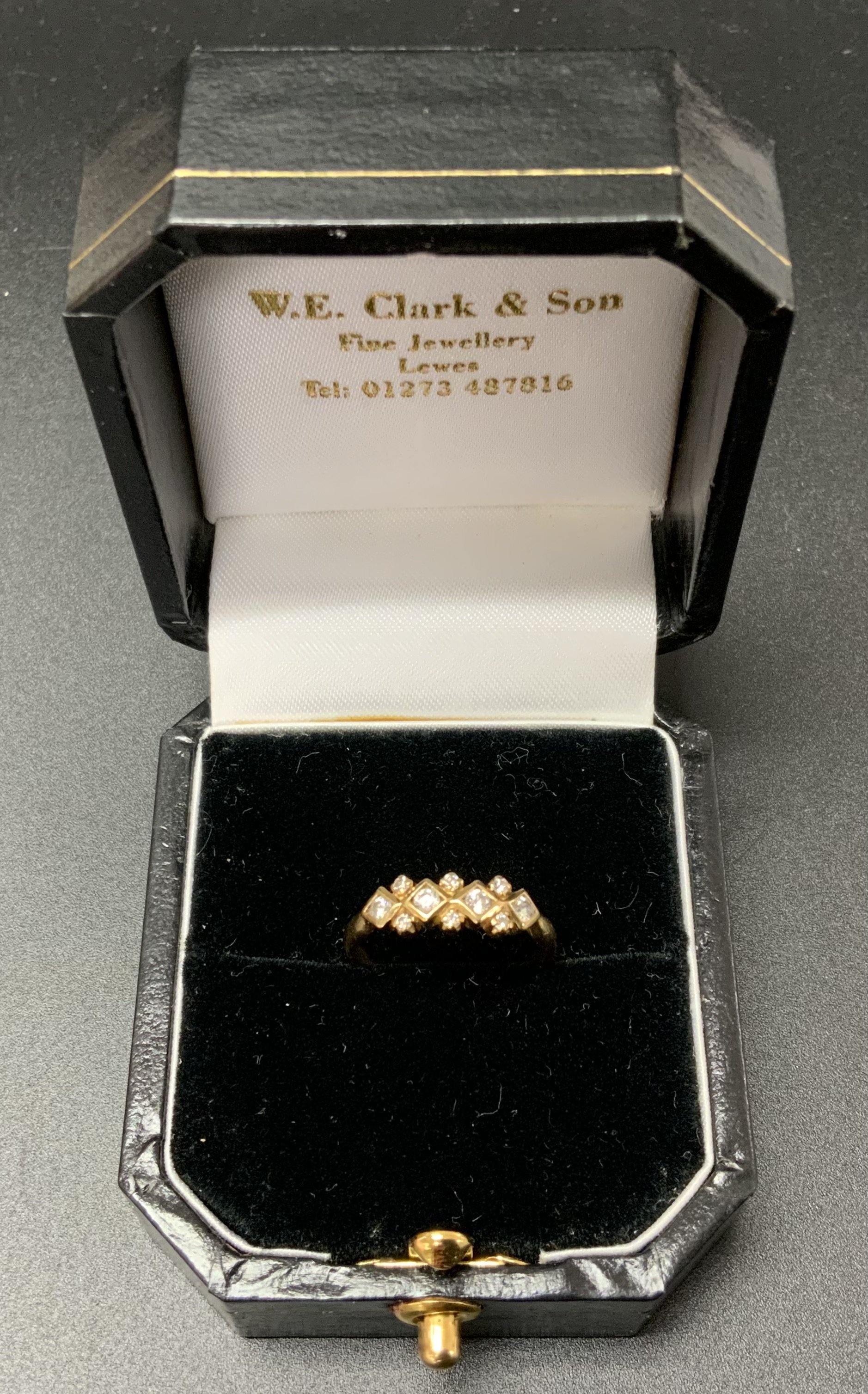 An 18ct gold ring set with a pattern of diamonds, Size J. (A)