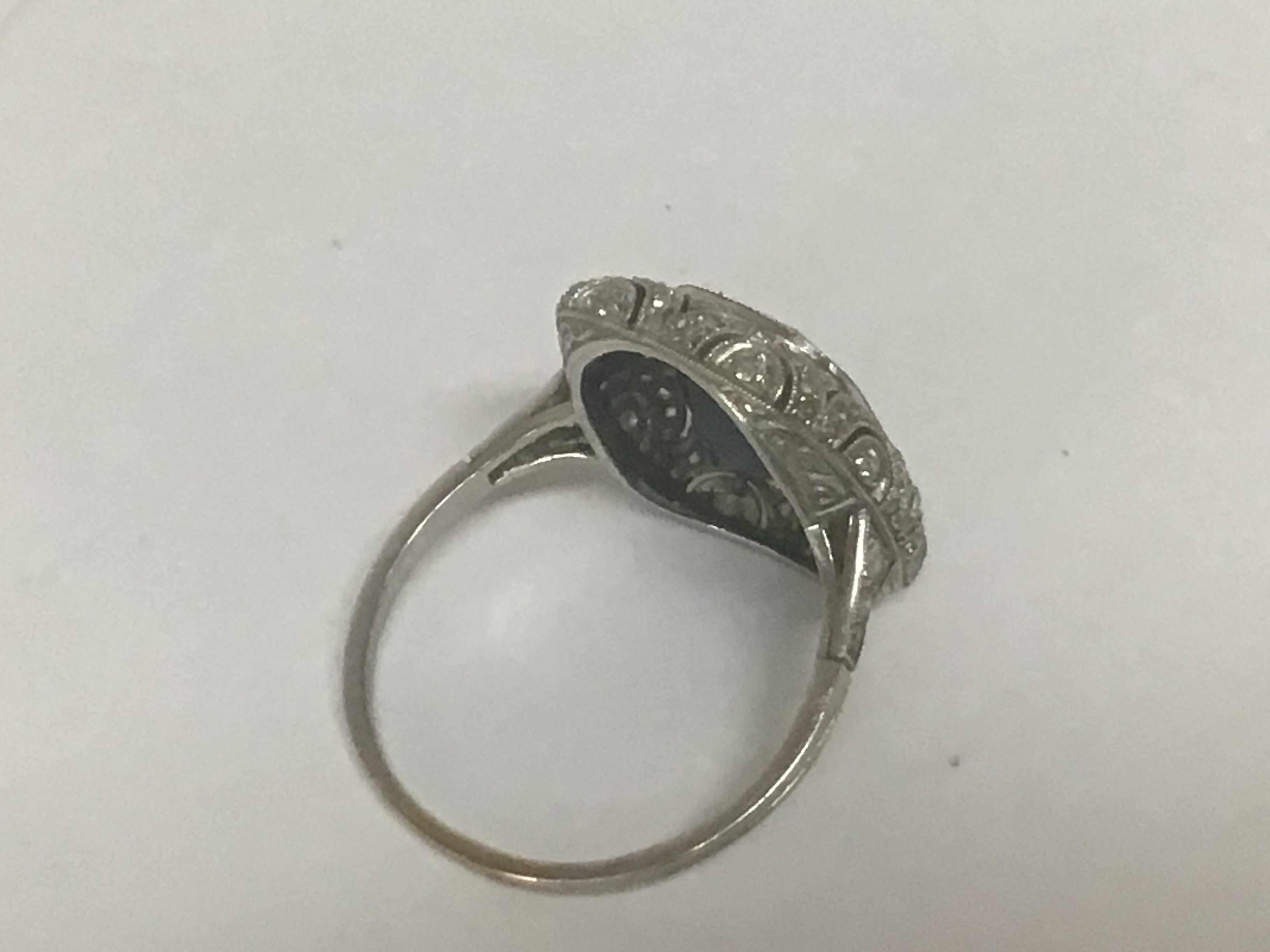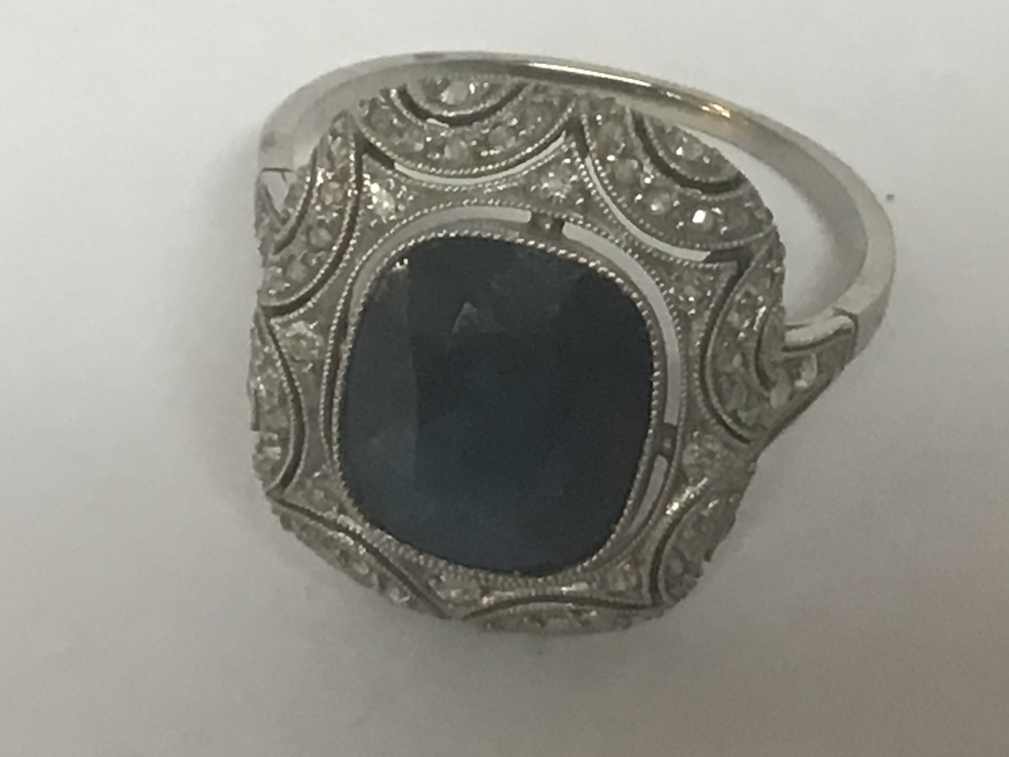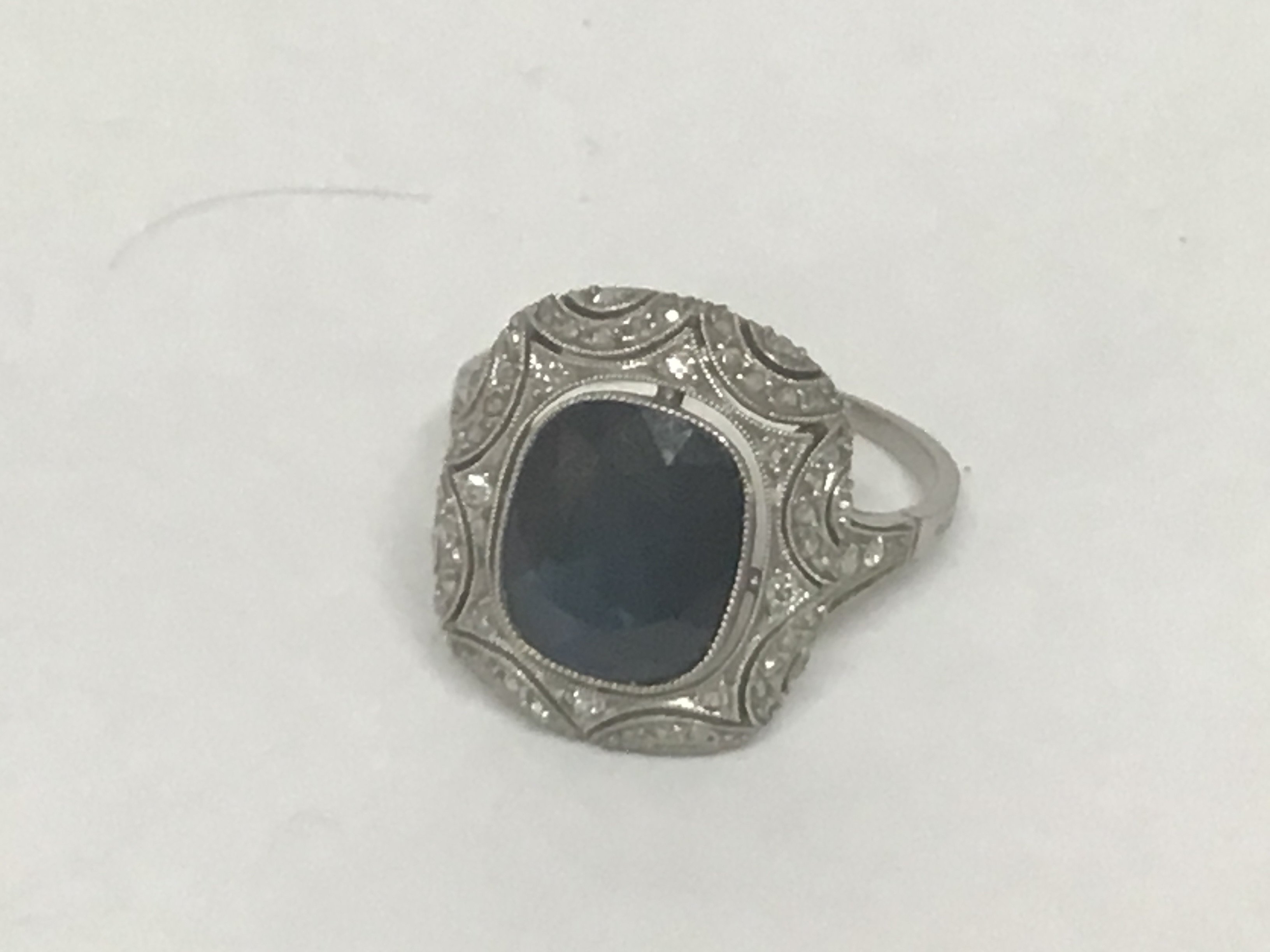 An Art Deco ladies ring set with a good sized deep blue Sapphire with a delicate surround by a delicate pattern of small diamonds. Possibly unmarked Platinum weight 5.5g ring size R. Sapphire approximate surface dimensions 12mmx9mm