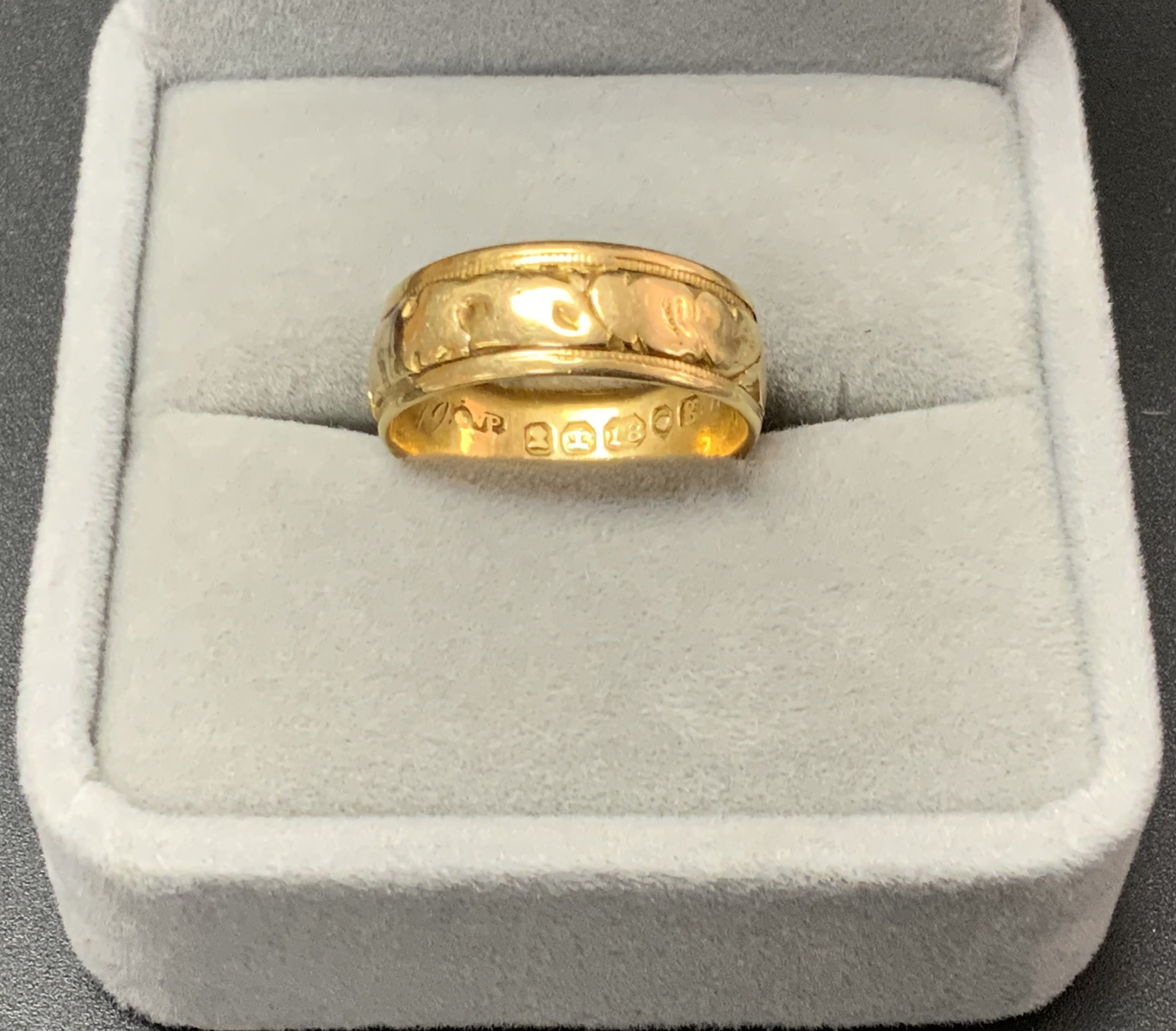 An Antique 18ct gold band with floral decoration and engraved personalised inscription. (A)