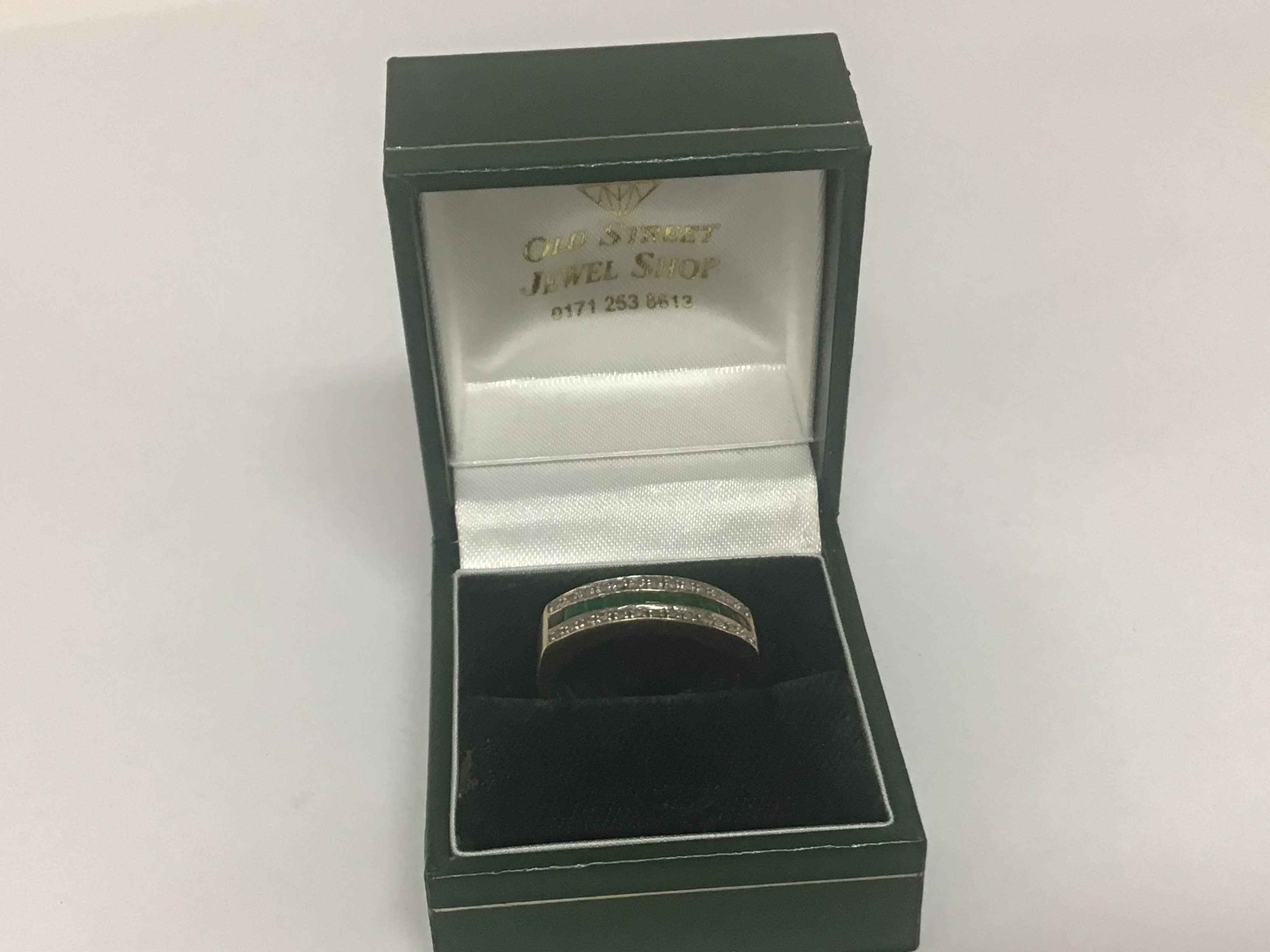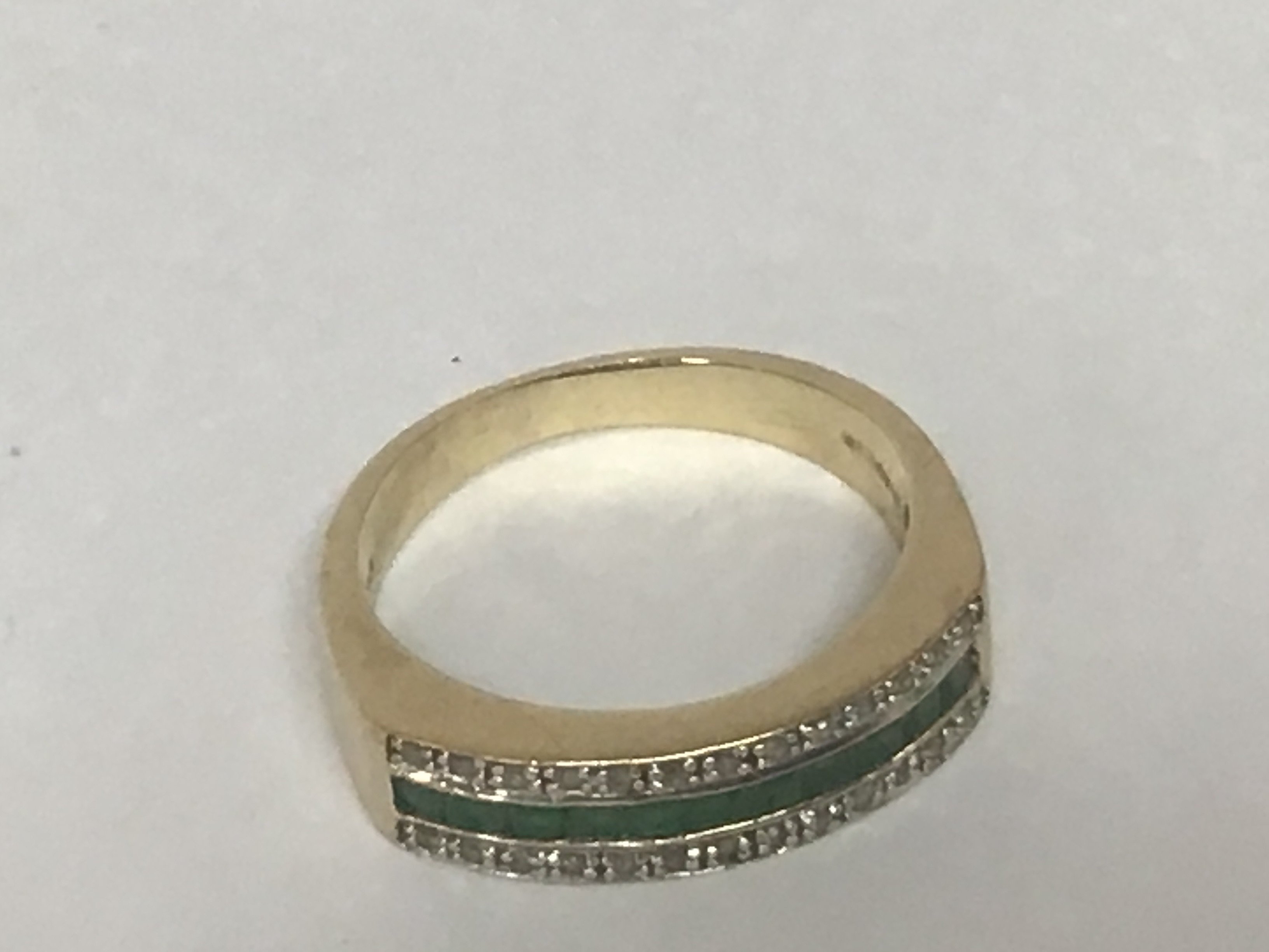 A 9cart gold ring set with emerald flanked by two rows of small diamonds weight 4g ring size P.