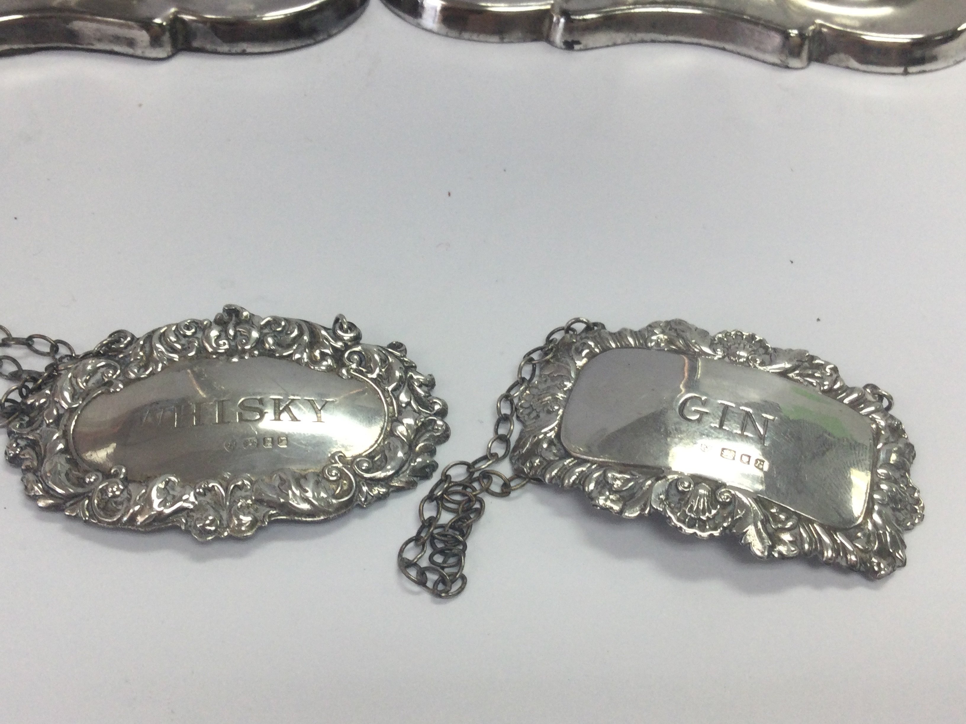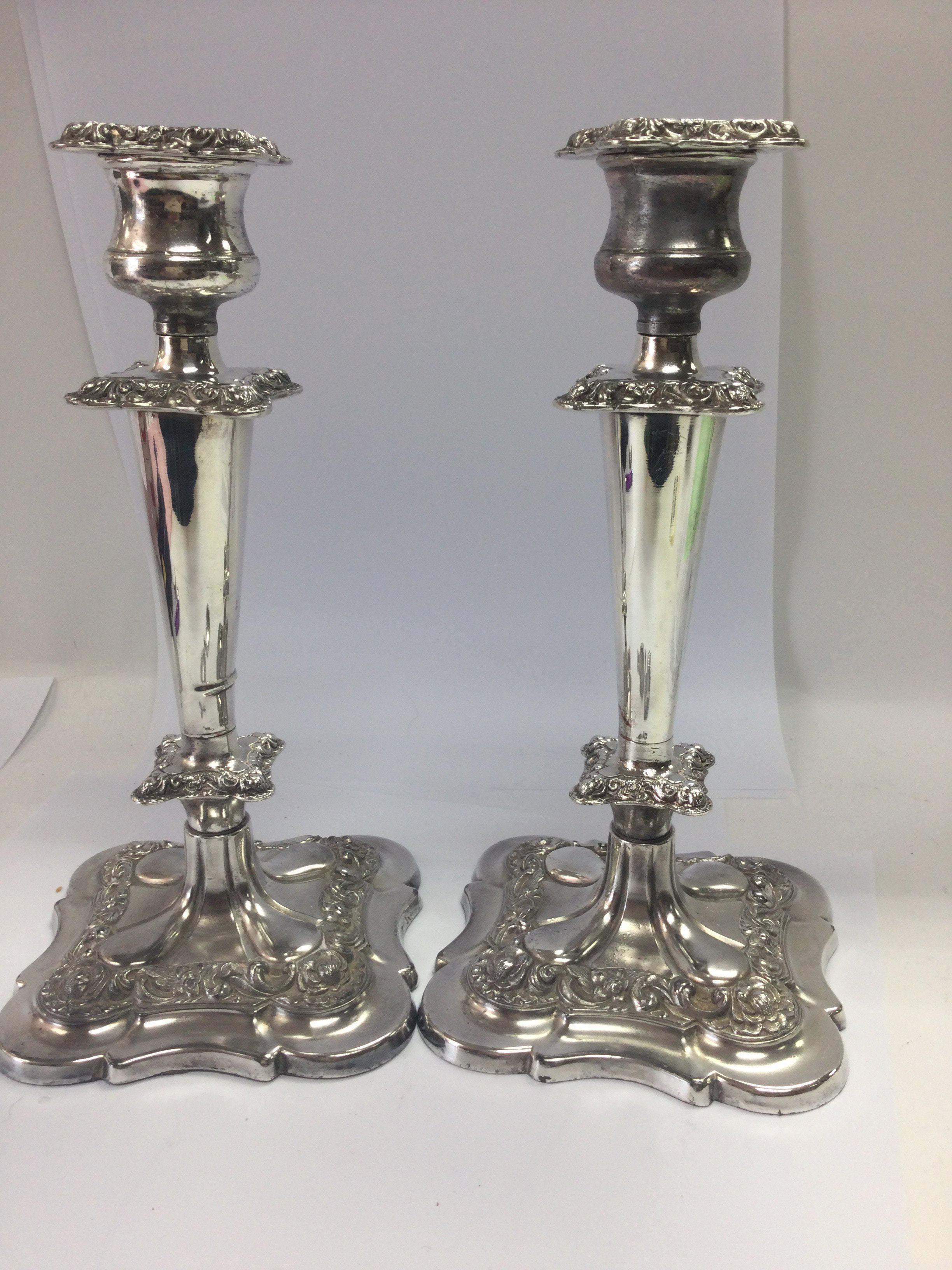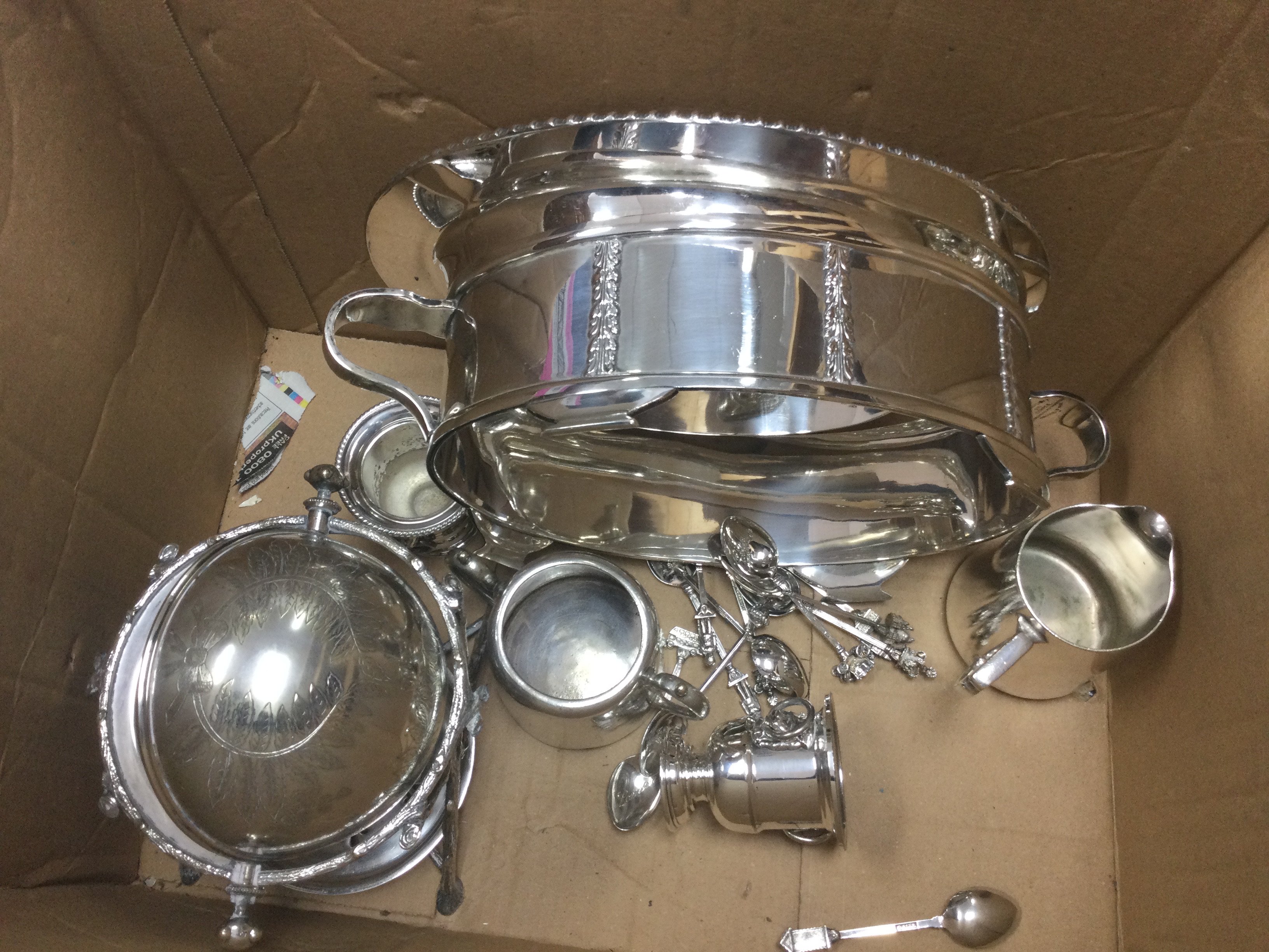 A box of silver plated ware including a pair of candle sticks and two silver wine labels.