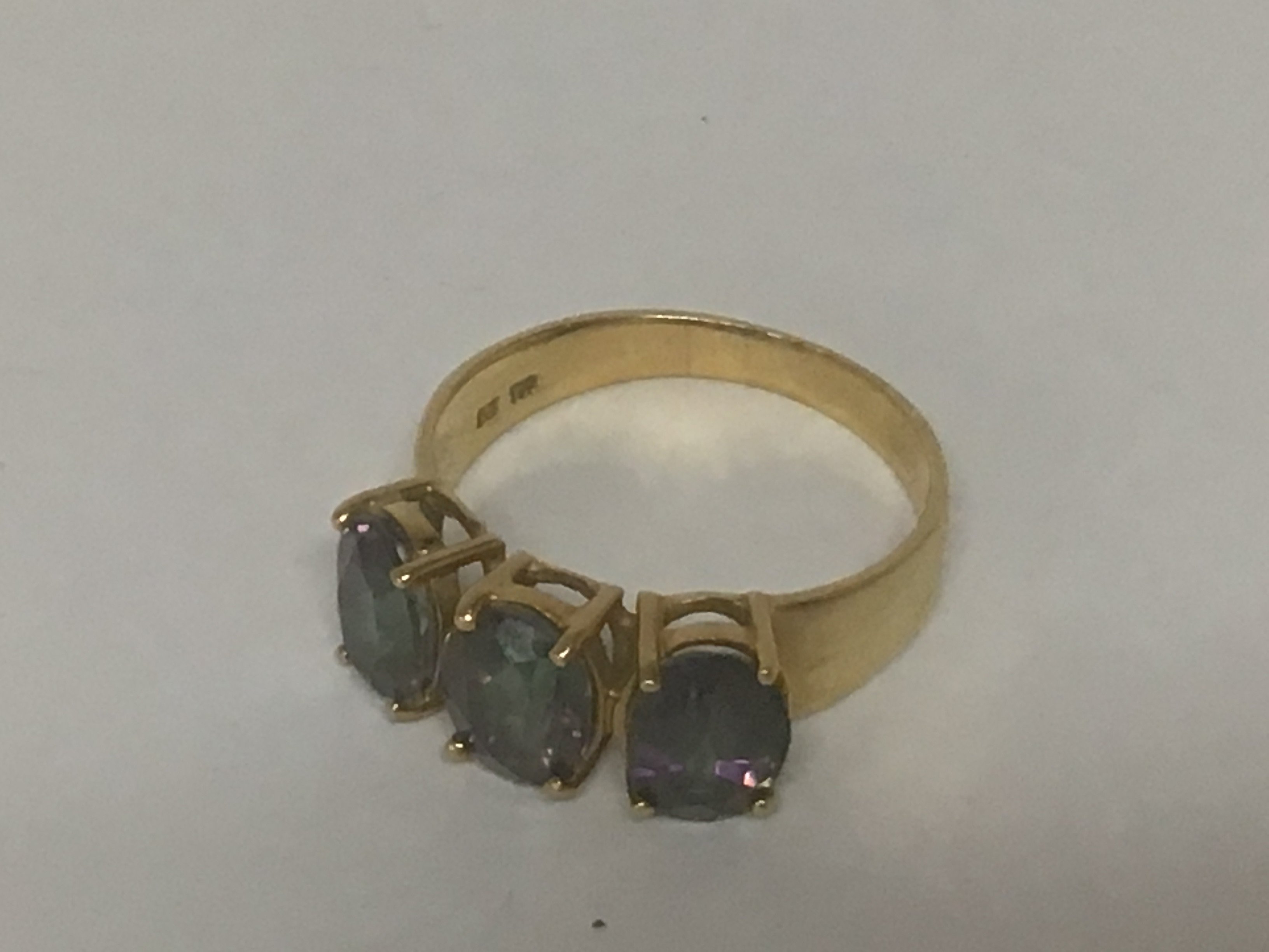 An 18carat gold ring set with three oval cut stones. Ring size R weight 4.5g approximately.