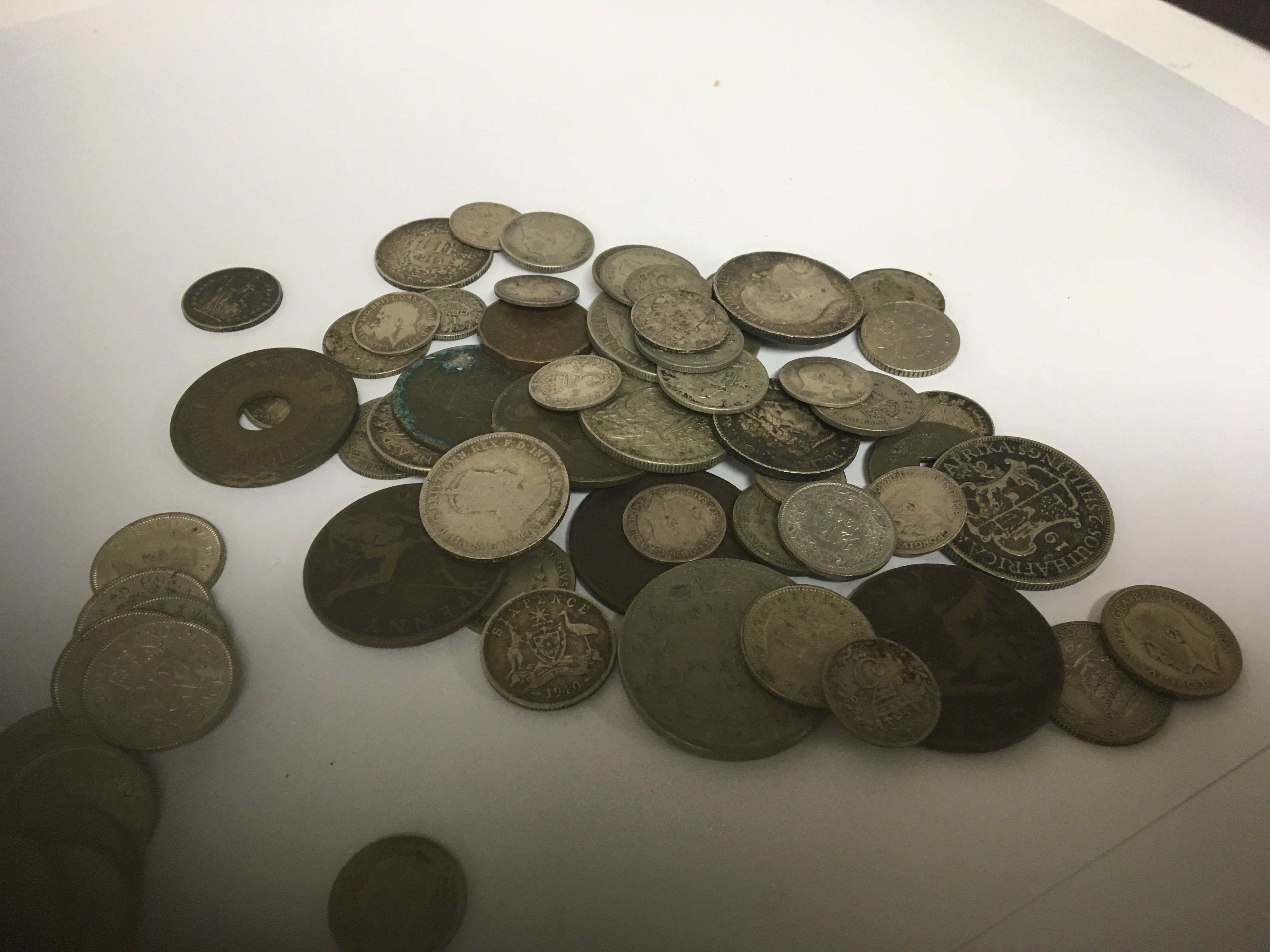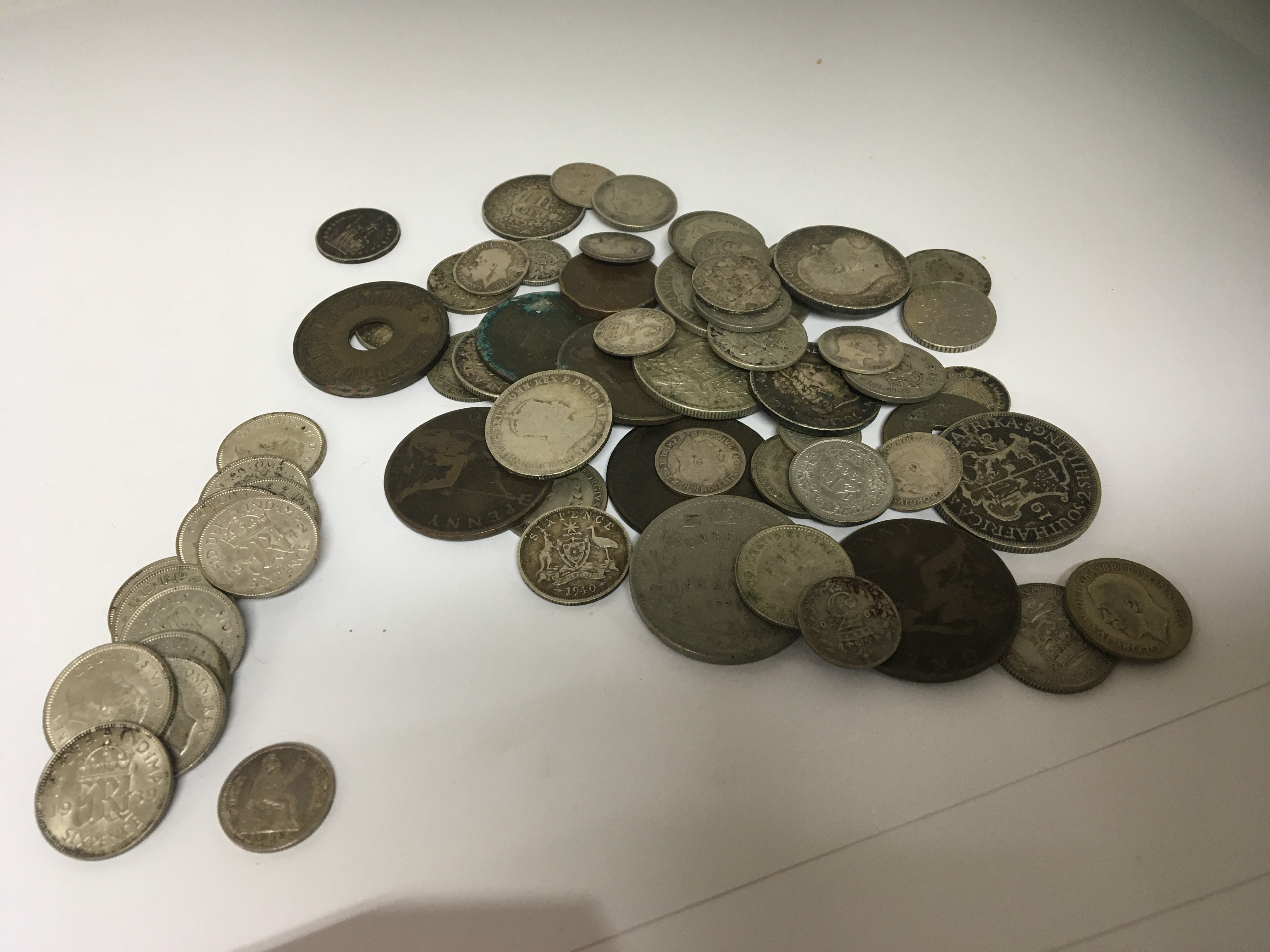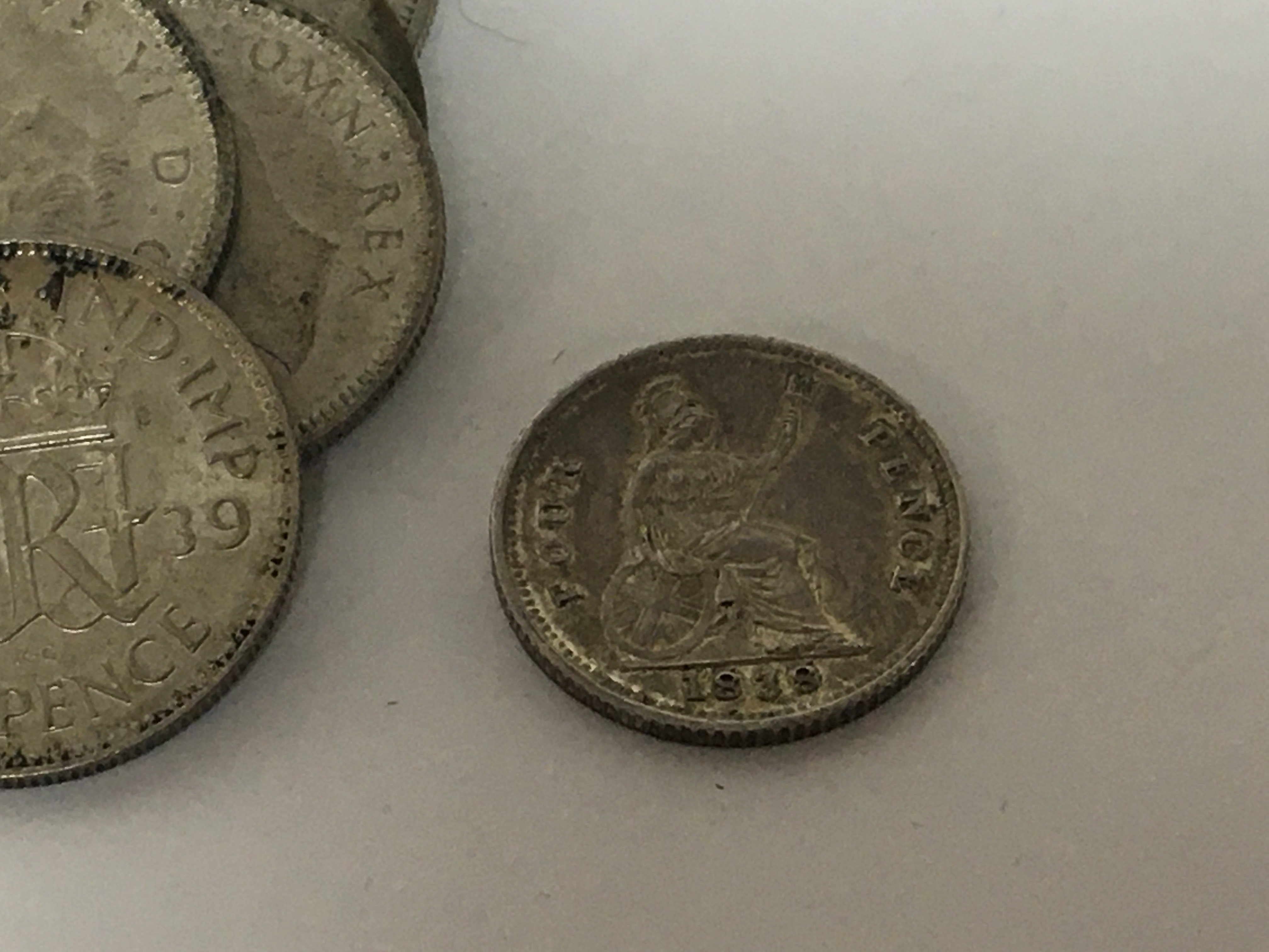 A collection of coins including a Victorian 1838 silver four pence with good definition a collection of George VI pre 1946 three pence possible uncirculated very good definition and a quantity of other mixed coins.