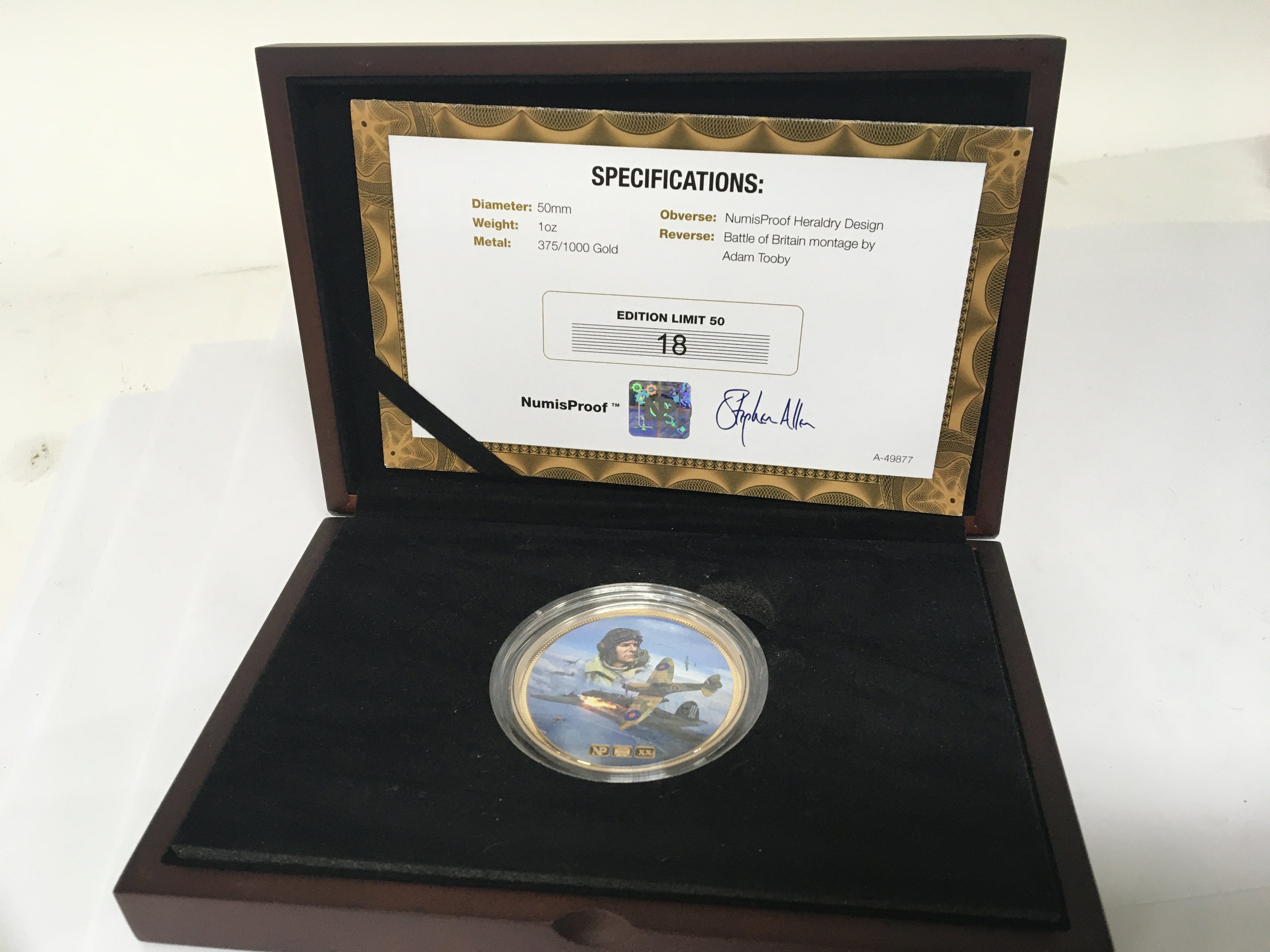 A 9carat gold one ounce Battle of Britain enamel decorated coin 18/50 with certificate of Authenticity in a fitted box.