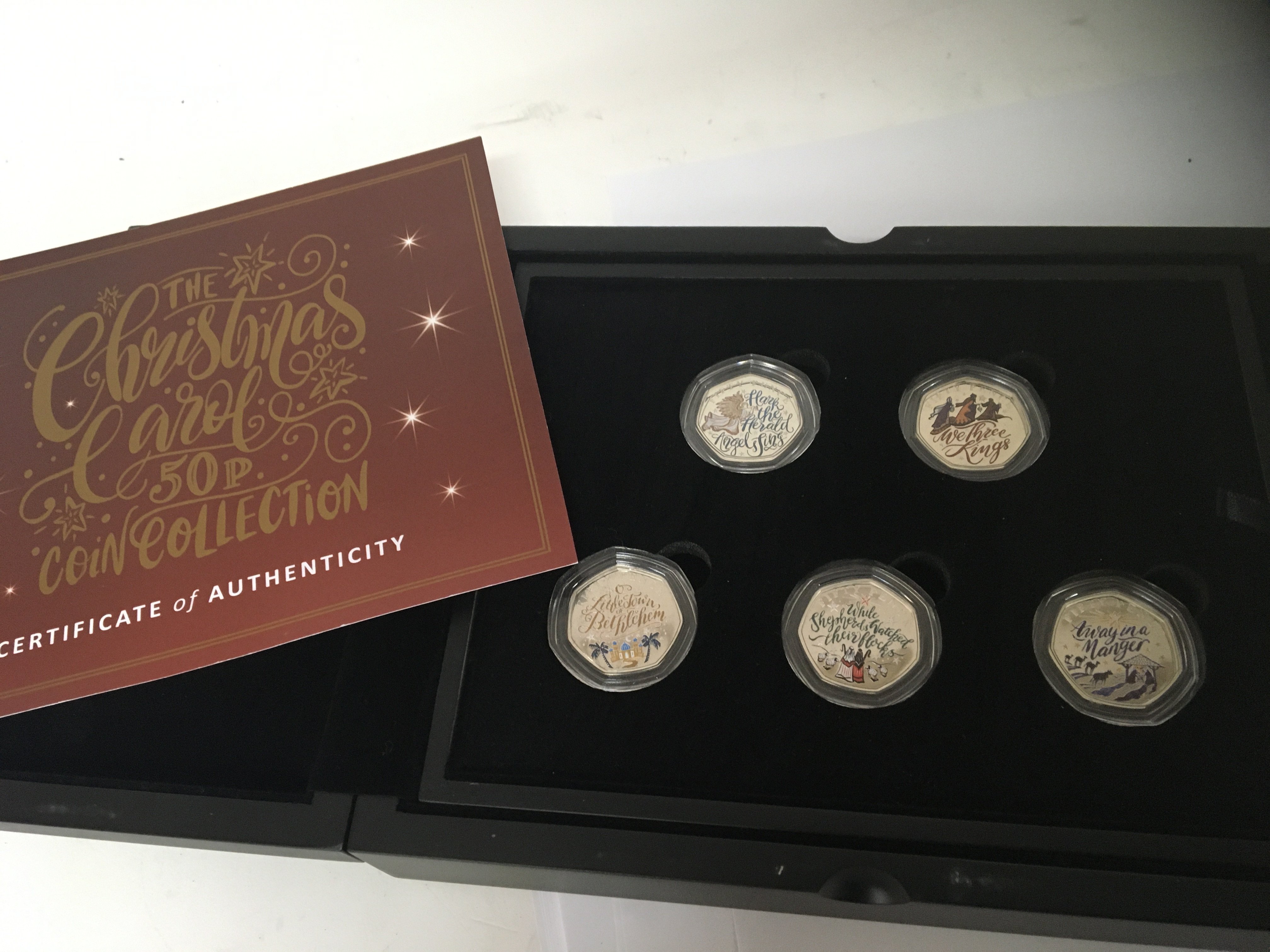 A cased set of silver Christmas Carol 50 pence coin collection. Five coins with certificate of Authenticity in a fitted box.