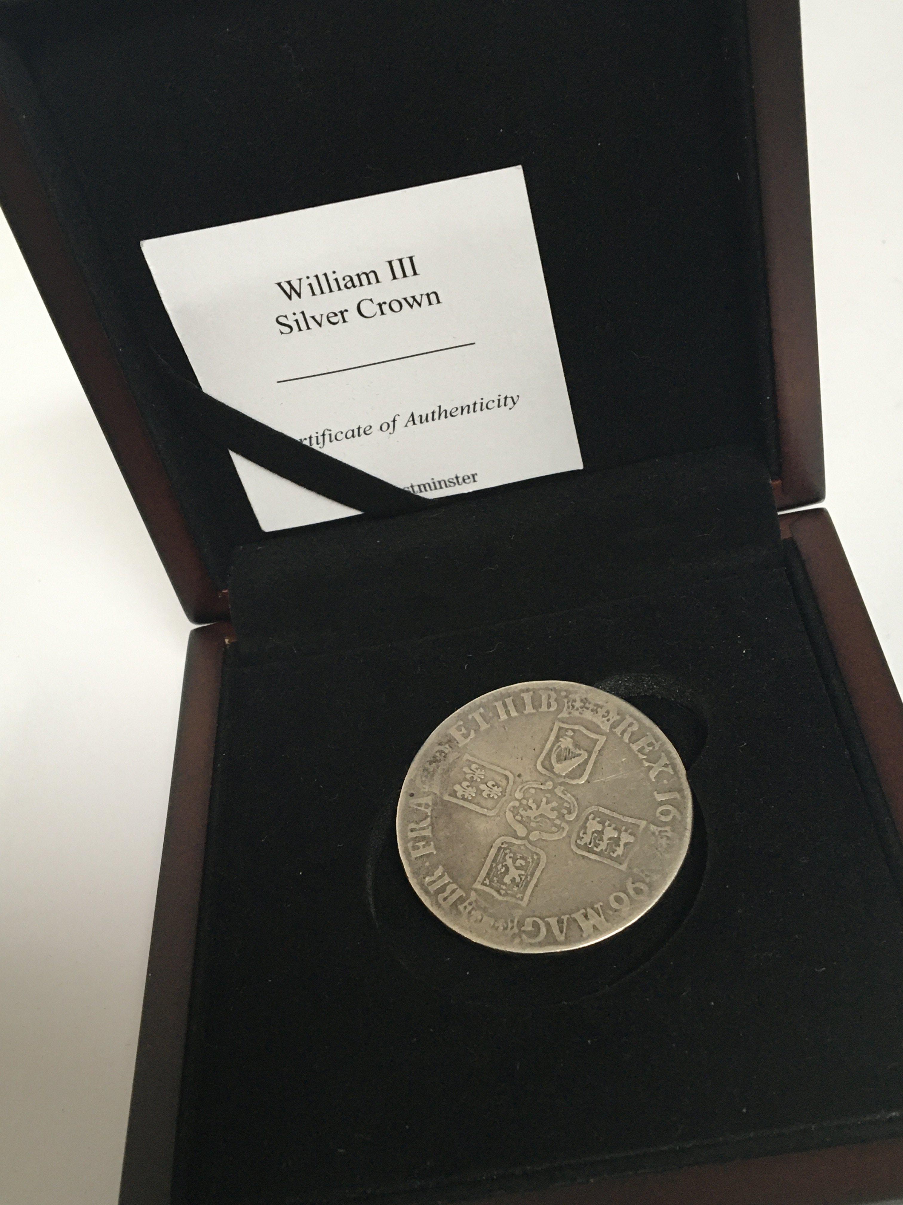 A William III 1695-1700 Silver Crown with certificate of Authenticity.