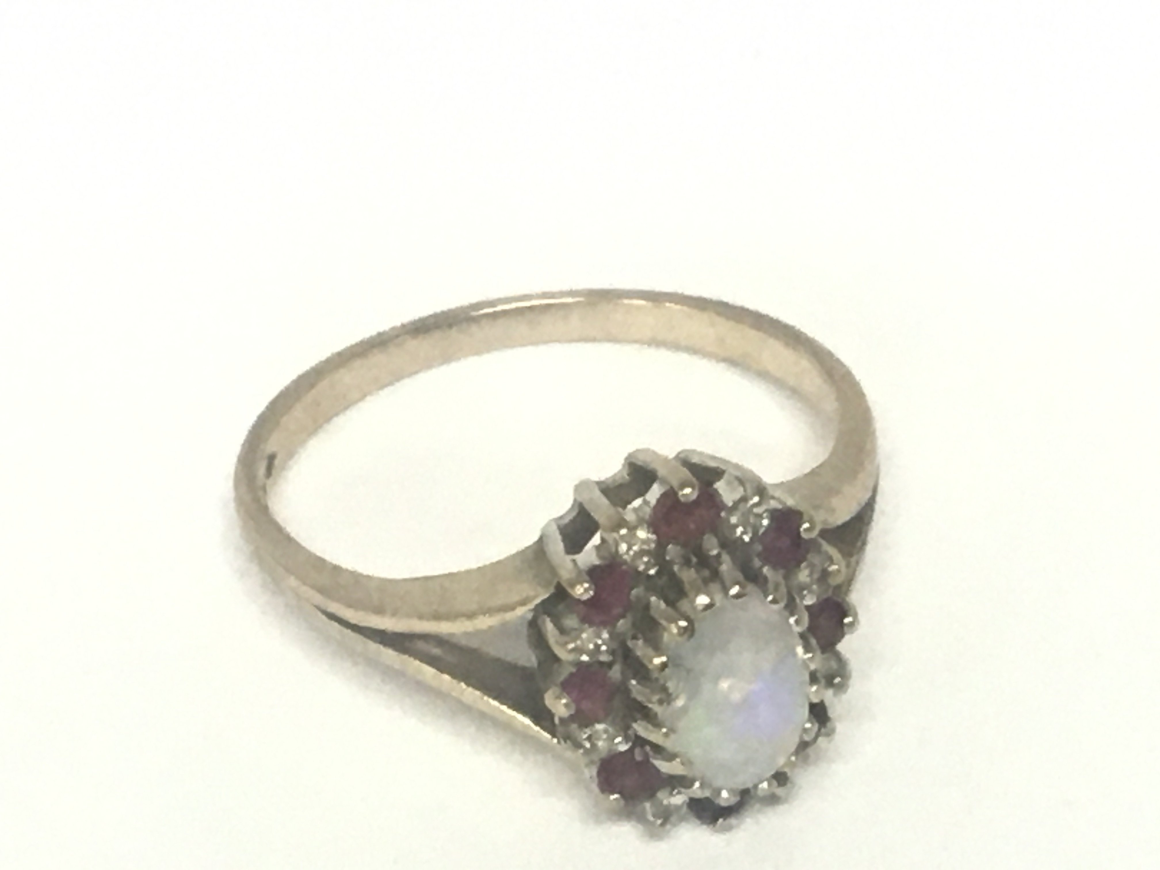 A 9carat gold ring set with an oval Opal flanked by further stones. Weight 2.4g ring size P.