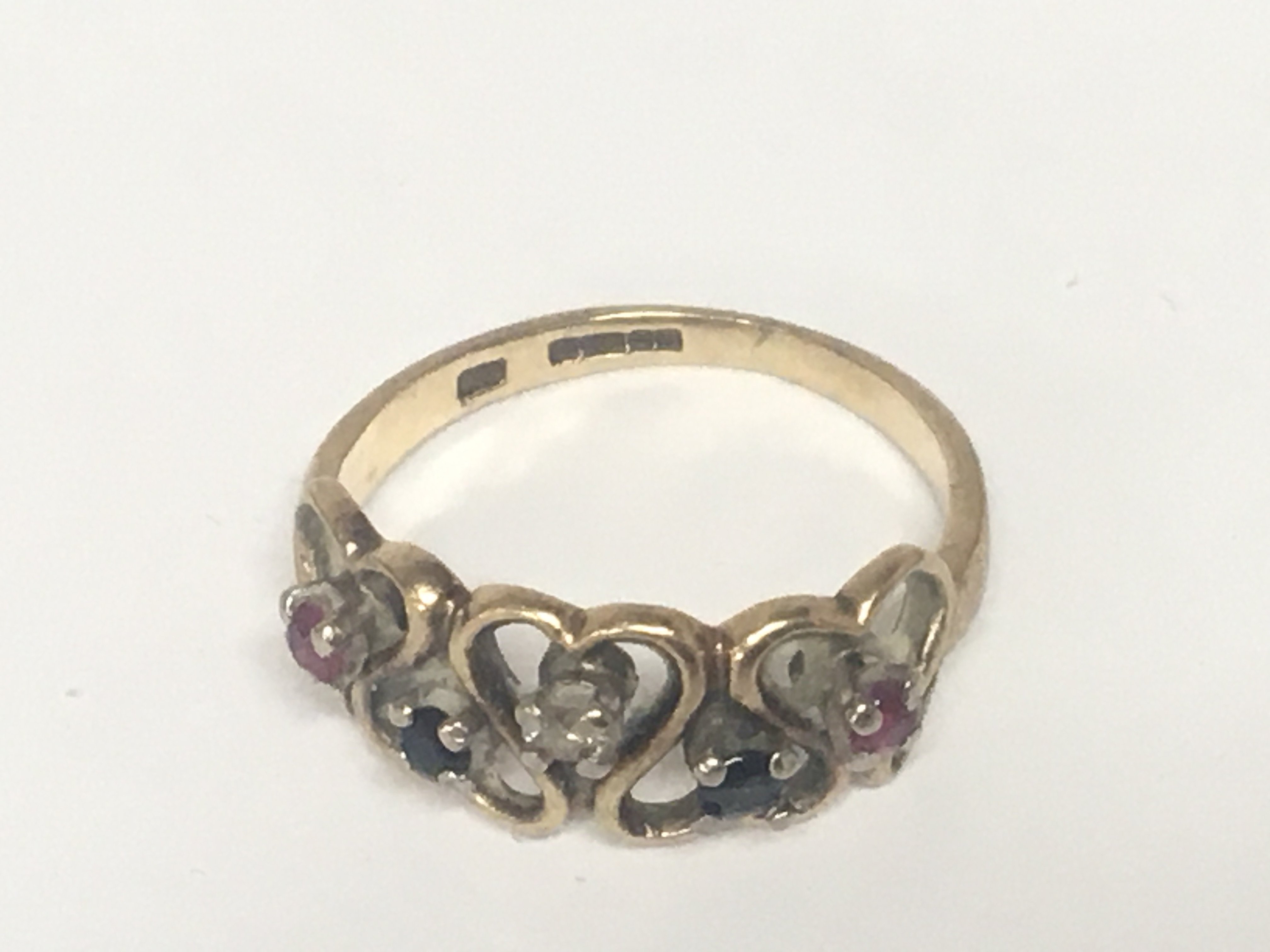 A 9carat gold ring set with a pattern of small ruby sapphire and diamond.