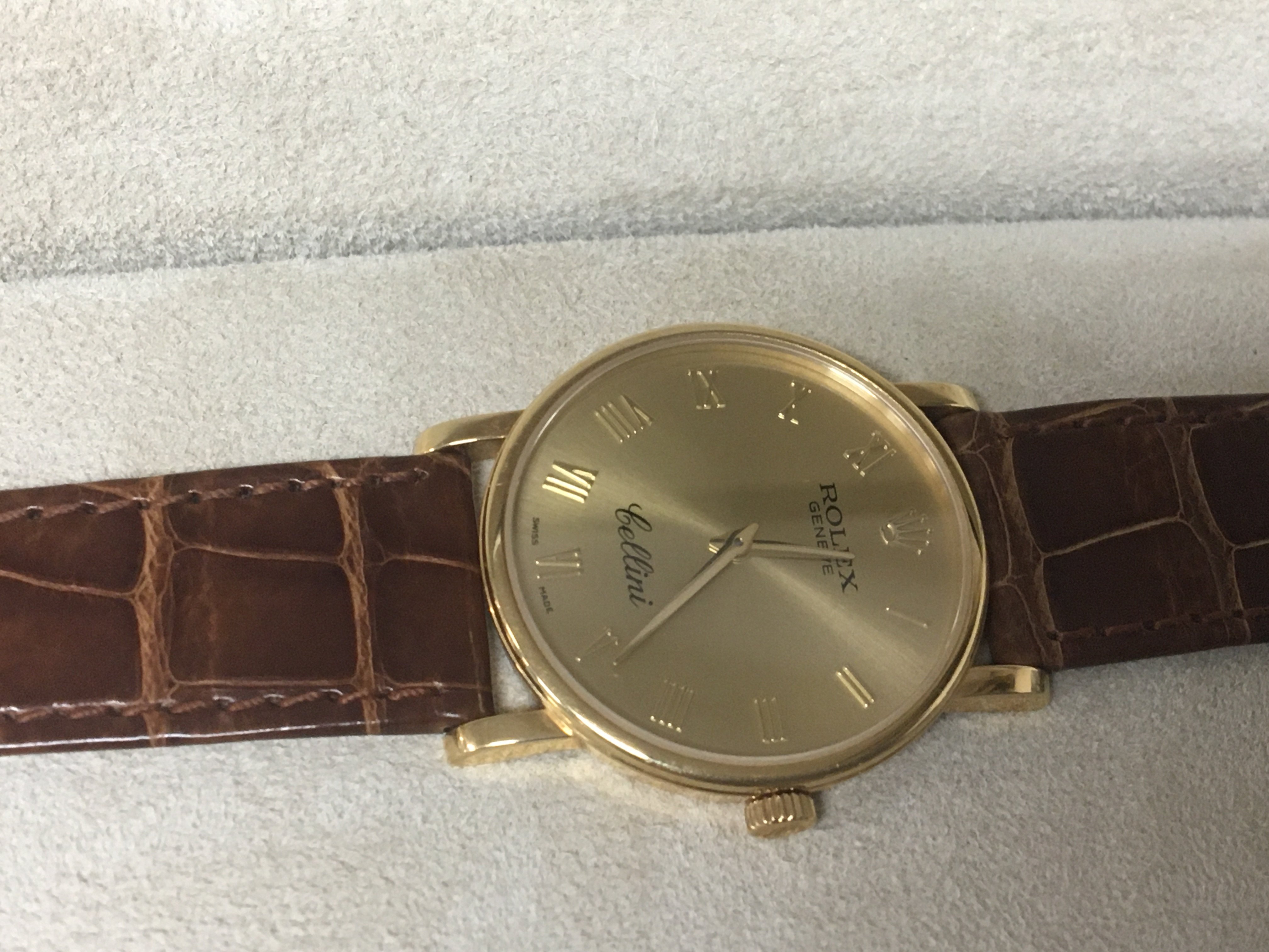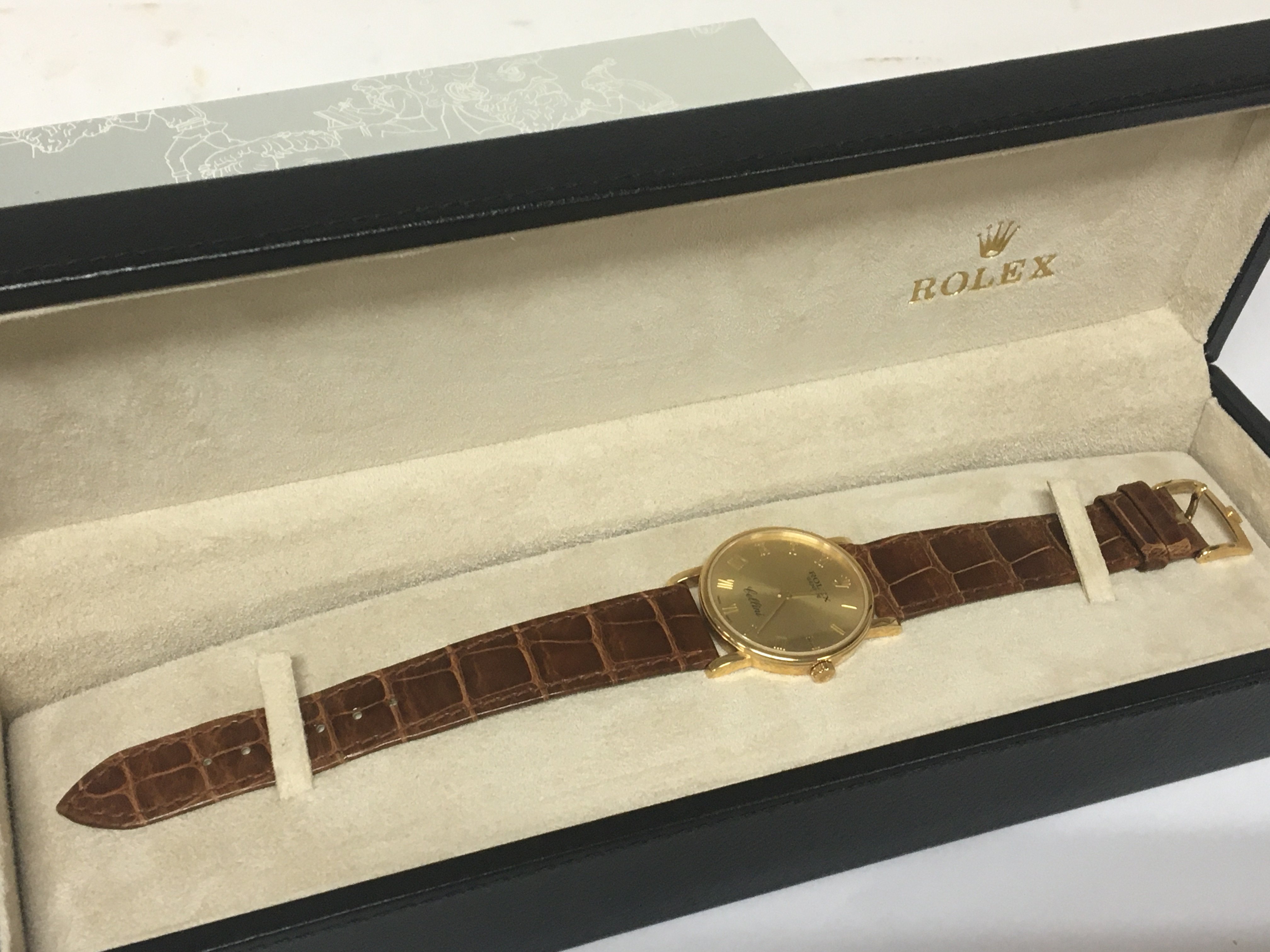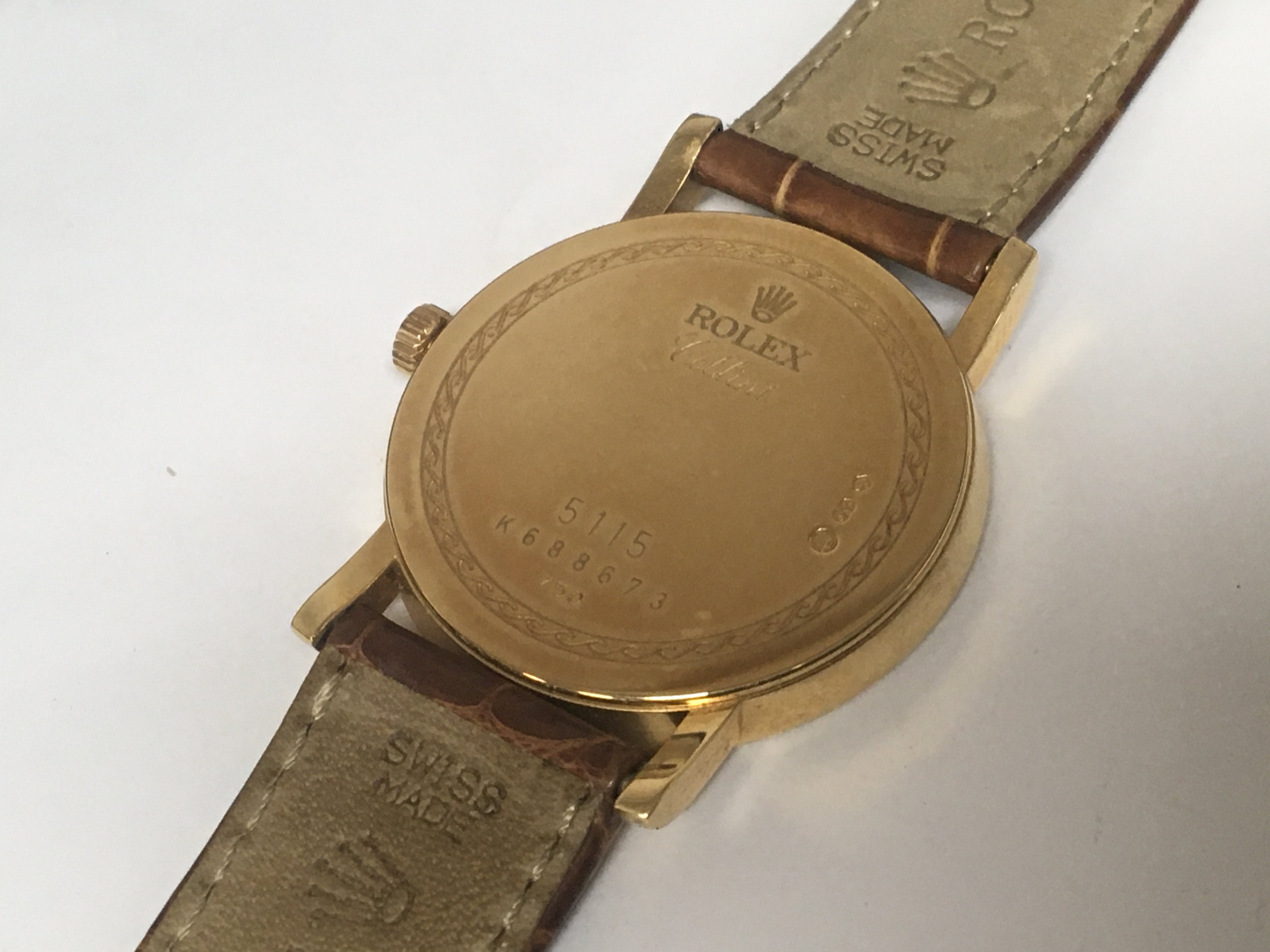 A Rolex watch 18carat gold cased Cellini with Rolex leather strap very lightly worn seen working a few minor scratches in Rolex box with paperwork serial number K688573 model 5115 with leather wallet Rolex Cellini mini brochure and outer box.