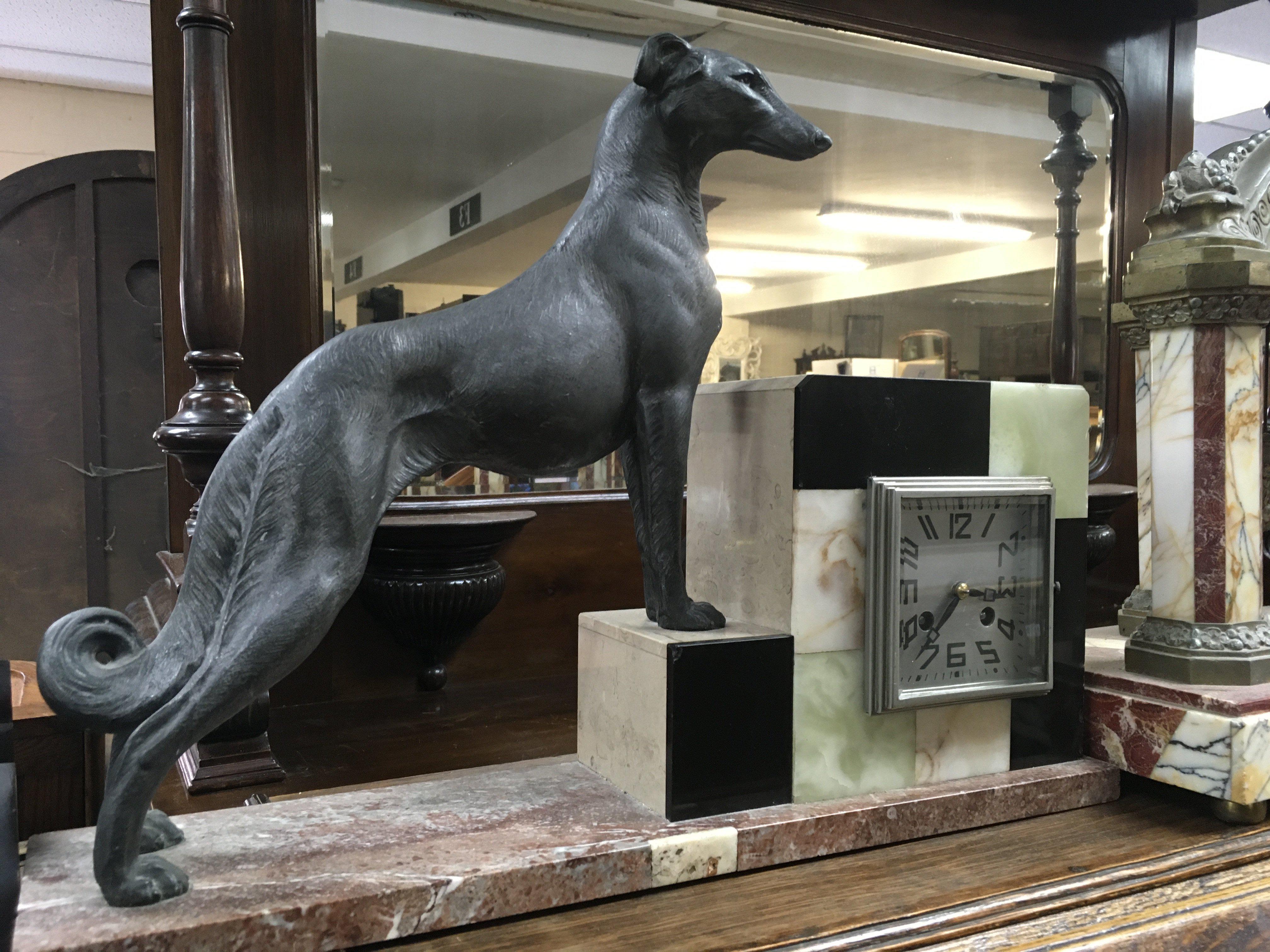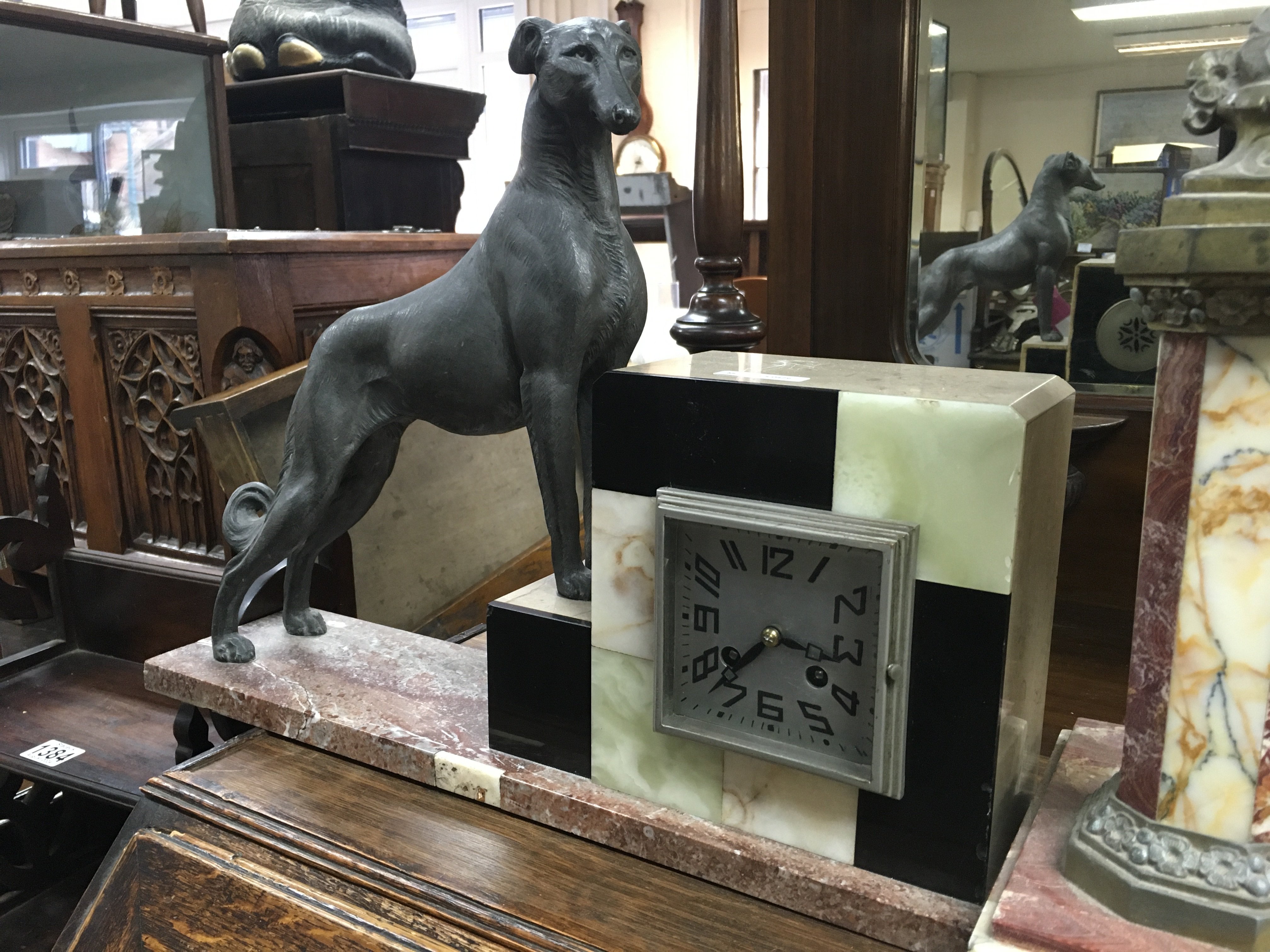 A Art Deco mantel clock the square dial flanked by a dog on a pink marble Base .49 x 36 cm