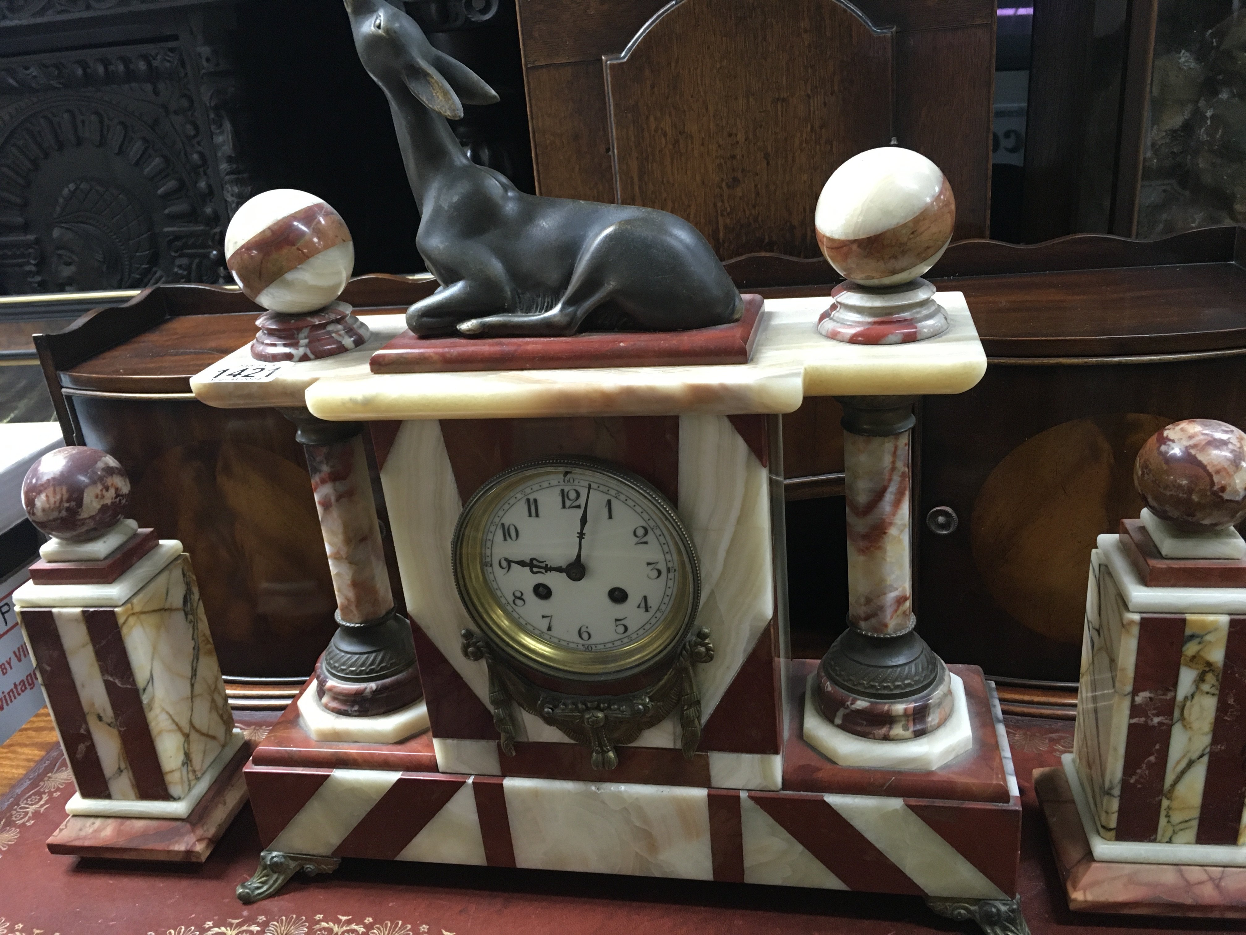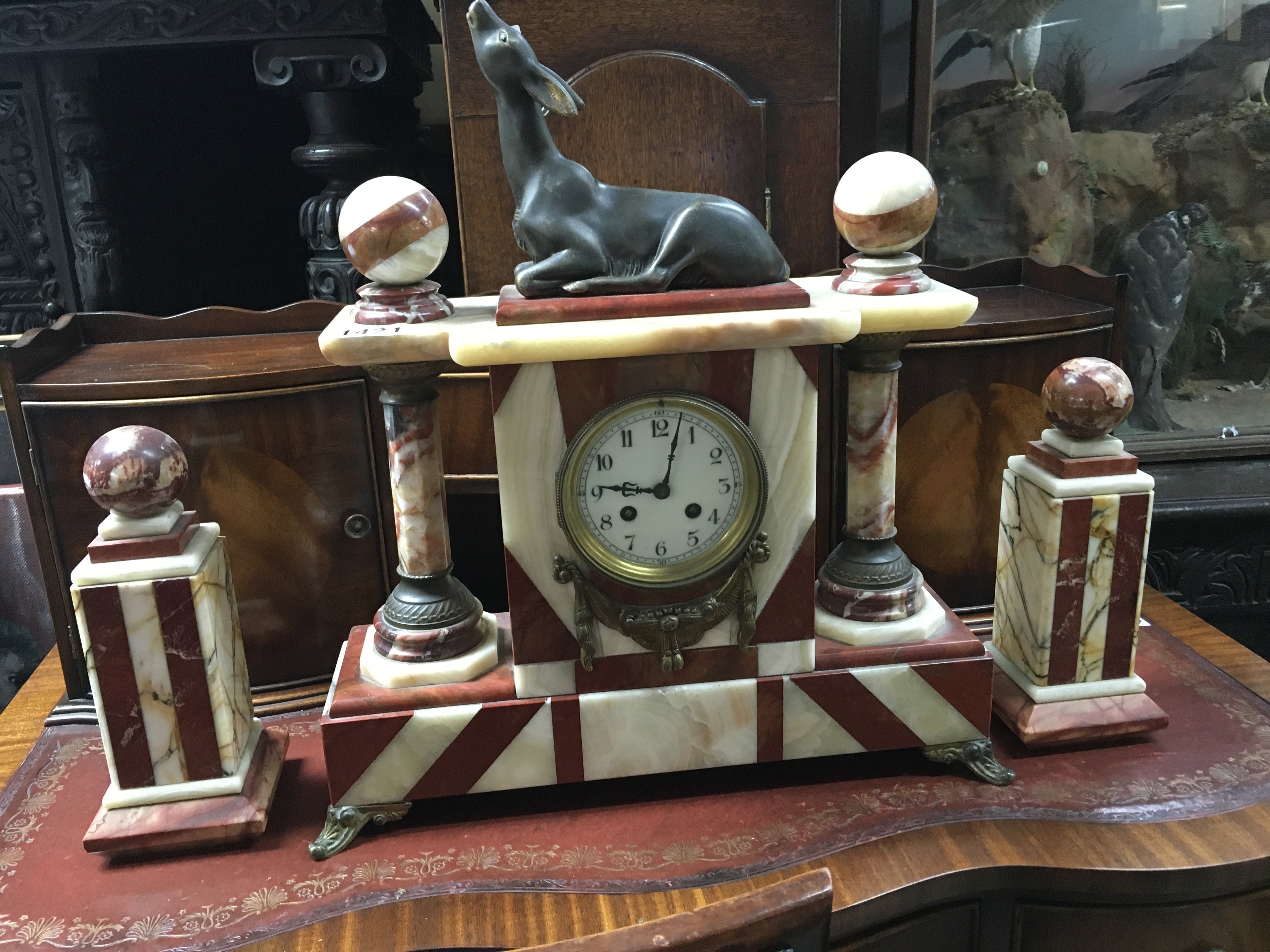 A Art Deco red and green marble mantel clock garniture cthe circular dial with Arabic numerals the top surmounted with a deer .40 x 48 cm .