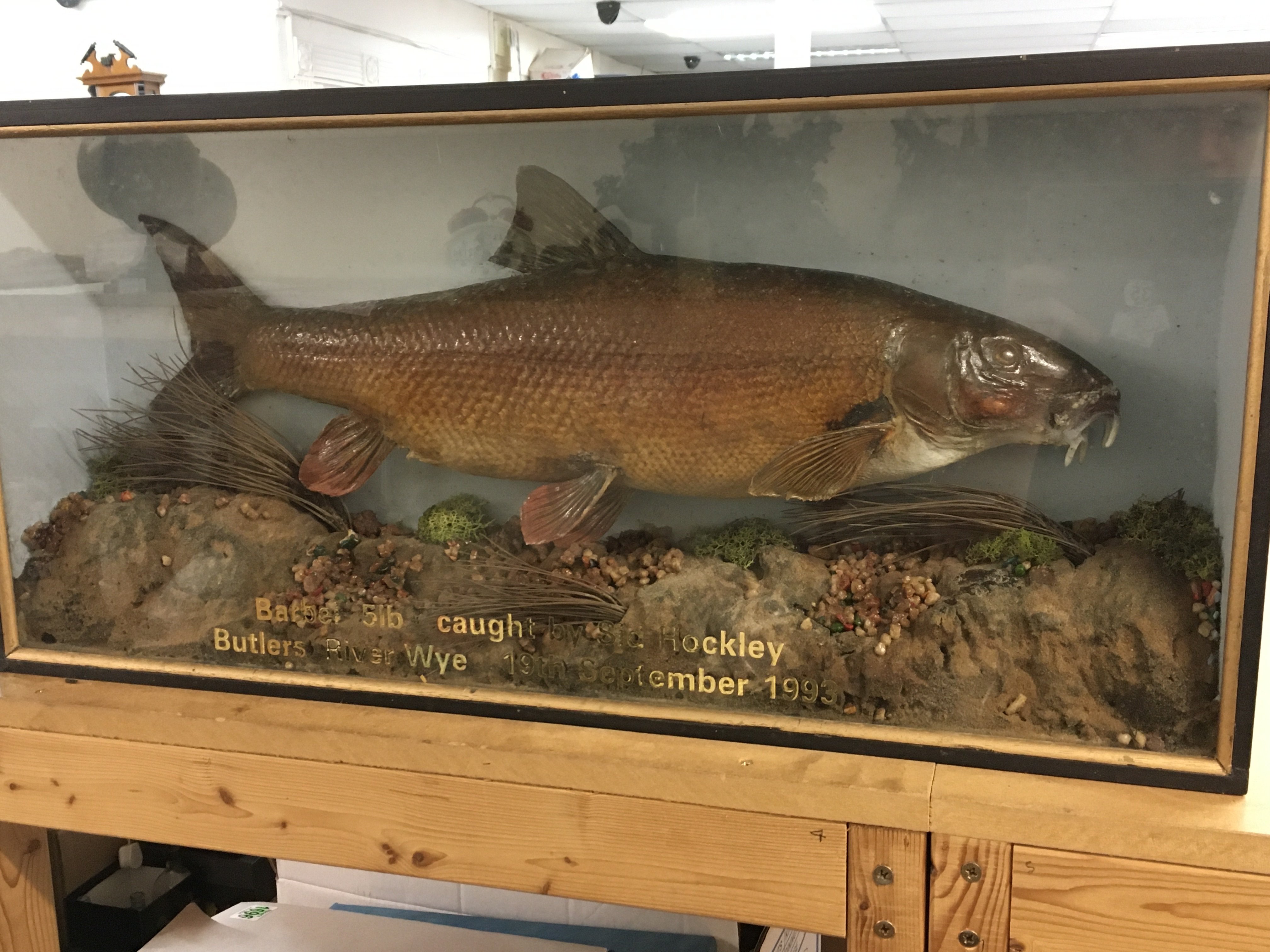 A cased taxidermy Barbel fish with lettering, Barbel 5lb caught by Sid Hockley Butlers River Wye 19th September 1993. Case dimensions 12x70x34cm
