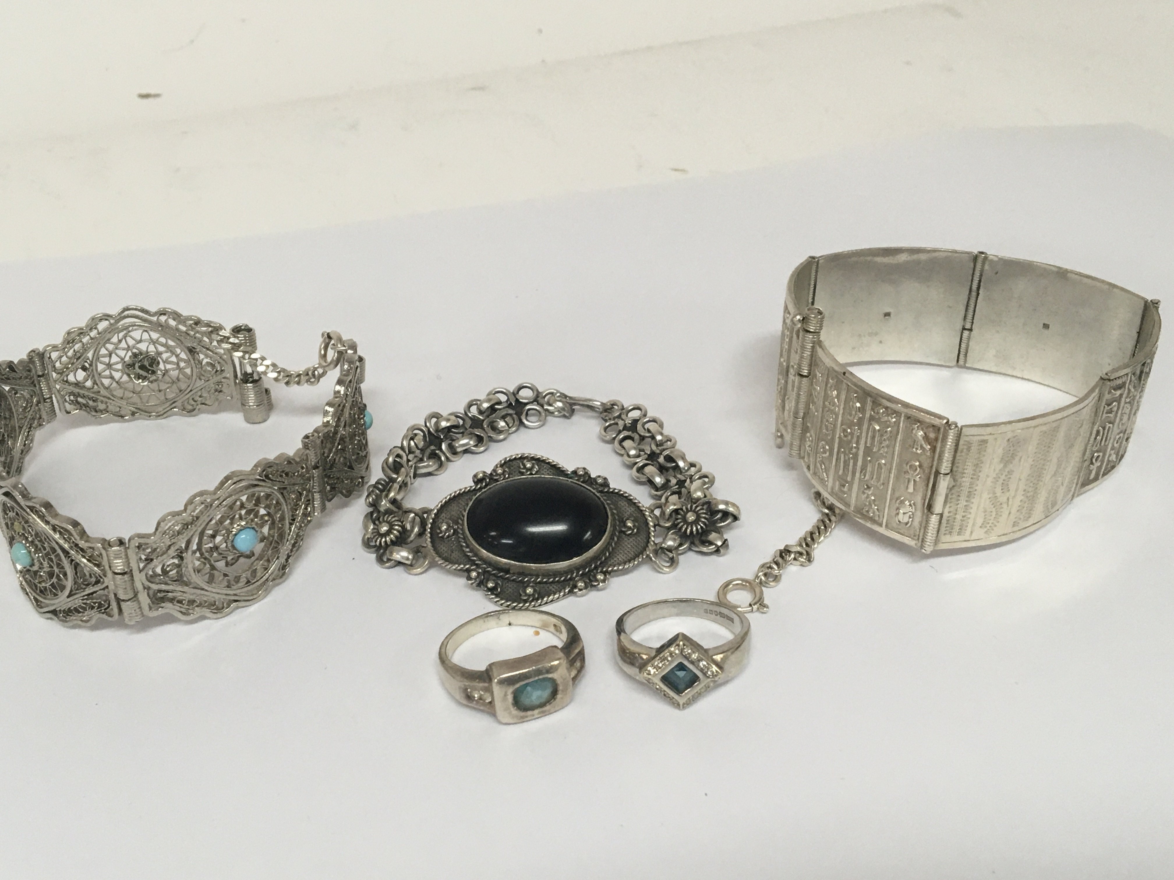 An Egyptian theme silver bracelet a filigree bracelet set with turquoise two silver rings and one other bracelet.