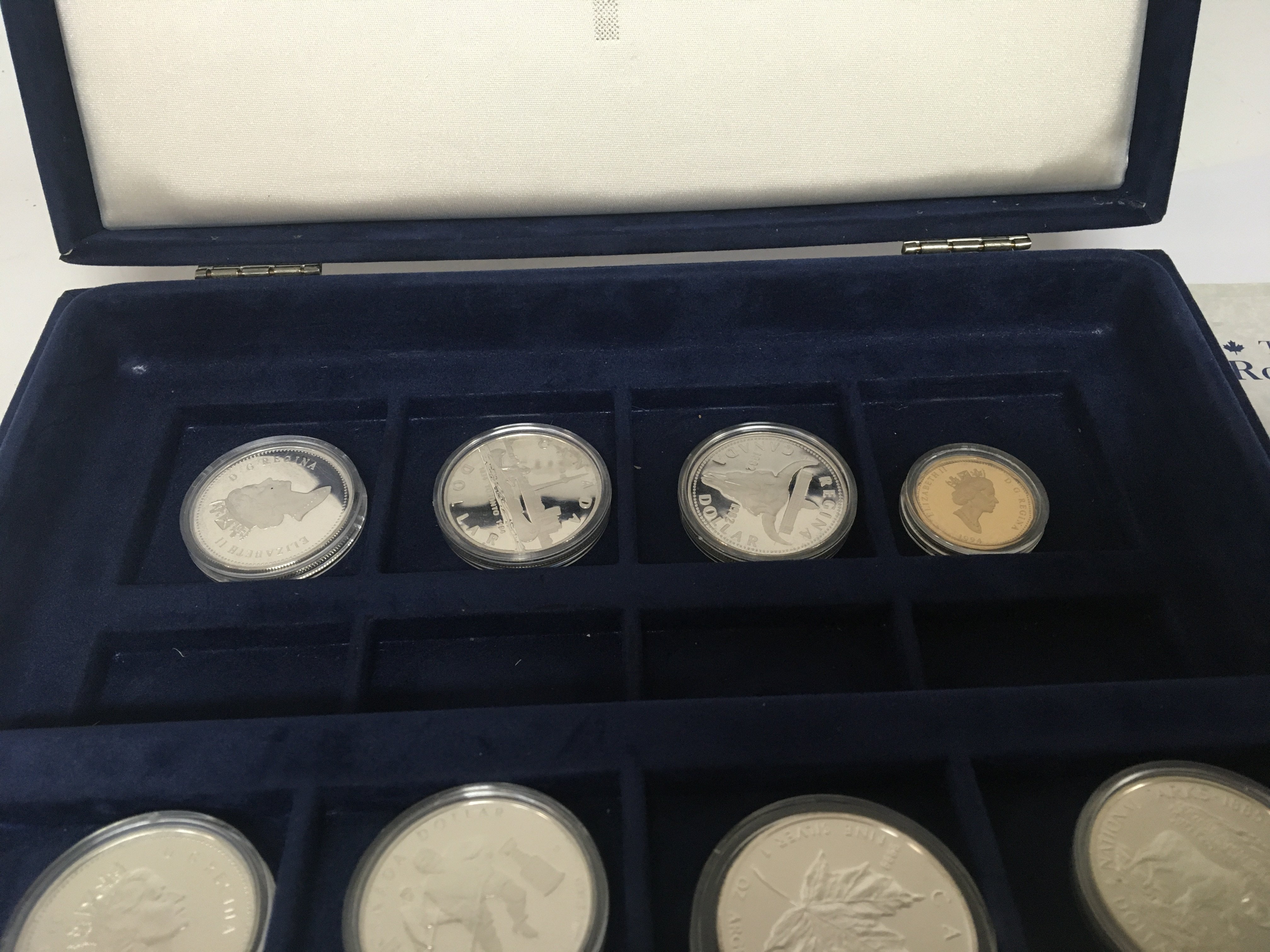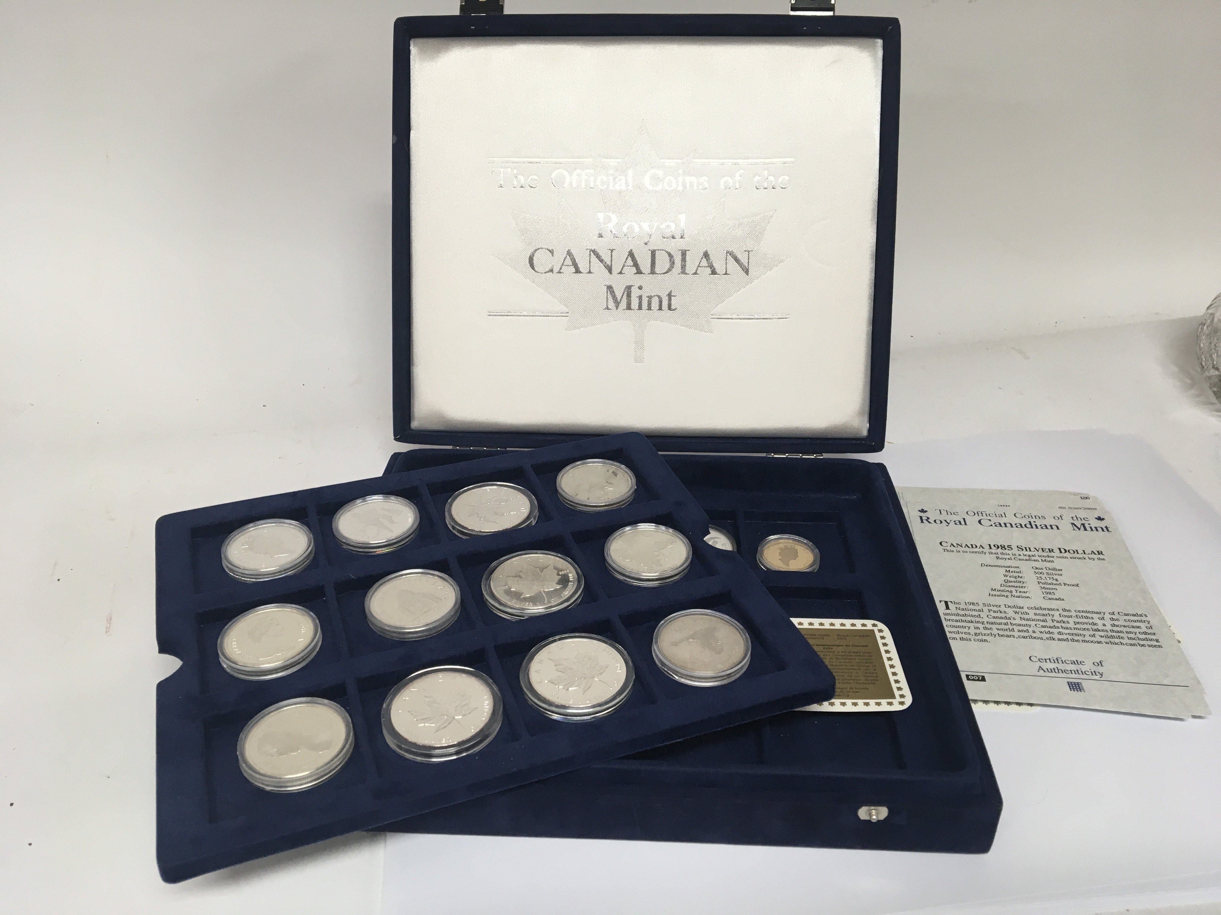 A Royal Canadian Mint silver dollar collection of coins (500) silver sixteen coins total with certificates in a fitted box.