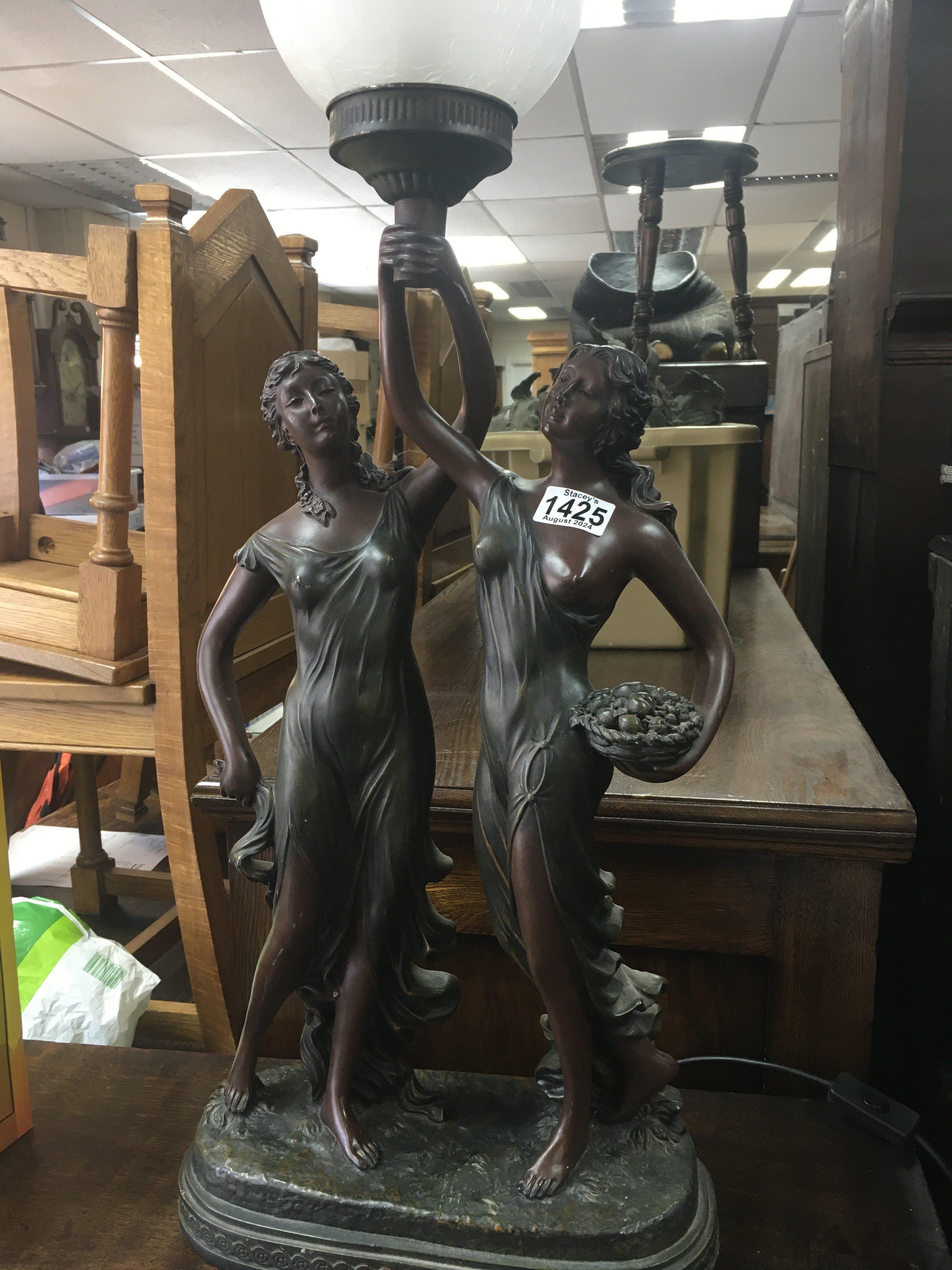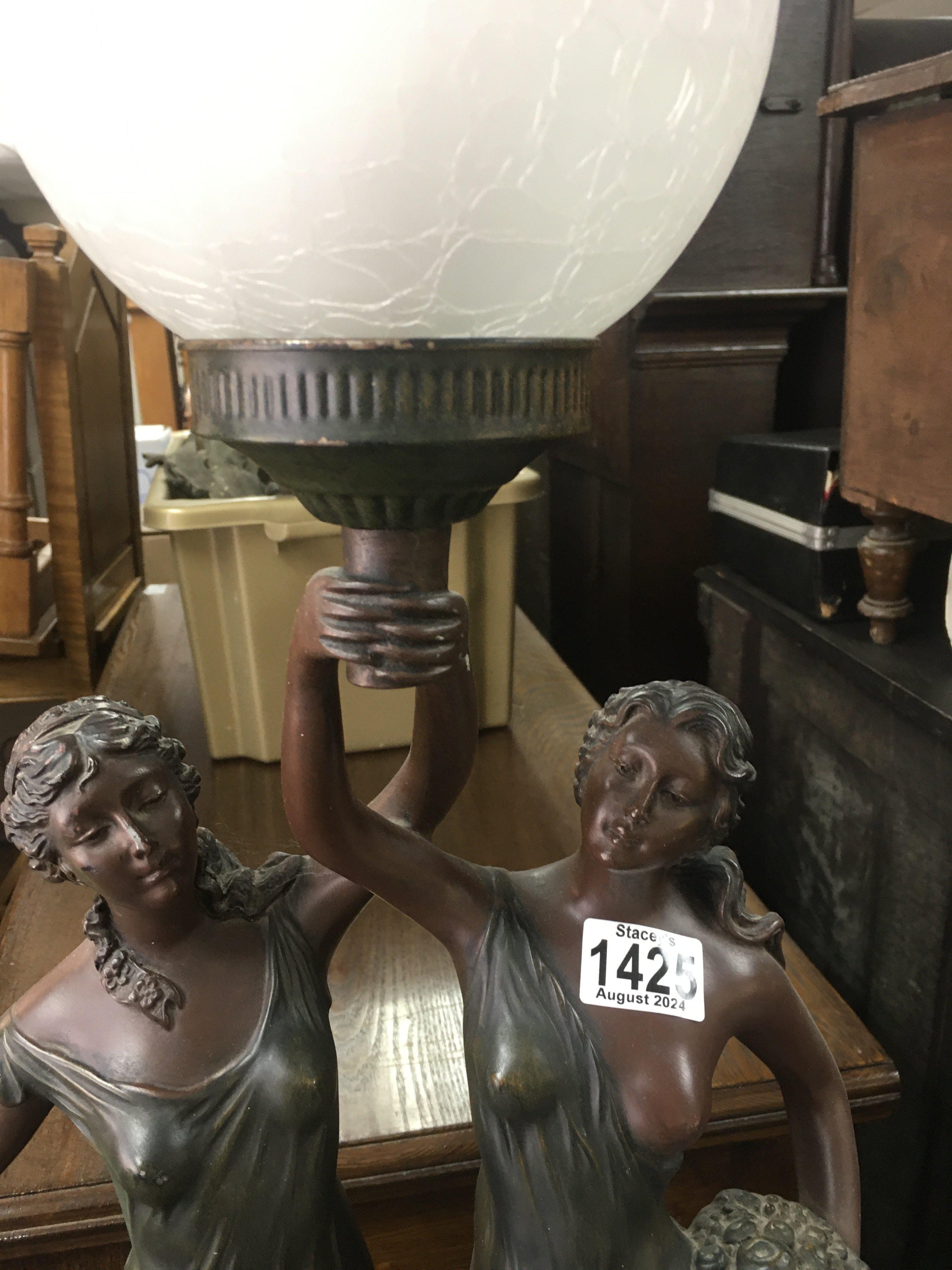 A modern lamp in the form of two classical maidens holding a frosted glass Shade .78 cm .