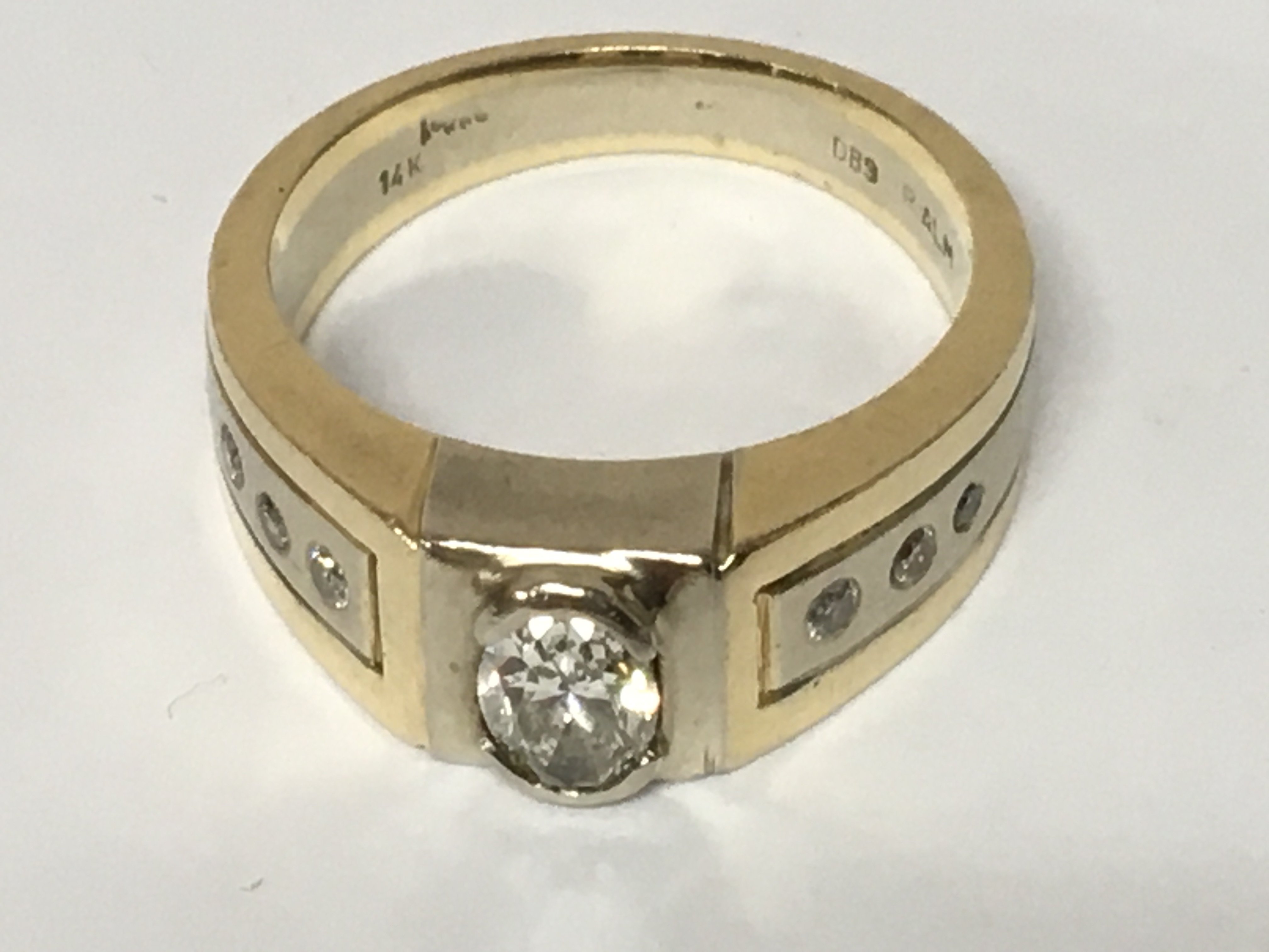 A Gents 14 carat gold watch set with a good size oval diamond flanked by small brilliant cut diamonds ring size V. Total weight 13g.