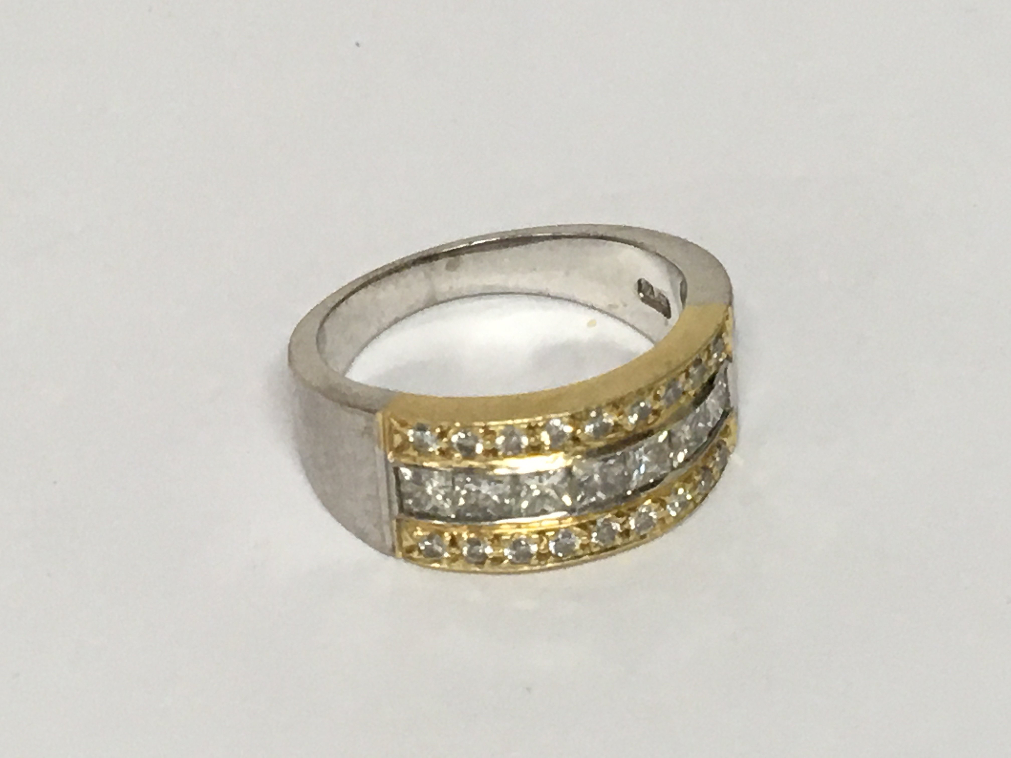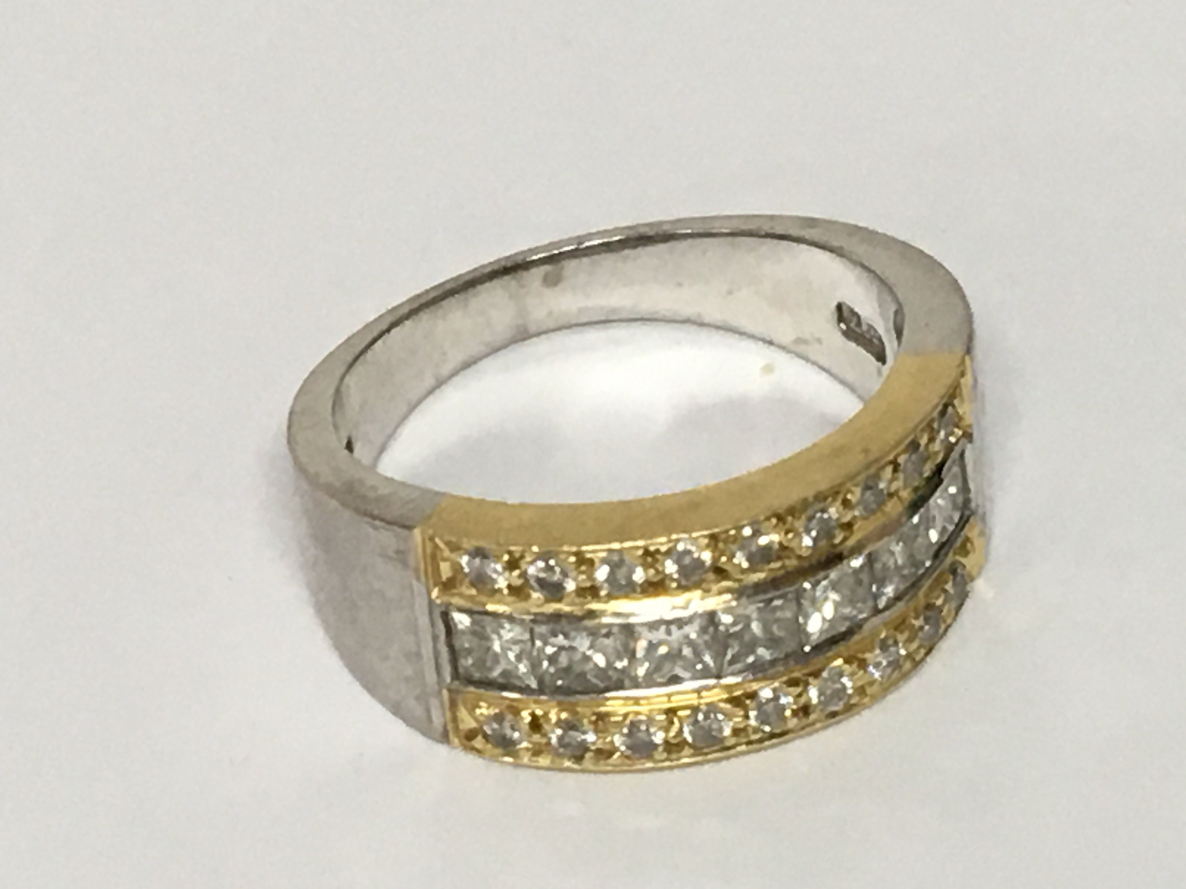 A ladies 14carat white and yellow gold ring pave set with diamonds flanked by two rows of small brilliant cut diamonds. Ring size N. Weight 9g