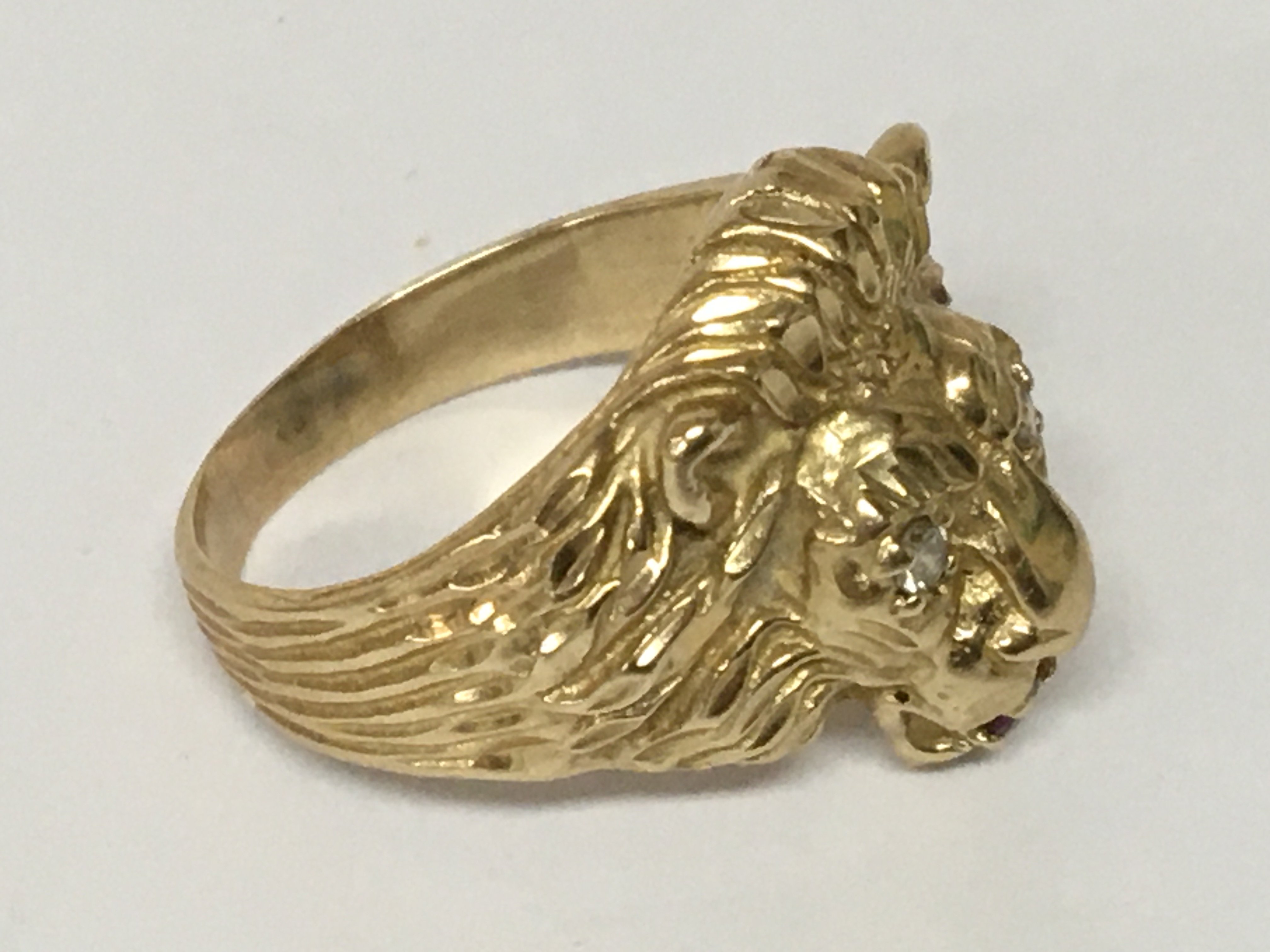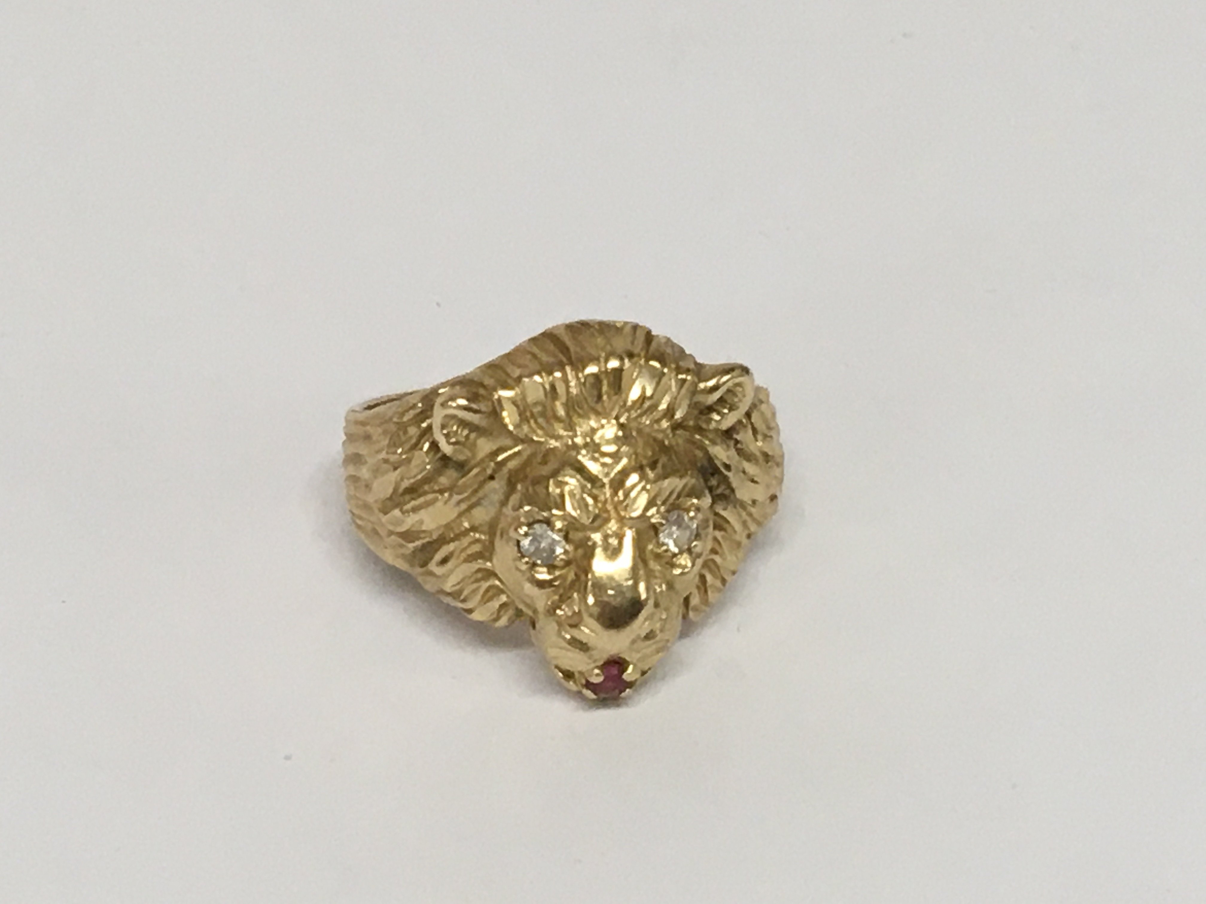 A 14carat gold ring in the form of a lions head the eyes brilliant cut diamonds and ruby mouth ring size V weight 13g