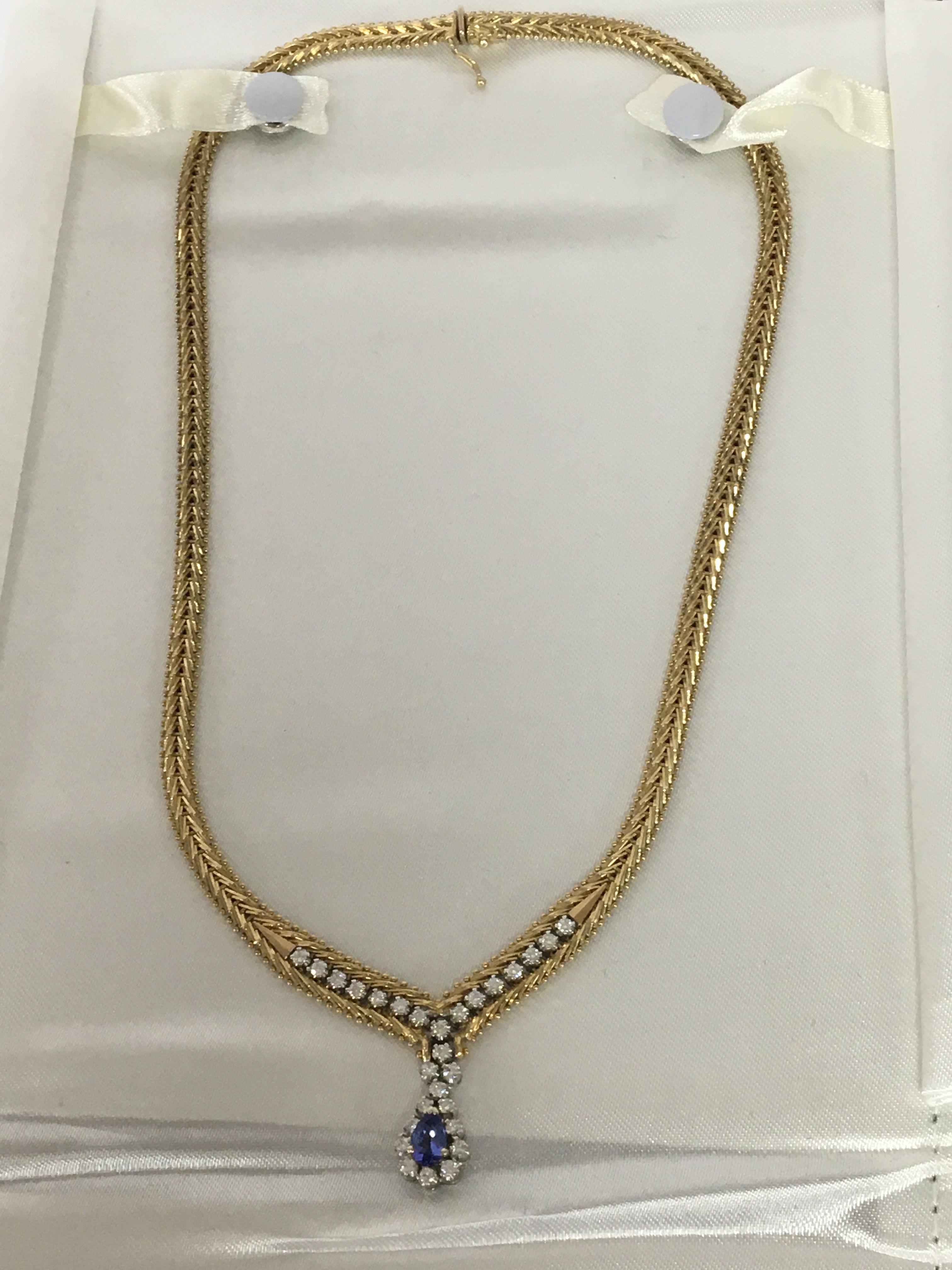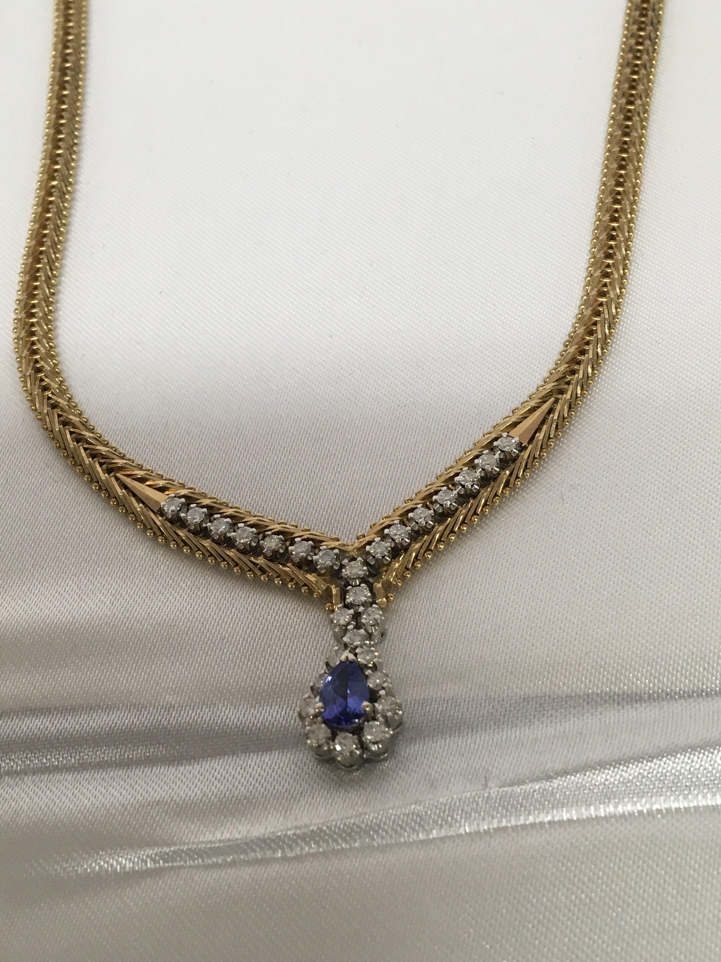A Quality 14carat gold ladies necklace set with a pear shaped Tanzanite flanked by brilliant cut diamonds. the necklace with further diamonds. Weight 37g