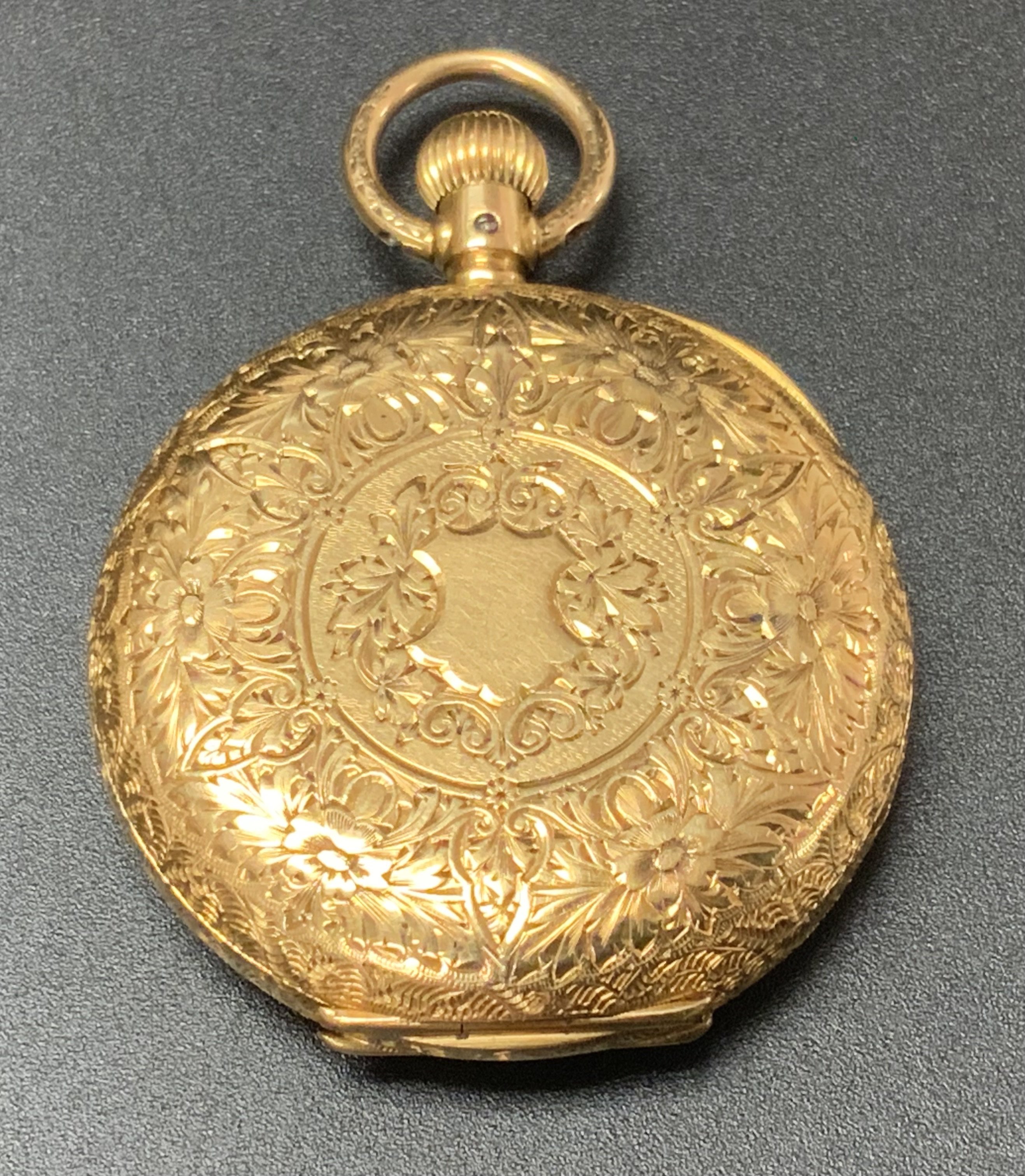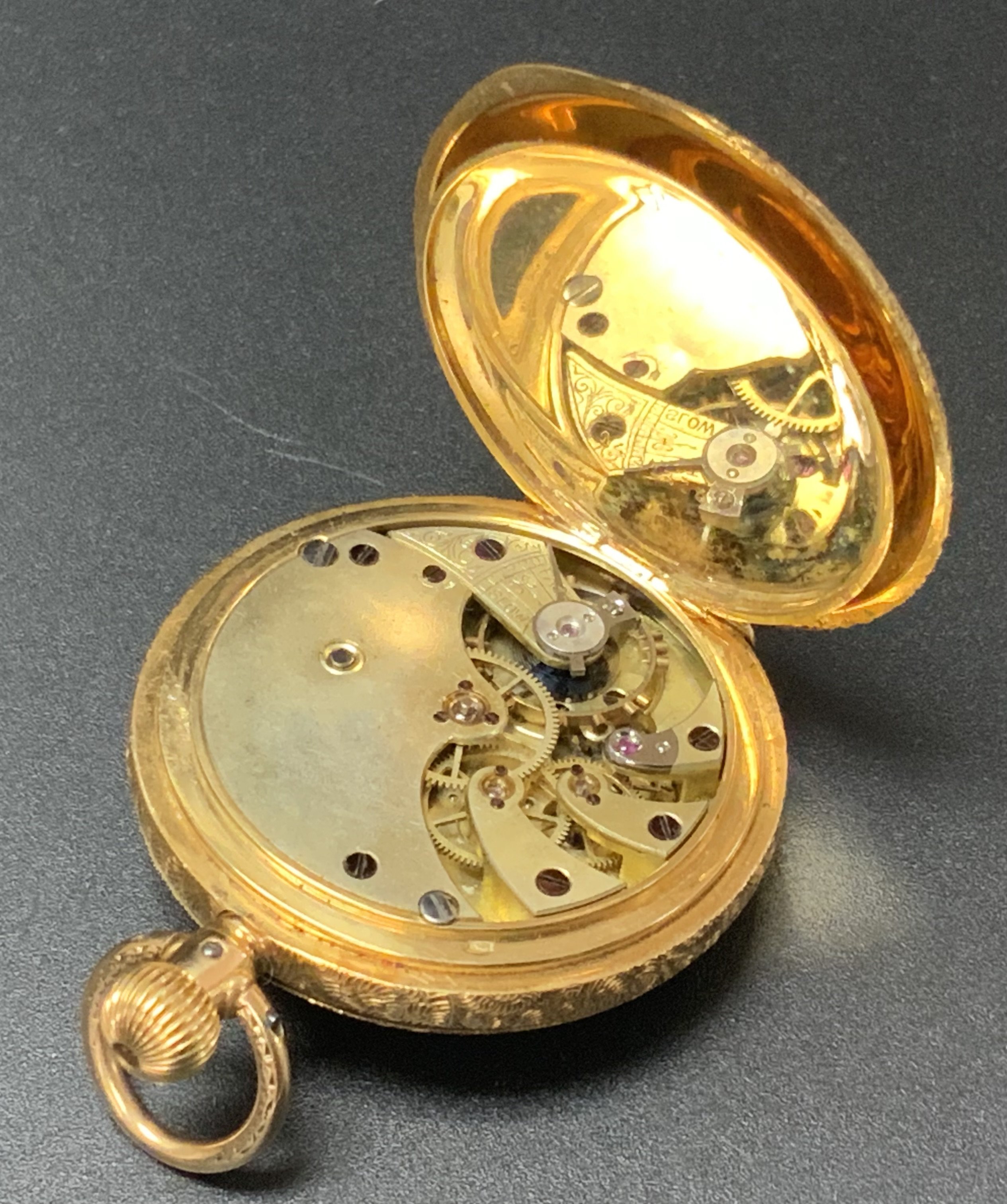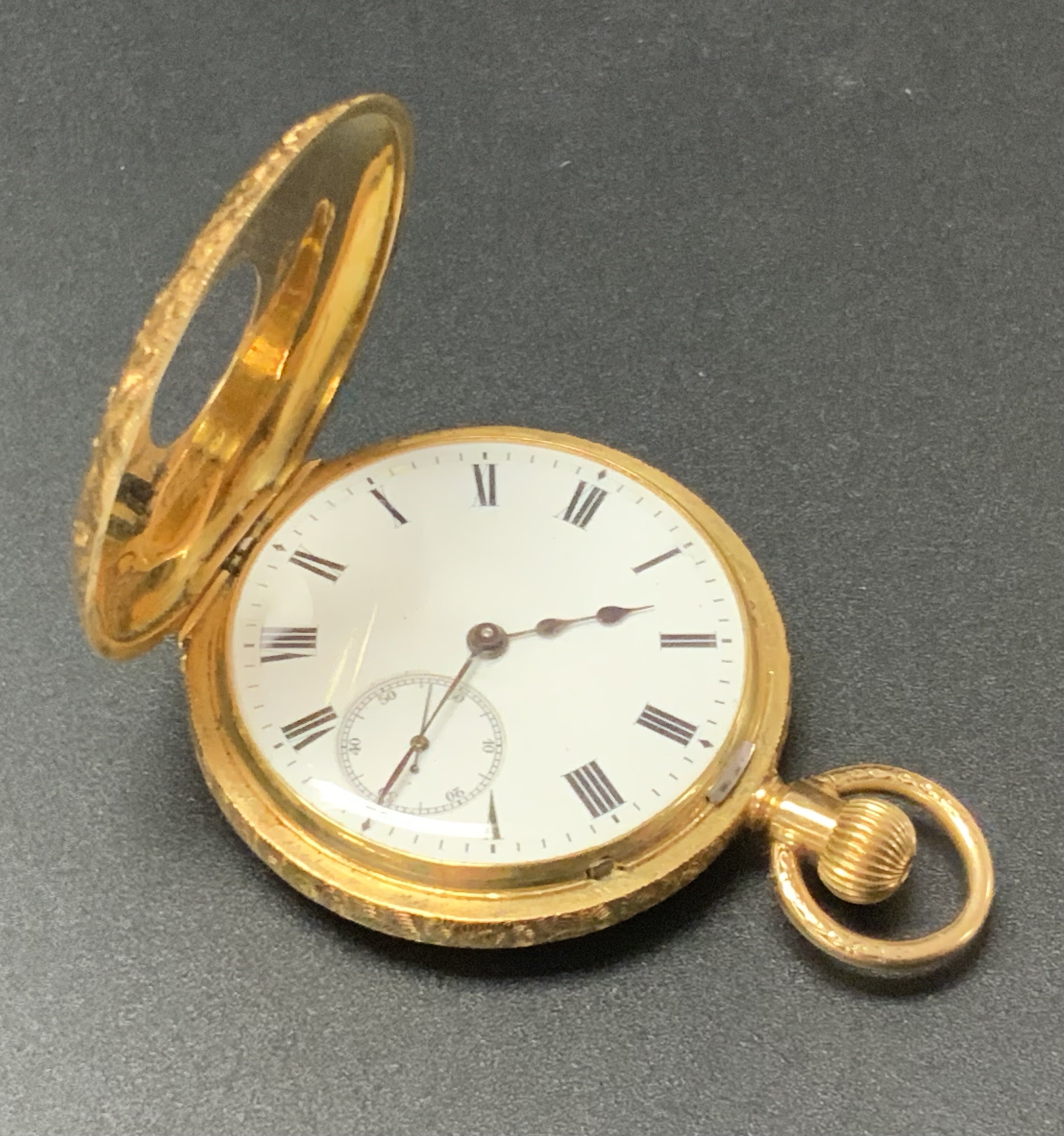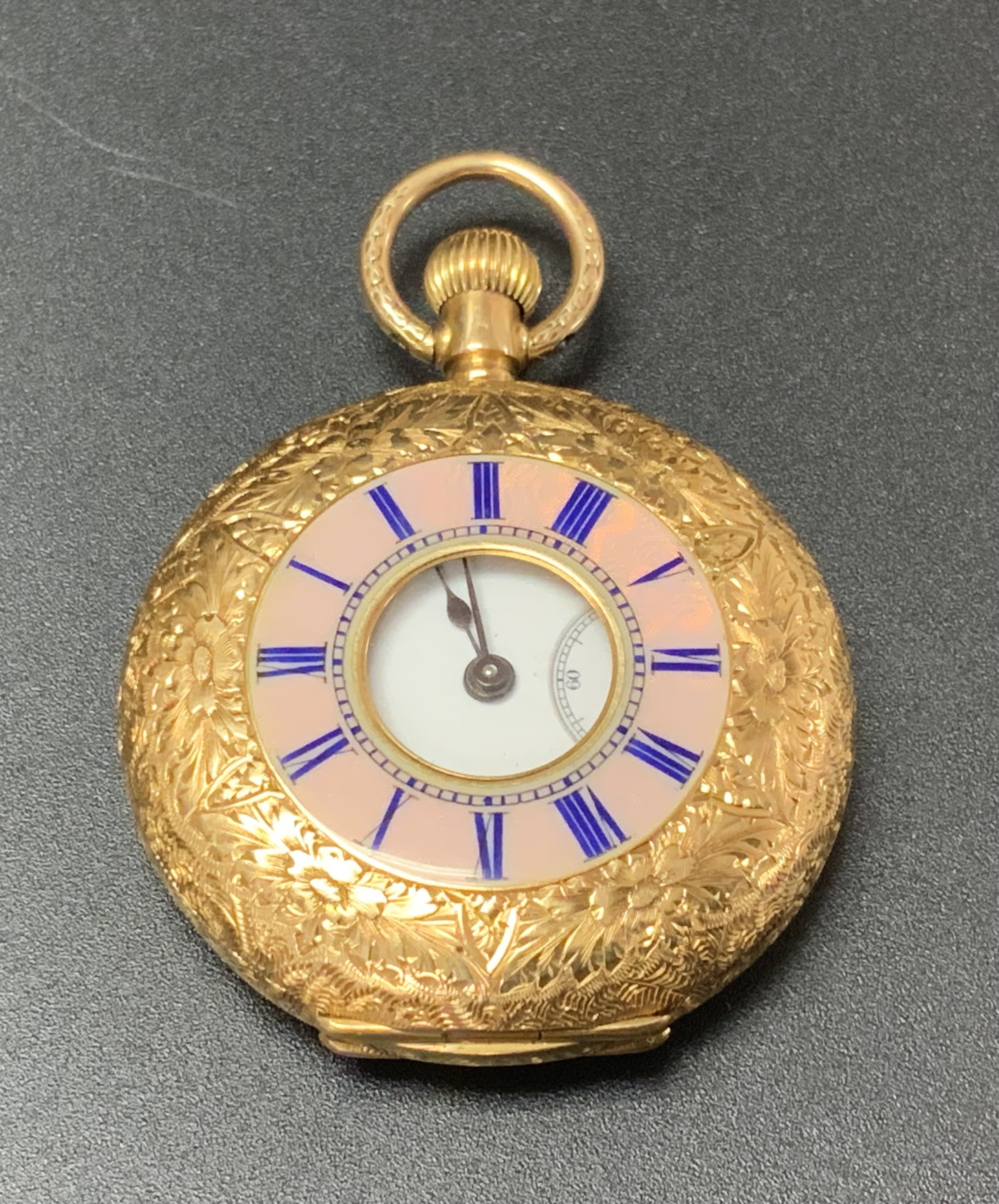 A quality 18ct gold half hunter fob watch with pink enamel outer chapter ring. (A)