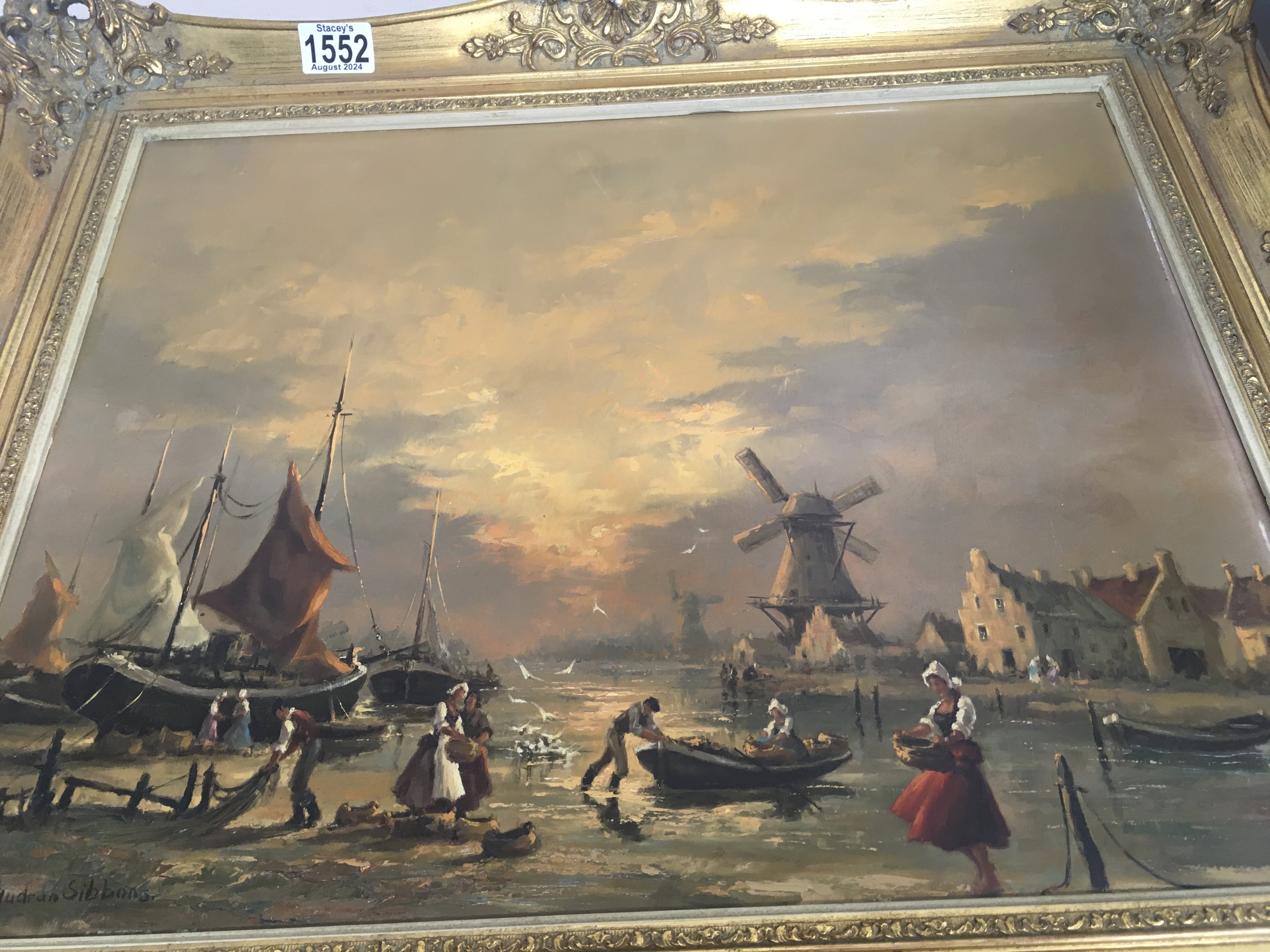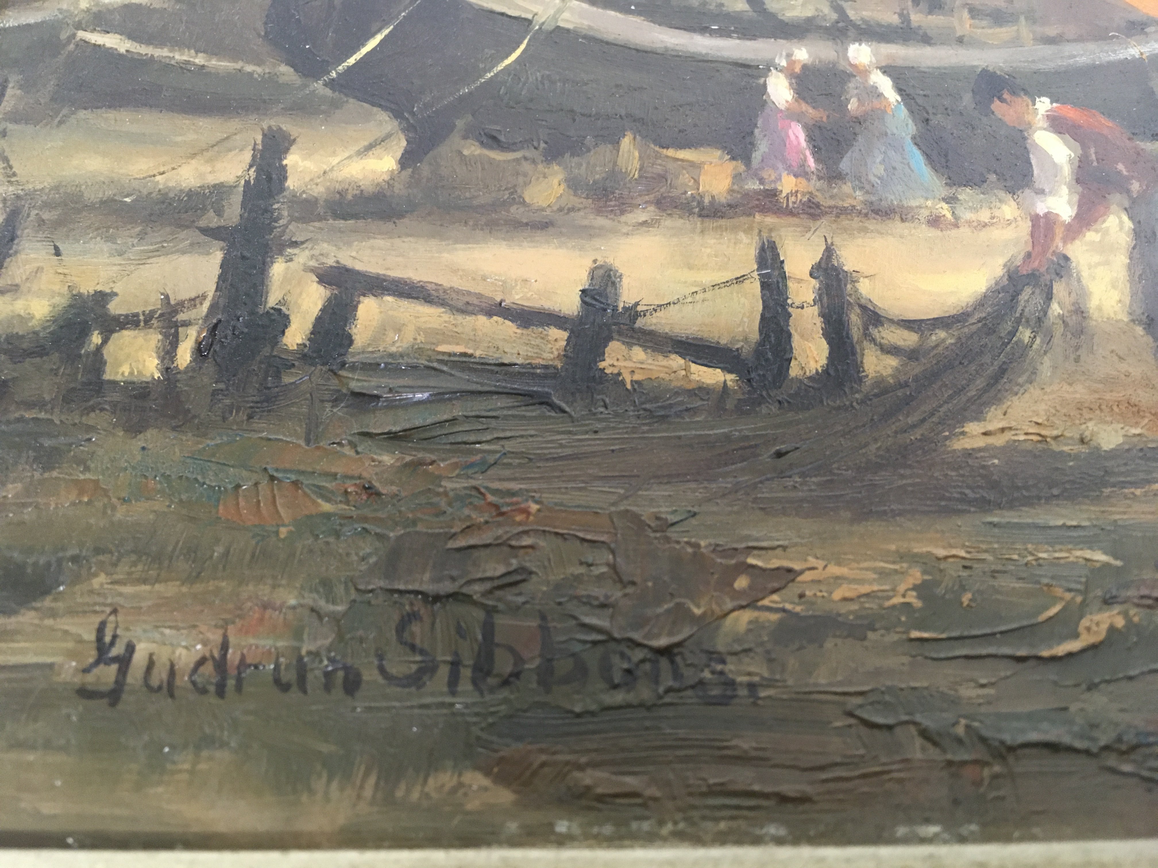 A gilt framed oil on board Dutch sea view with figures and windmills beyond.48cm x 40 cm . Signed Gudrun Sibbons .