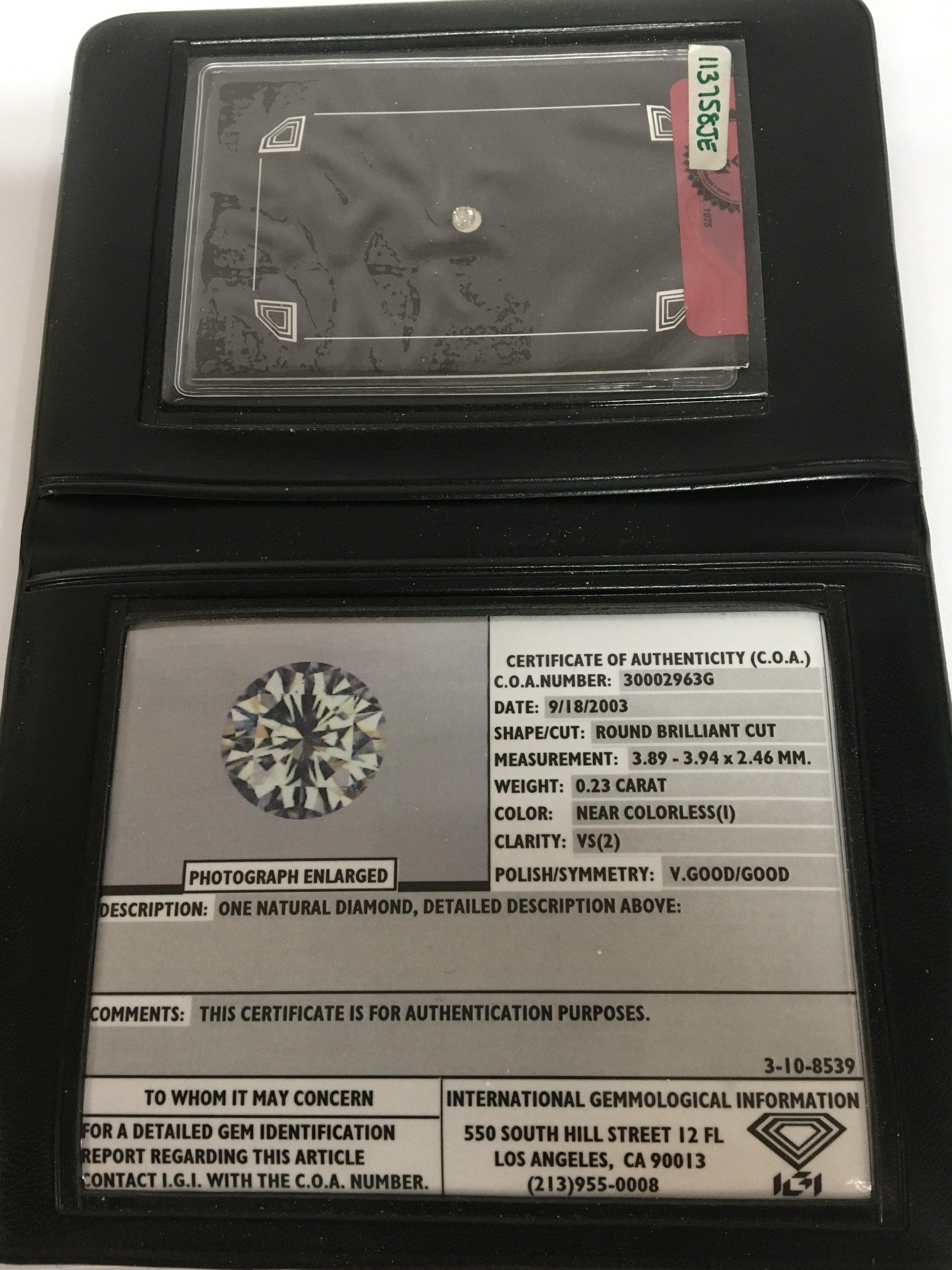 An unmounted brilliant cut diamond 0.23 of a carat. With a certificate of Authenticity Clarity VS(2) colour in a wallet.
