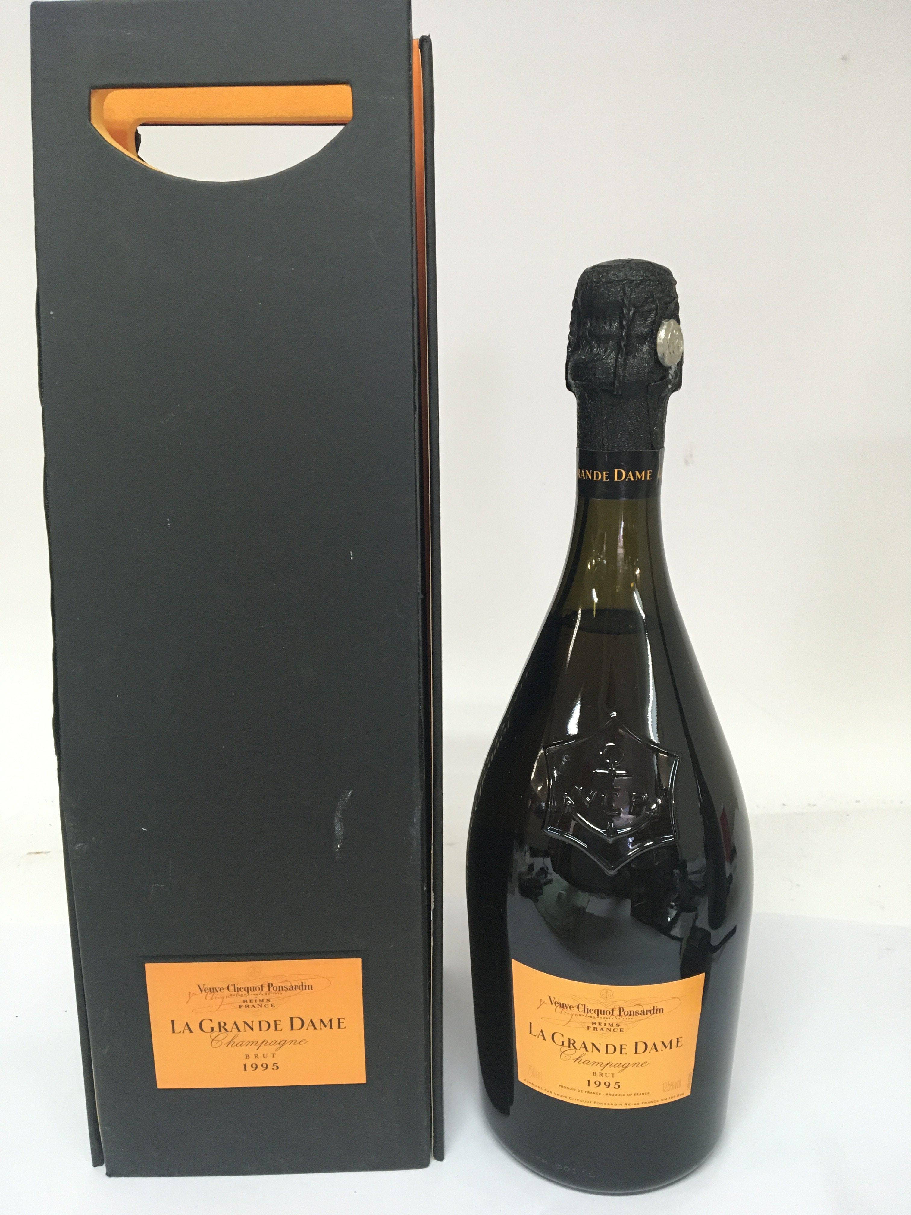 A Vintage bottle of La Grande Dame Veuve Clicquot Ponsardin Champagne in a fitted box.