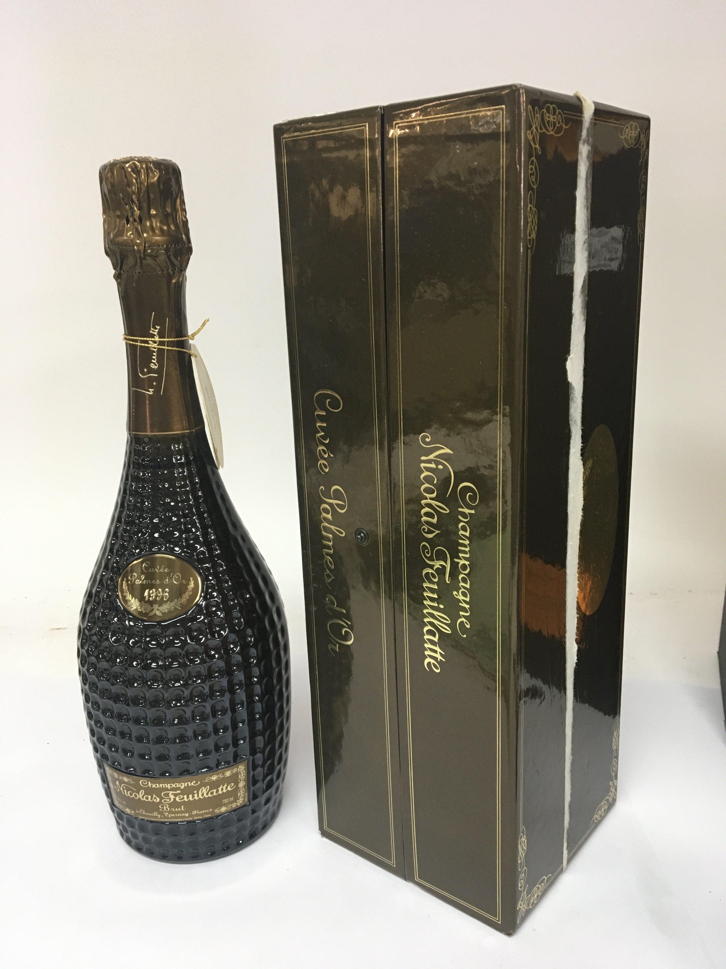 A bottle of Champagne Nicolas Feuillatte 1996 champagne. In a fitted presentation box