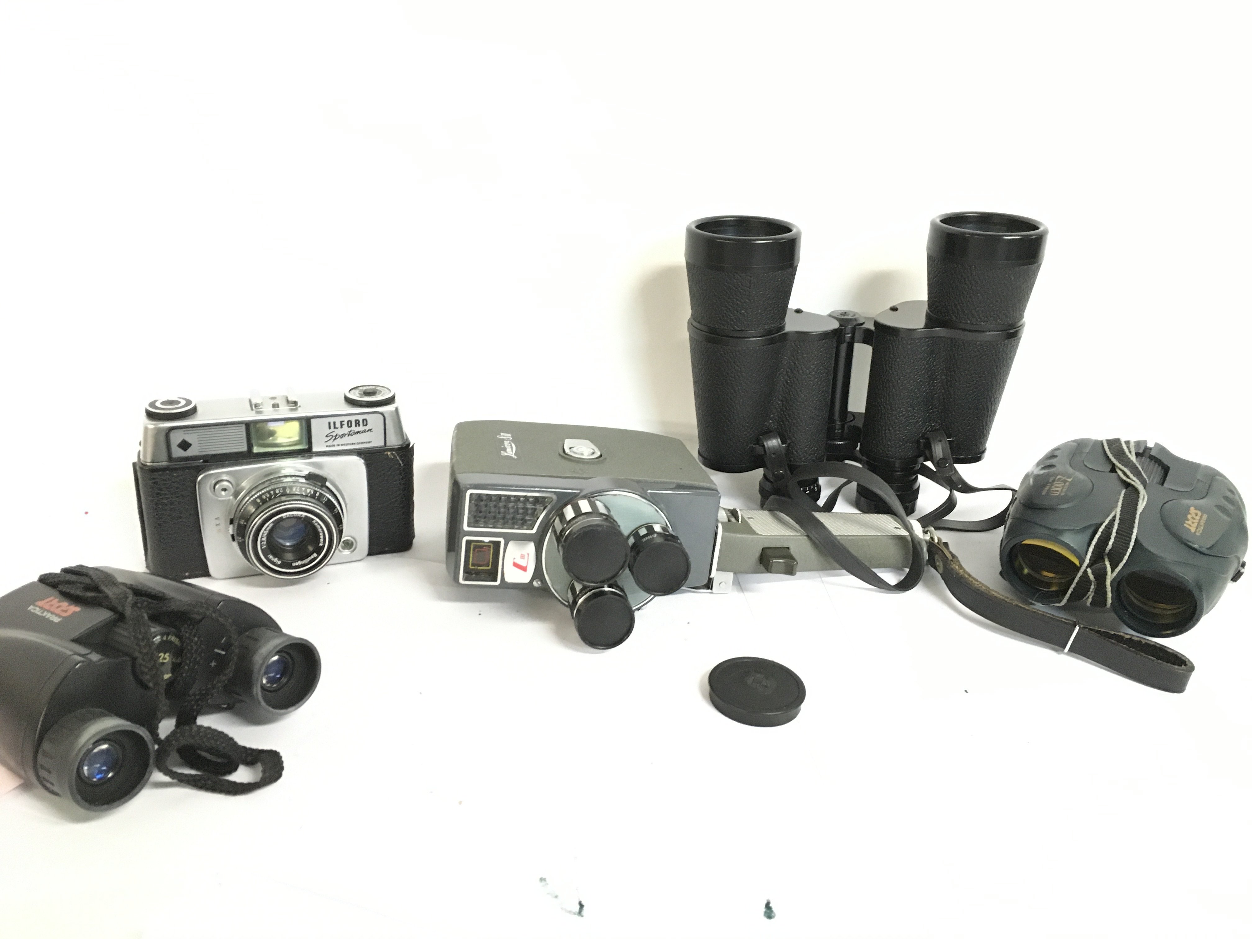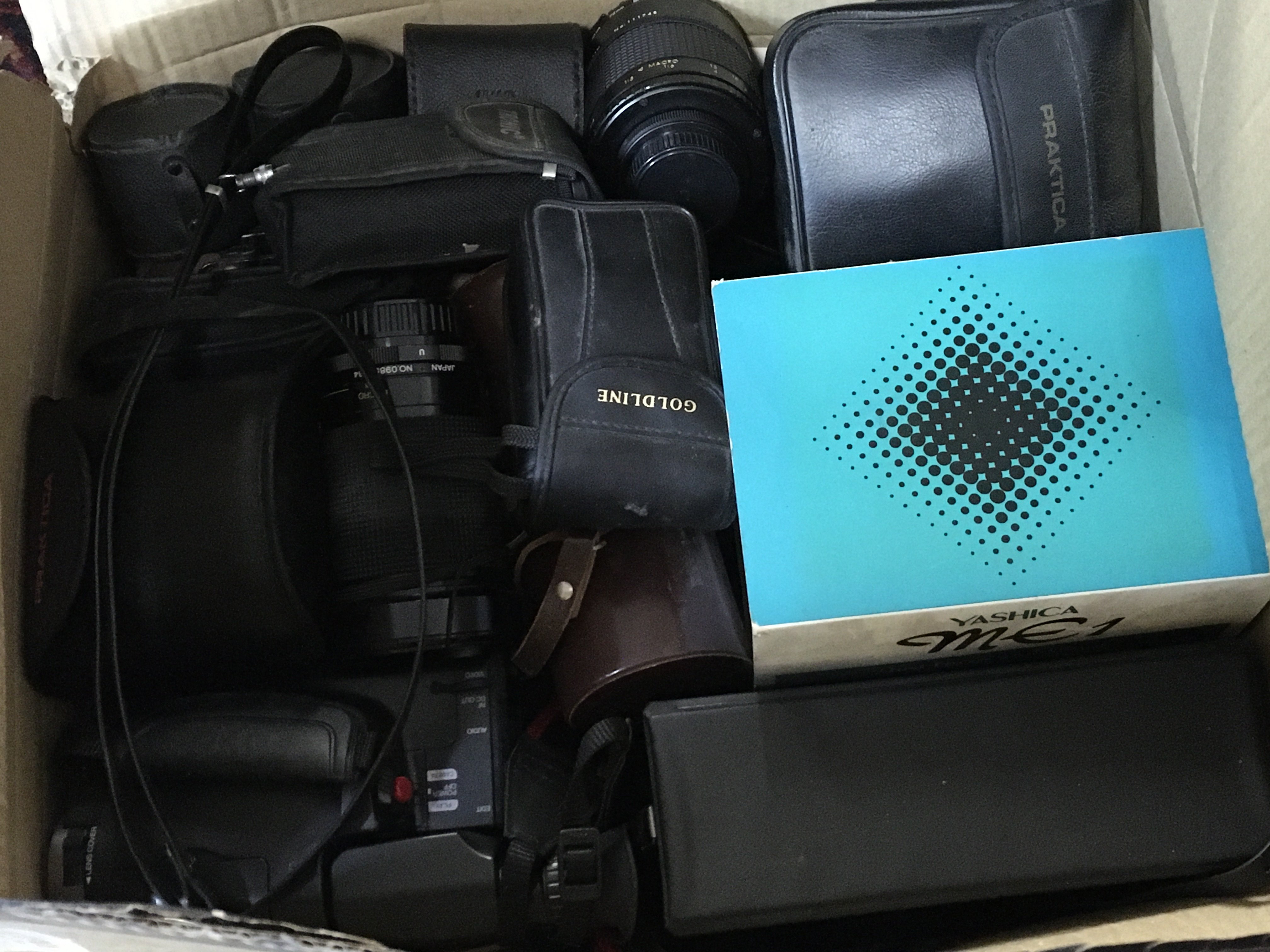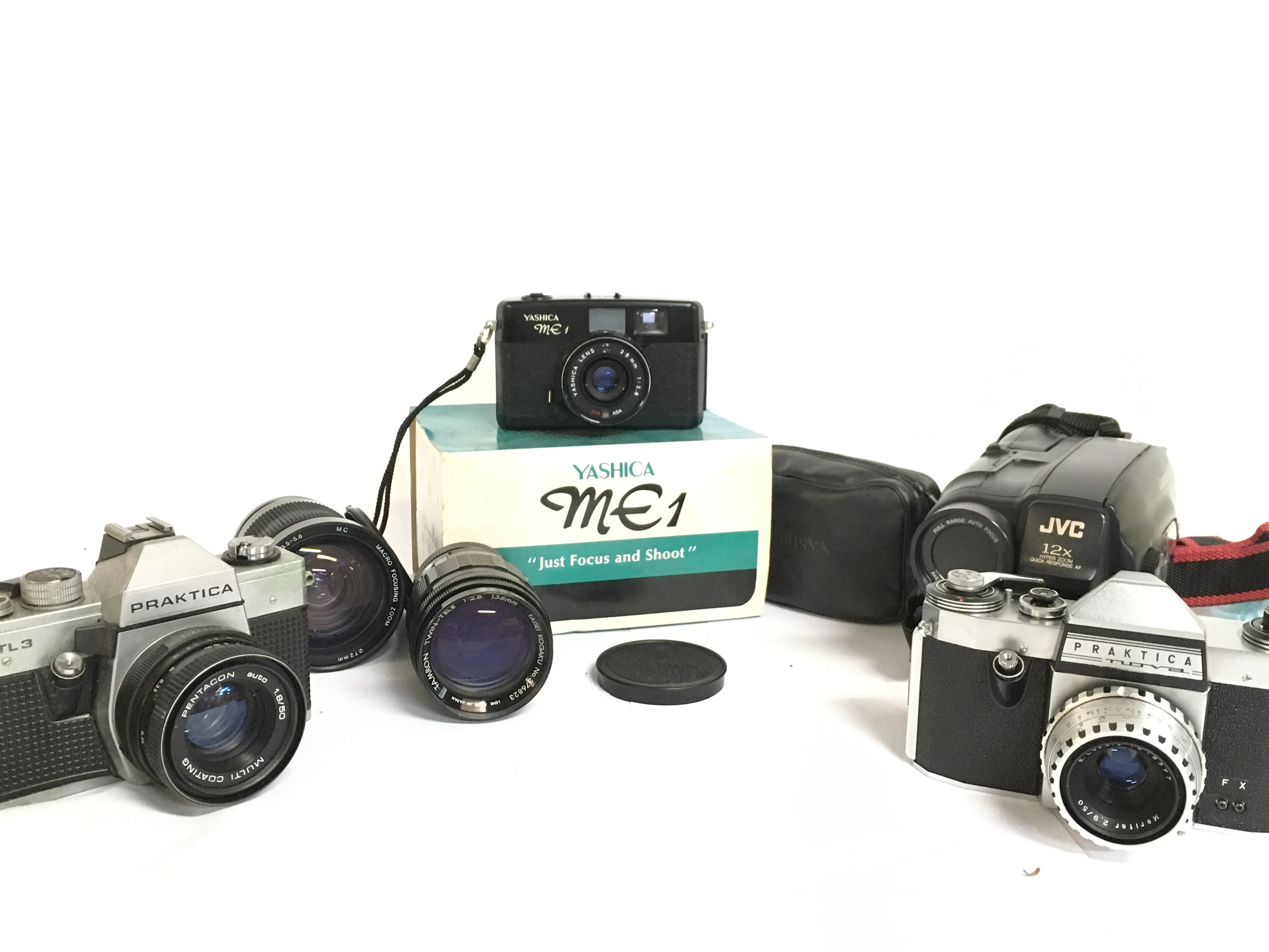A collection of camera equipment including a boxed Yashica ME1, Praktica MTL3, Praktica Nova FX, lenses Ensinor 500mm mirror lens
