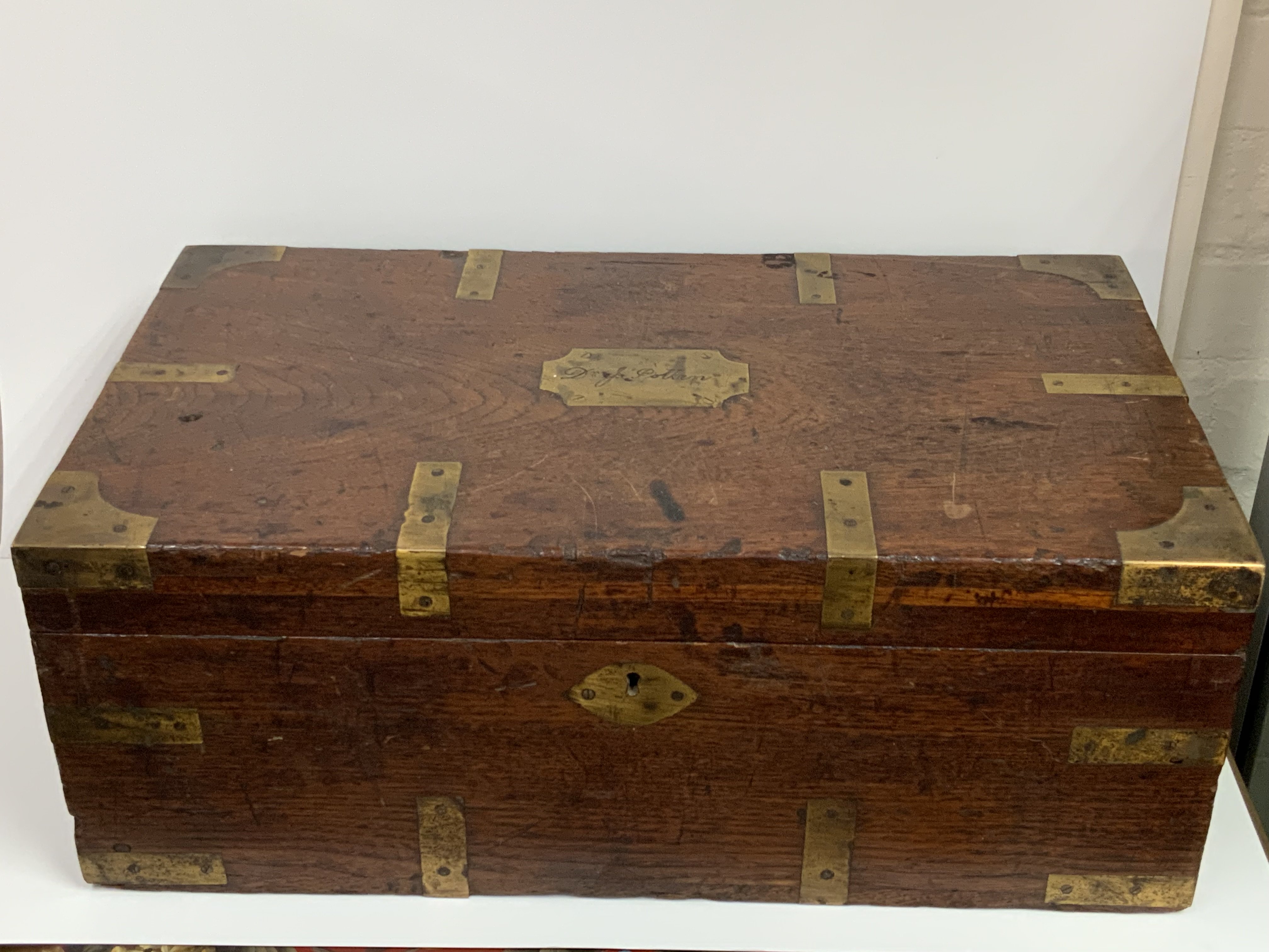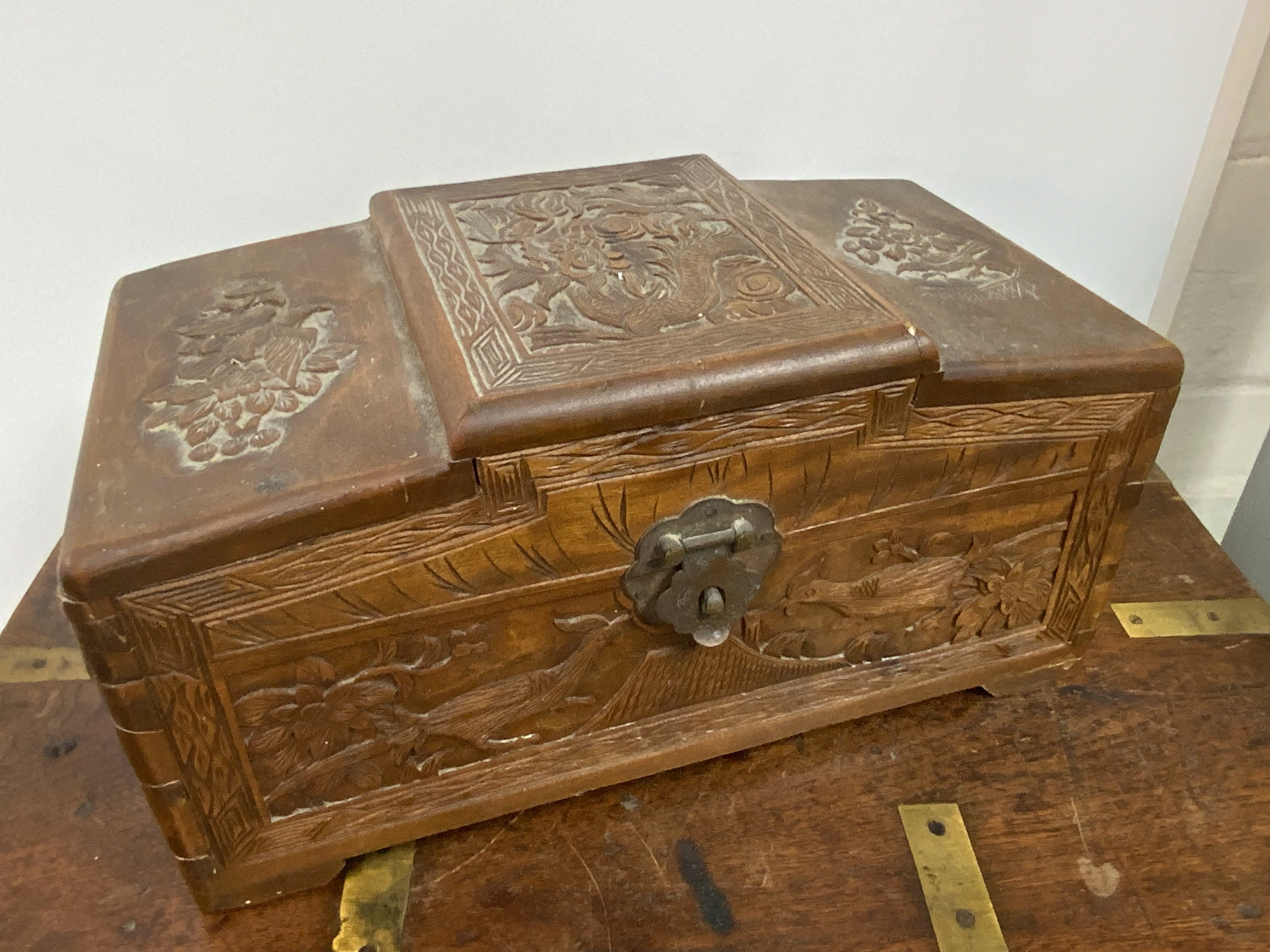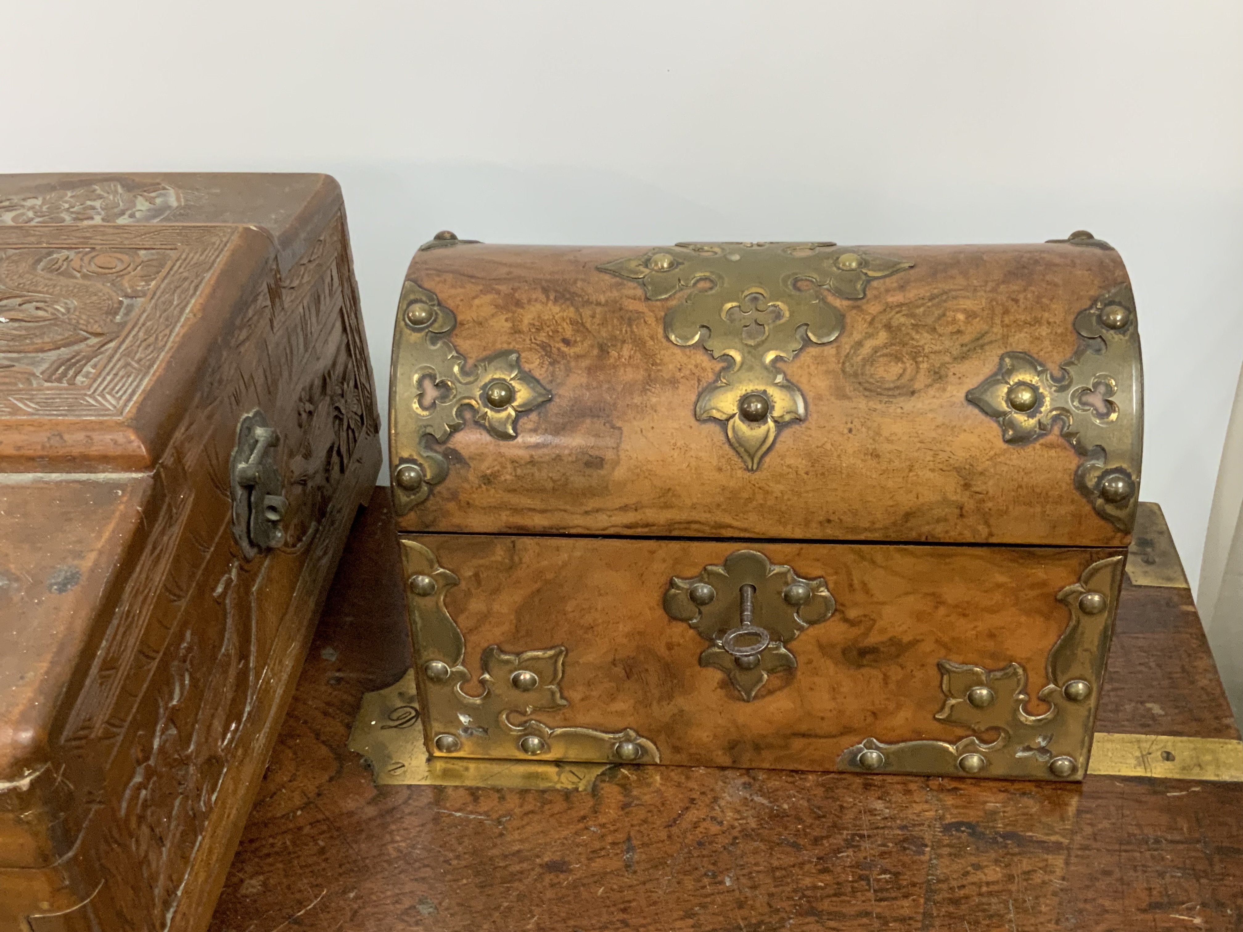 A large brass bound chest with engraved panel, An oriental camphor wood jewel casket, Victorian walnut brass bound letter box. (D)