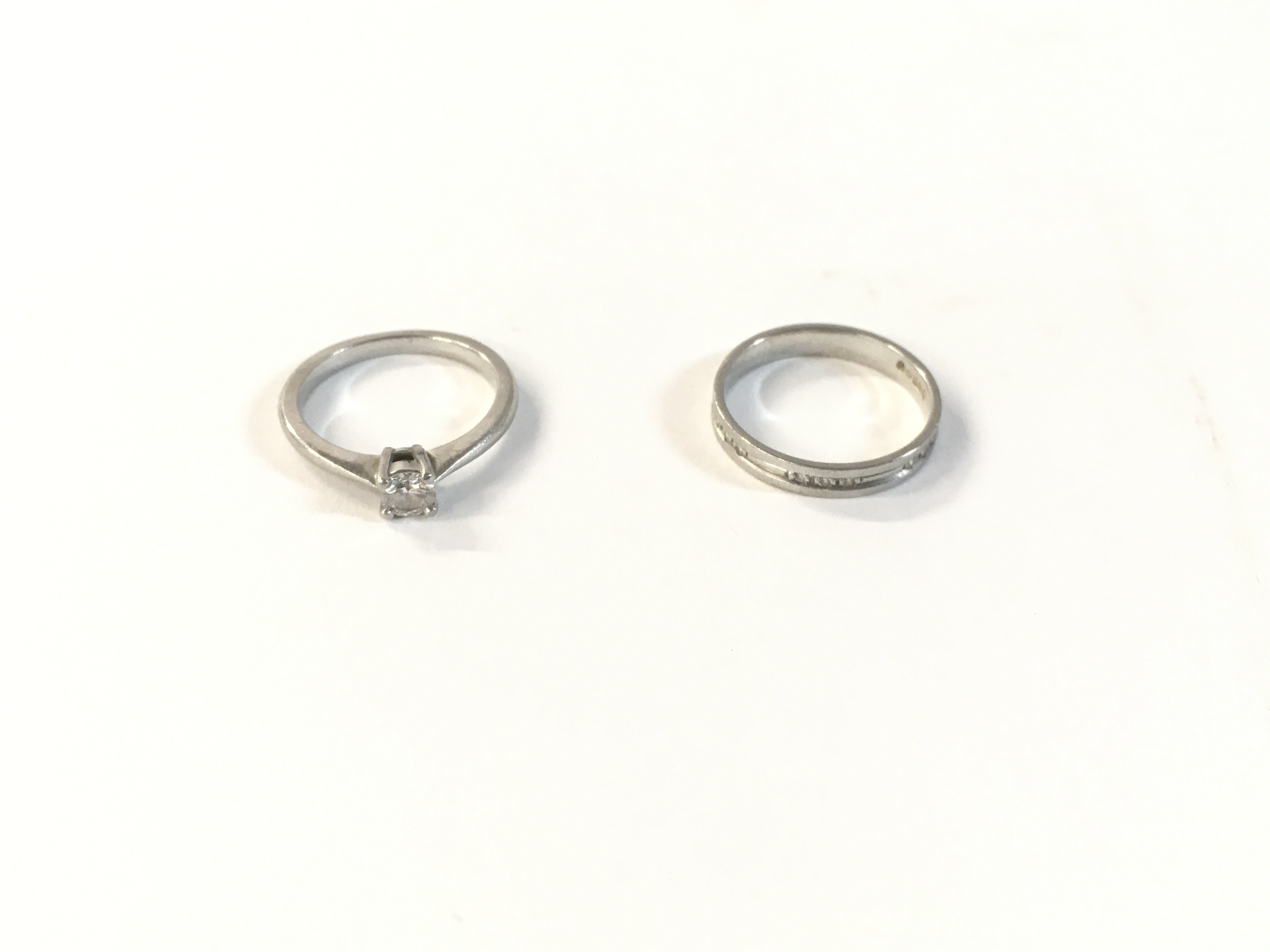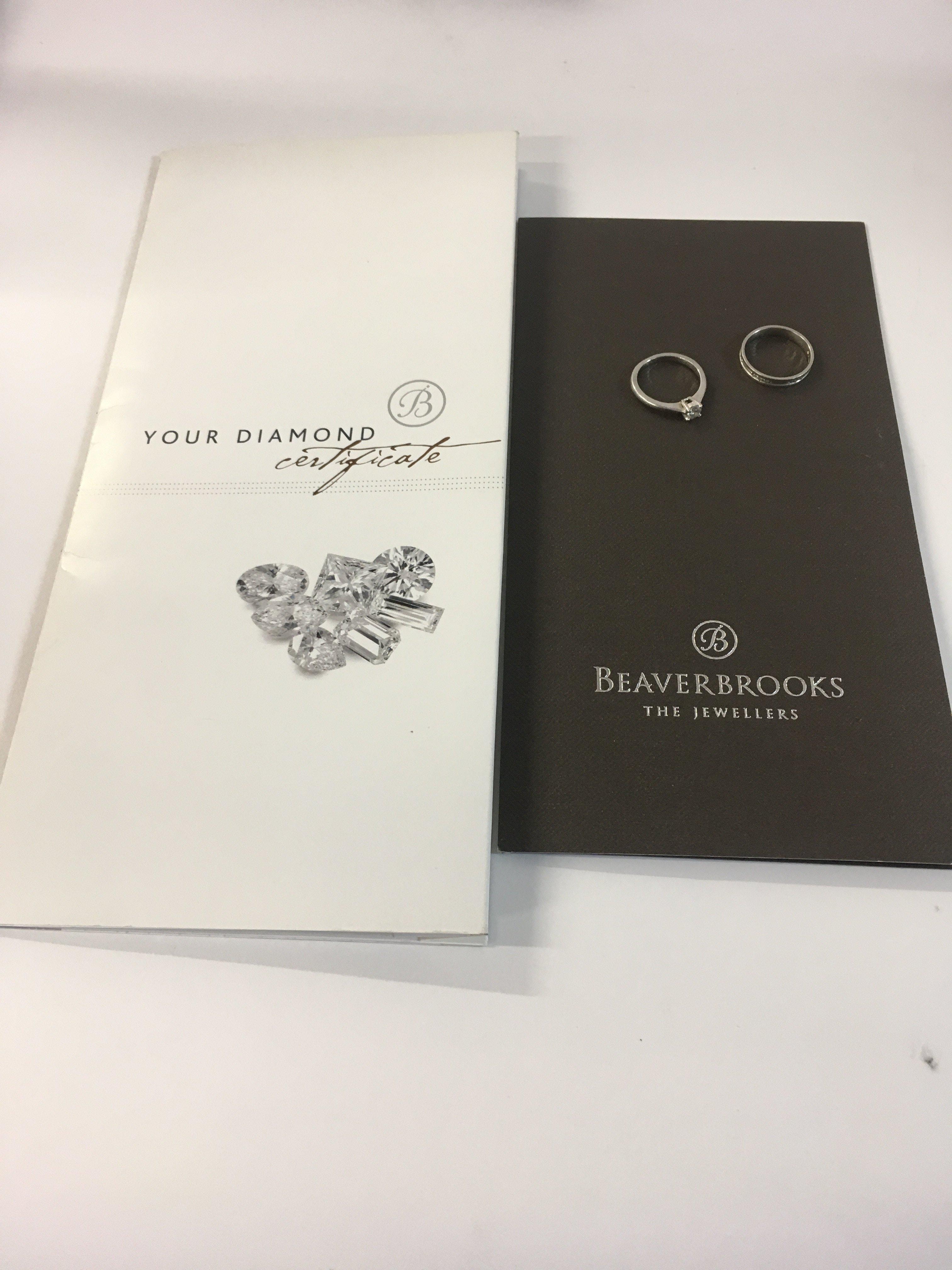 A beaver brooks platinum diamond set band and a diamond solitaire wedding ring. With a certificate for the diamond set band. Approx diamond weight of band 0.06cts, approx diamond weight of the solitaire 0.25cts. Approx weight 6.3grams.