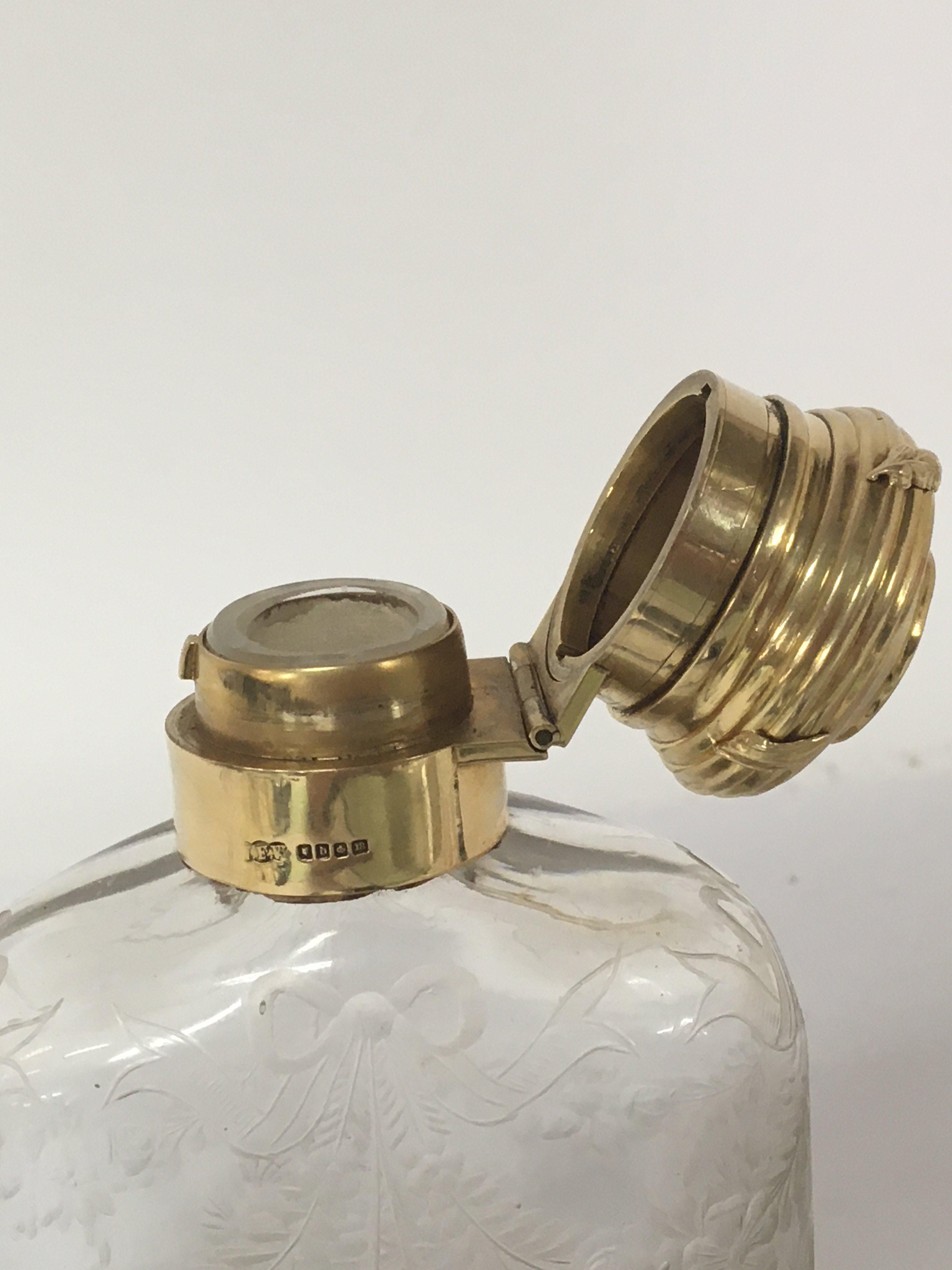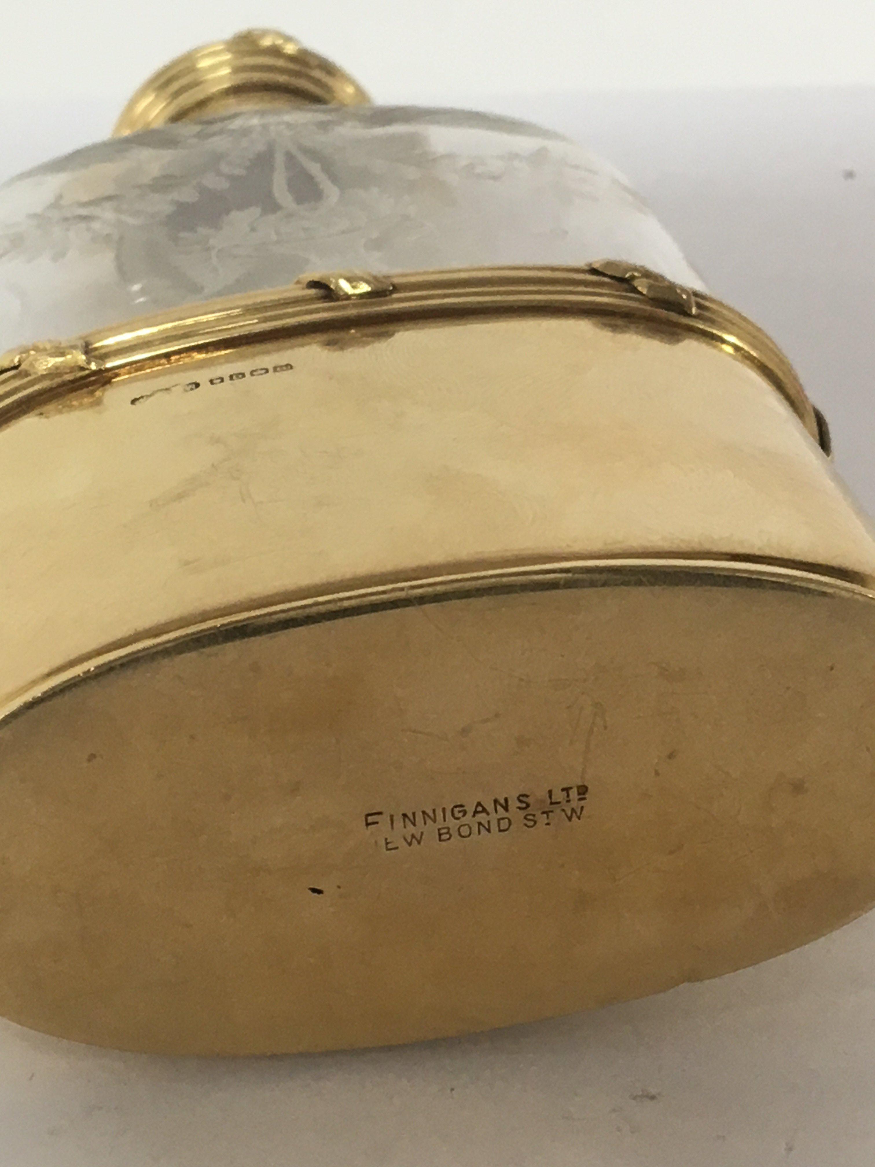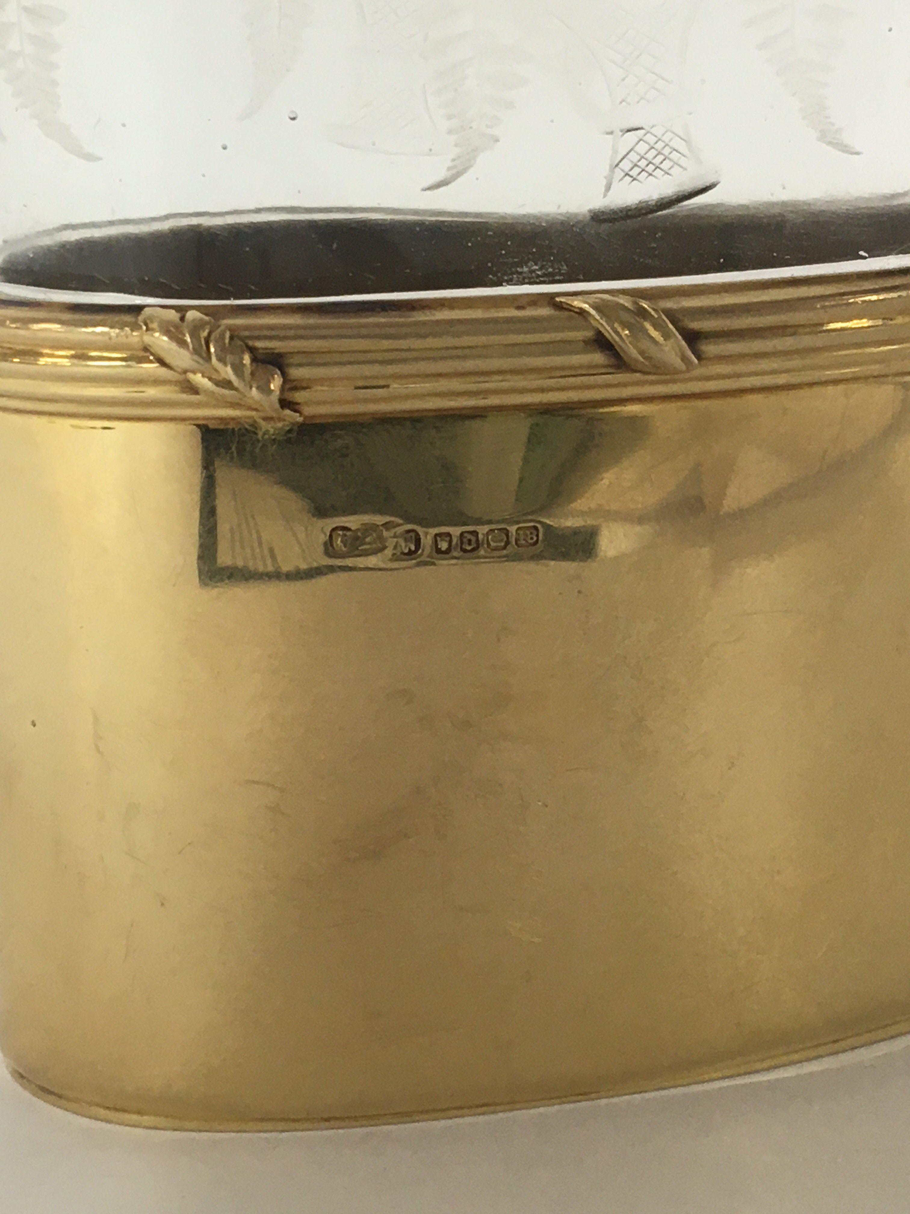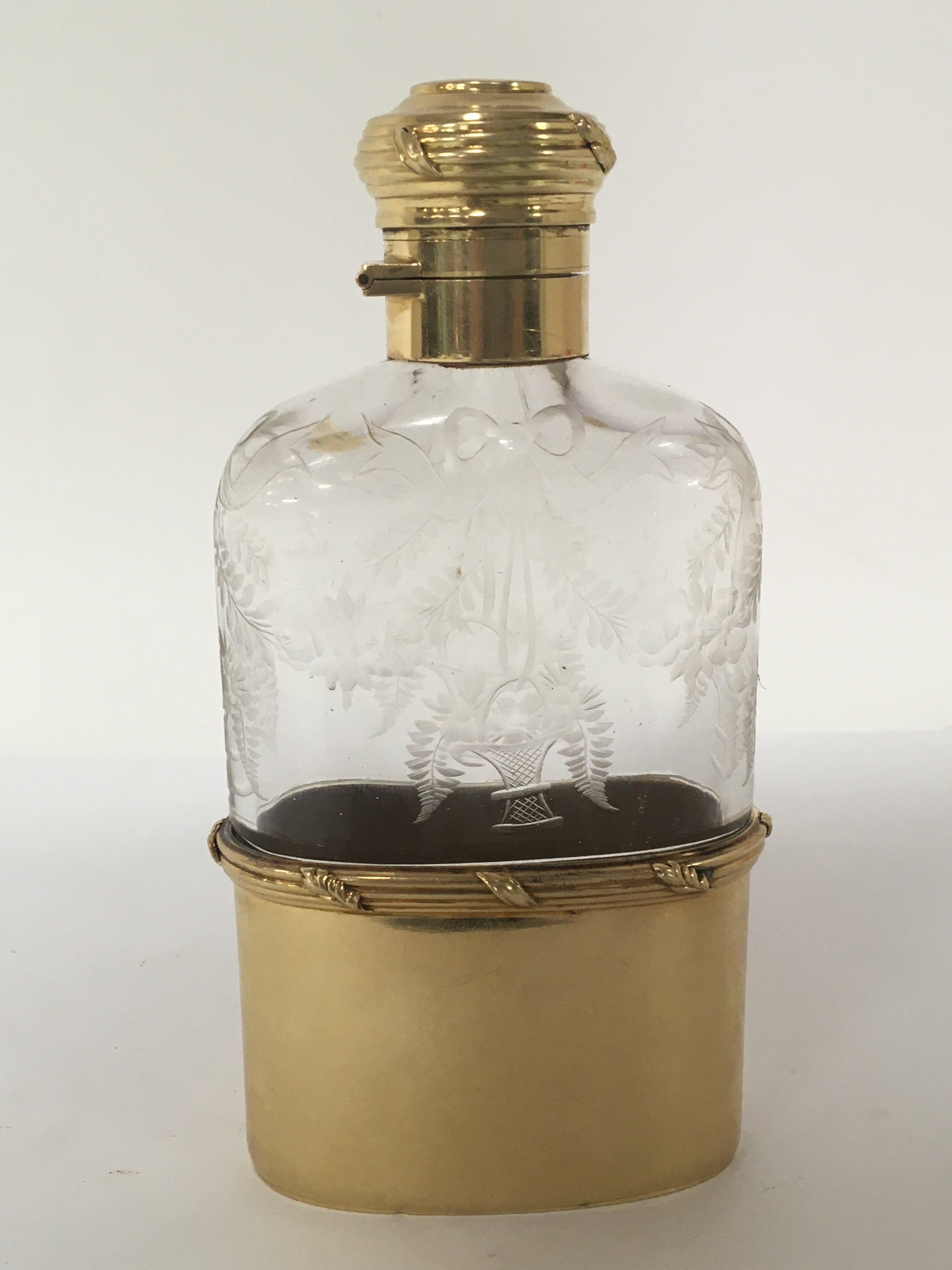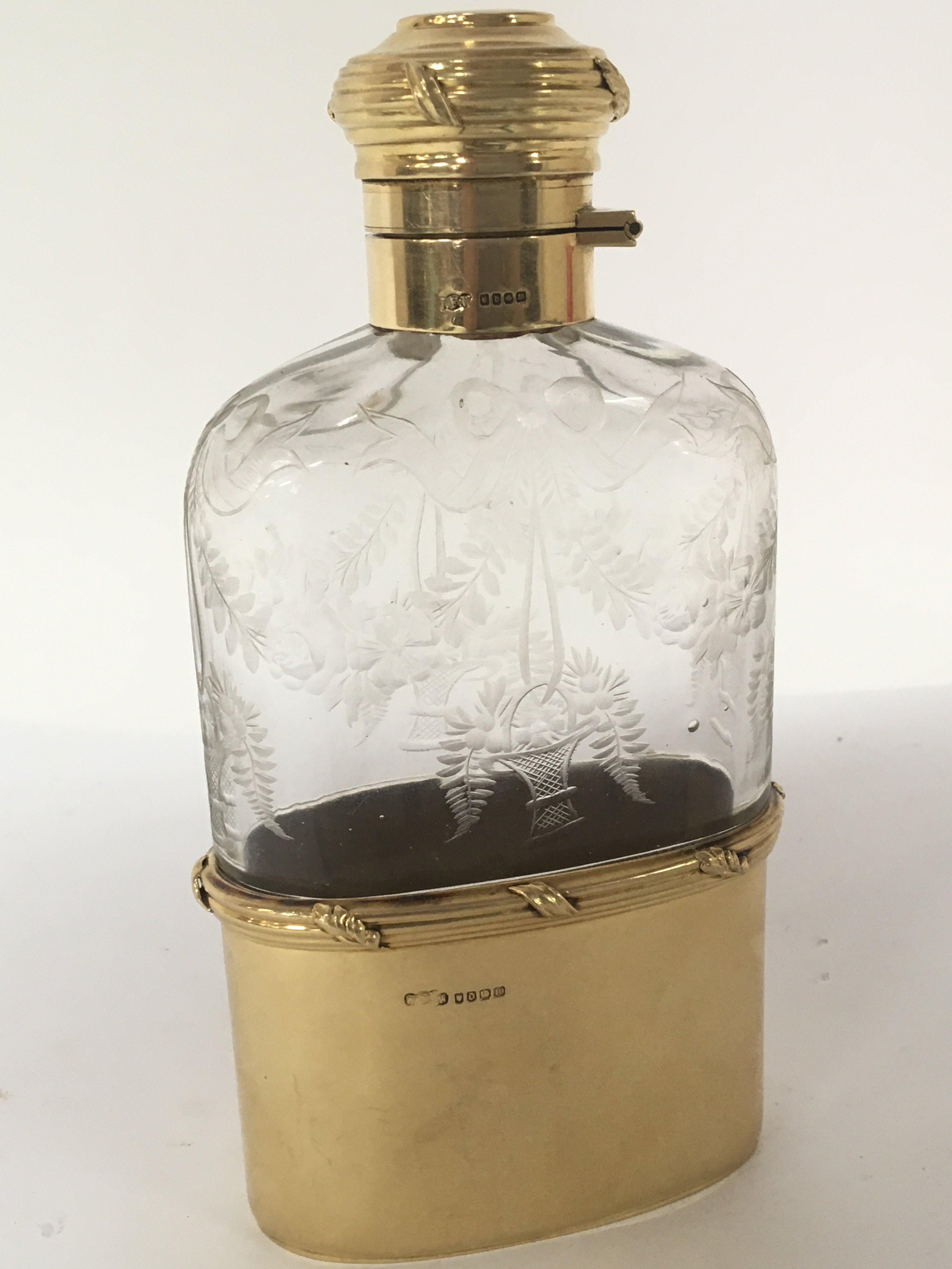 An Exceptional Quality 18carat gold and wheel etched glass George V hip flask date 1919. One of the finest hip flasks to be sold on the market. The hallmark for London with George V crown maker Finnigans New Bond Street London. Which had many famous customers Rockefeller Ford Vanderbilts. The hip flask with a solid 18carat gold collar and hinged top. The base cup solid 18carat gold weight 92g the collar possible a further 40g. No damage. No personal inscriptions.