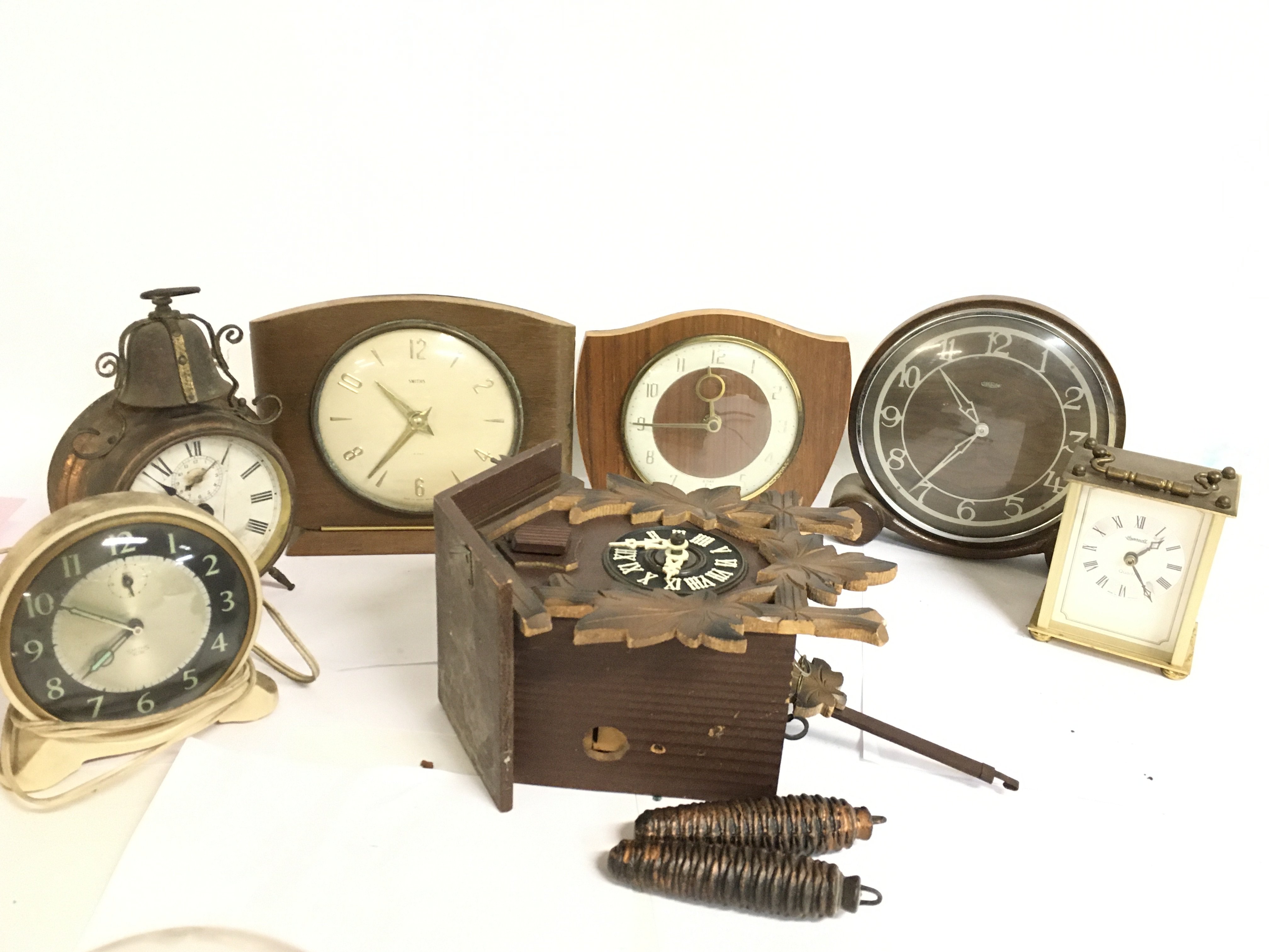 A collection of vintage mantle clocks including Smiths and other clocks including a Ingersoll carriage clock. This lot cannot be posted