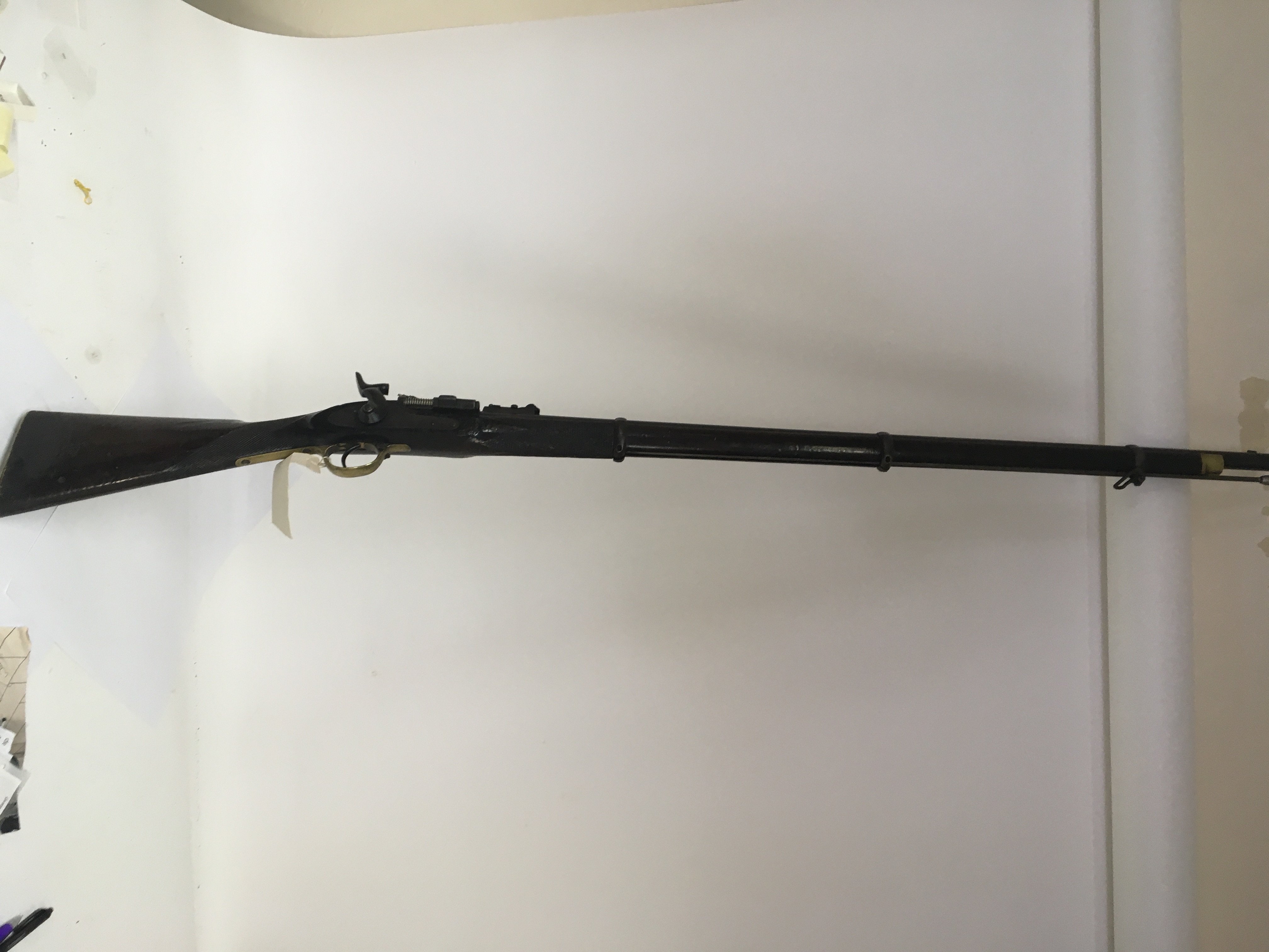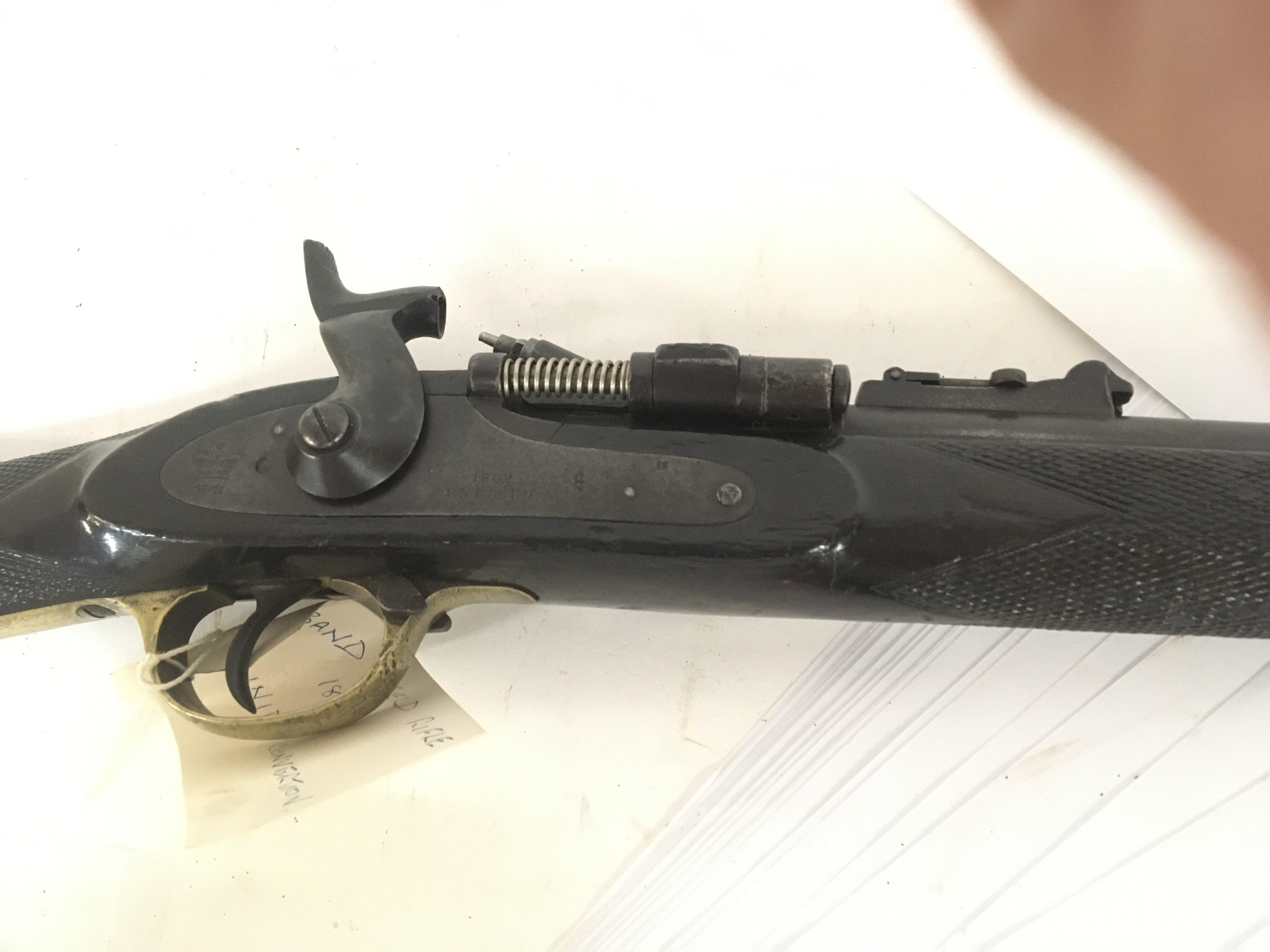 A Victorian 1862 Enfield with Snider conversion three band rifle the action with Queen Victoria crown date stamp Enfield with brass trigger guard detachable ram rod full length walnut stock