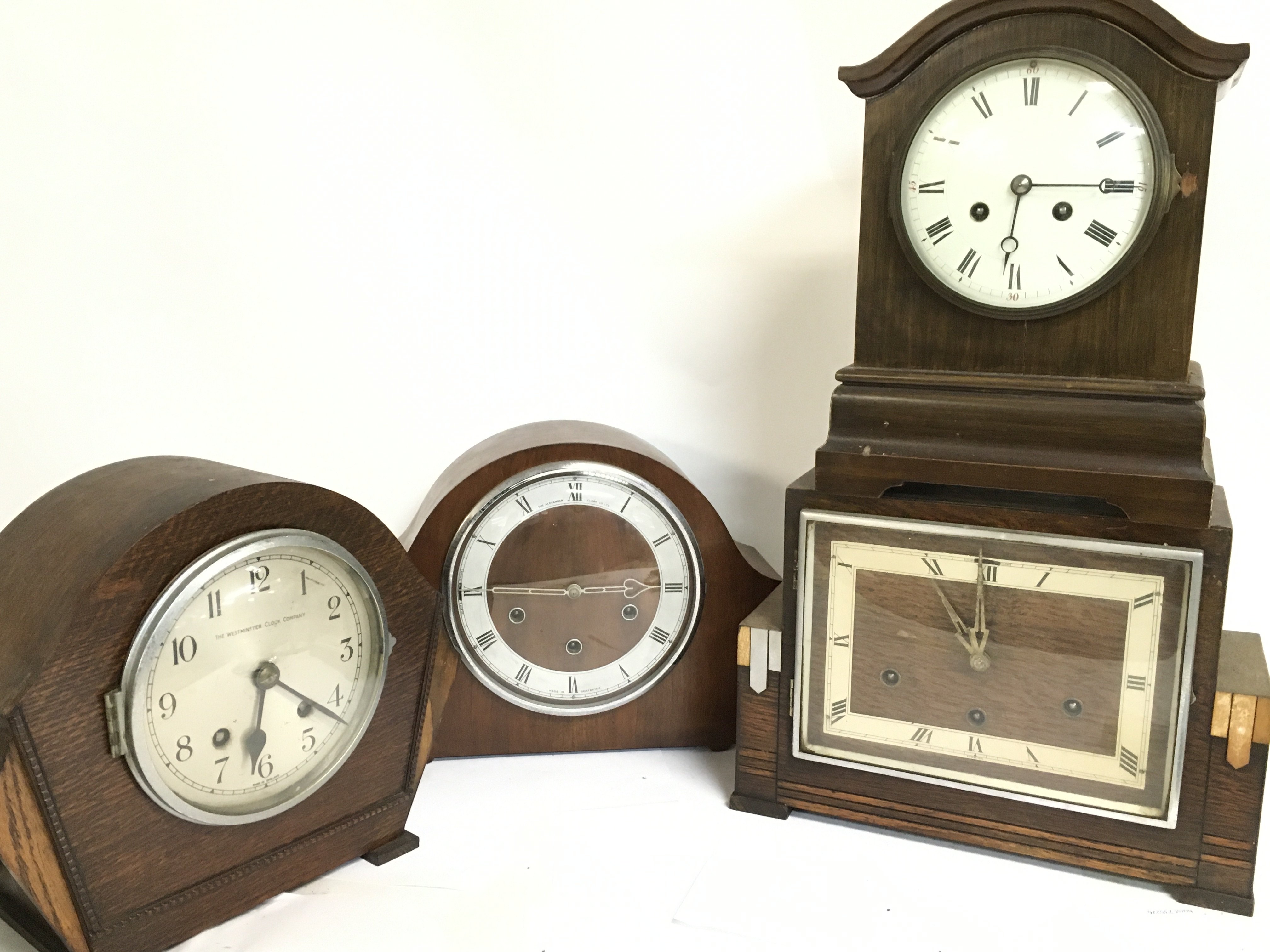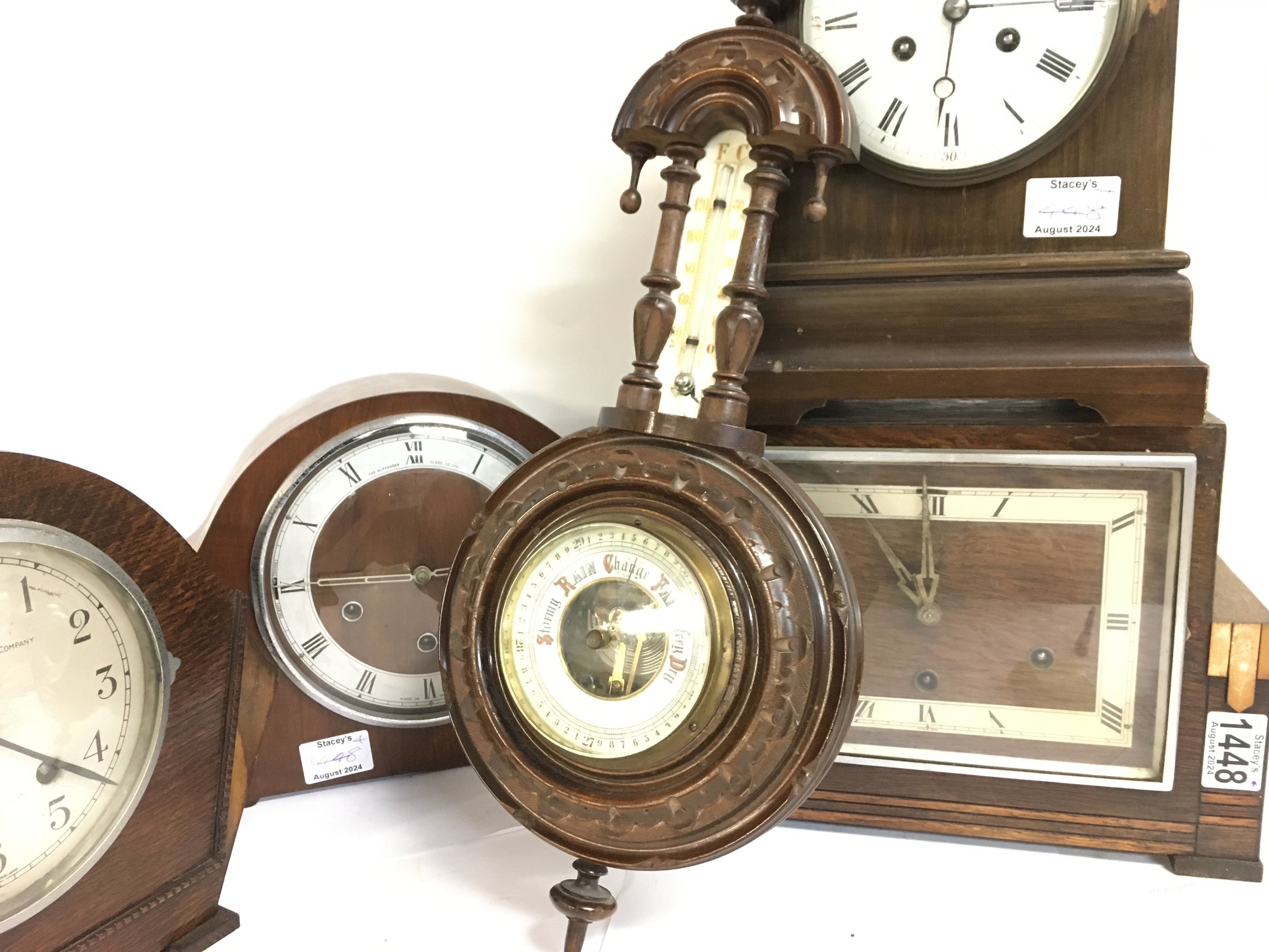 Oak Mantle clocks including Alexander Clark, Westminster clock company etc. A small barometer This lot cannot be posted