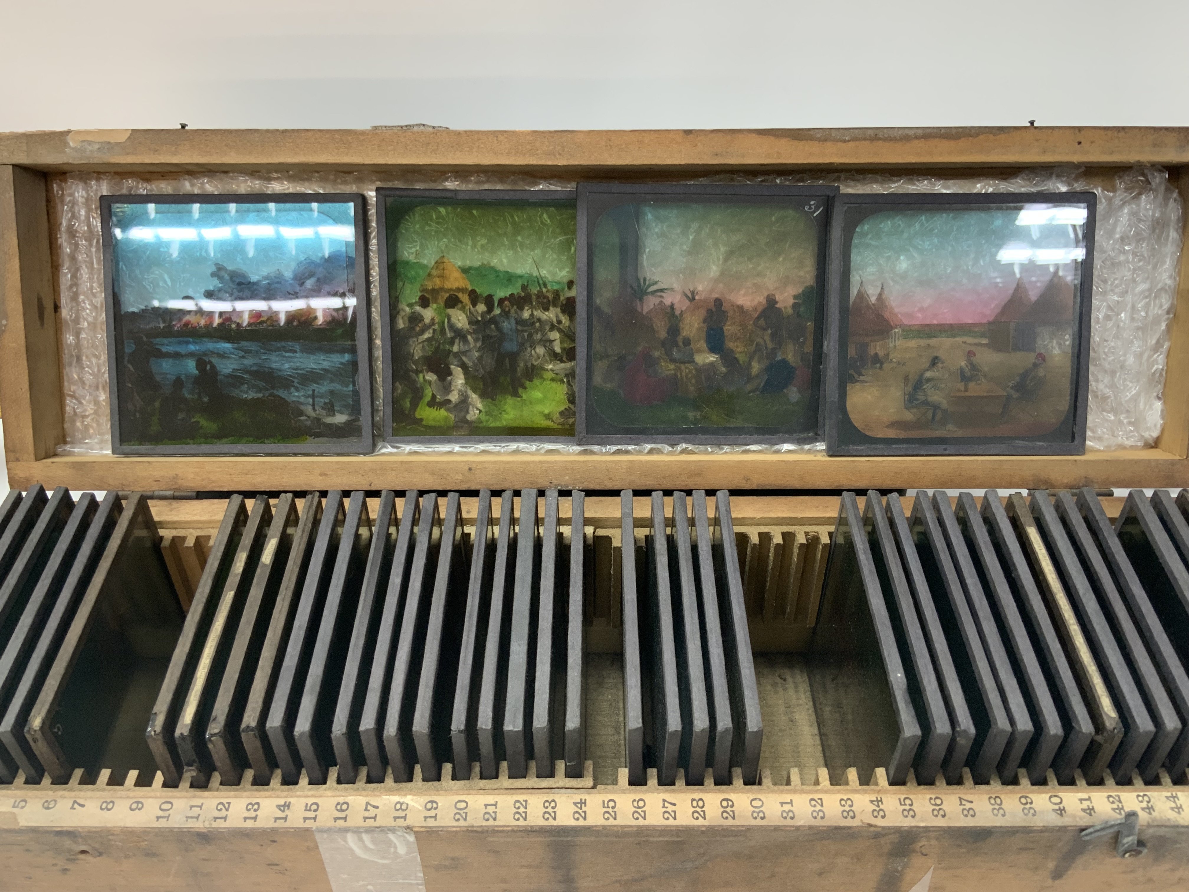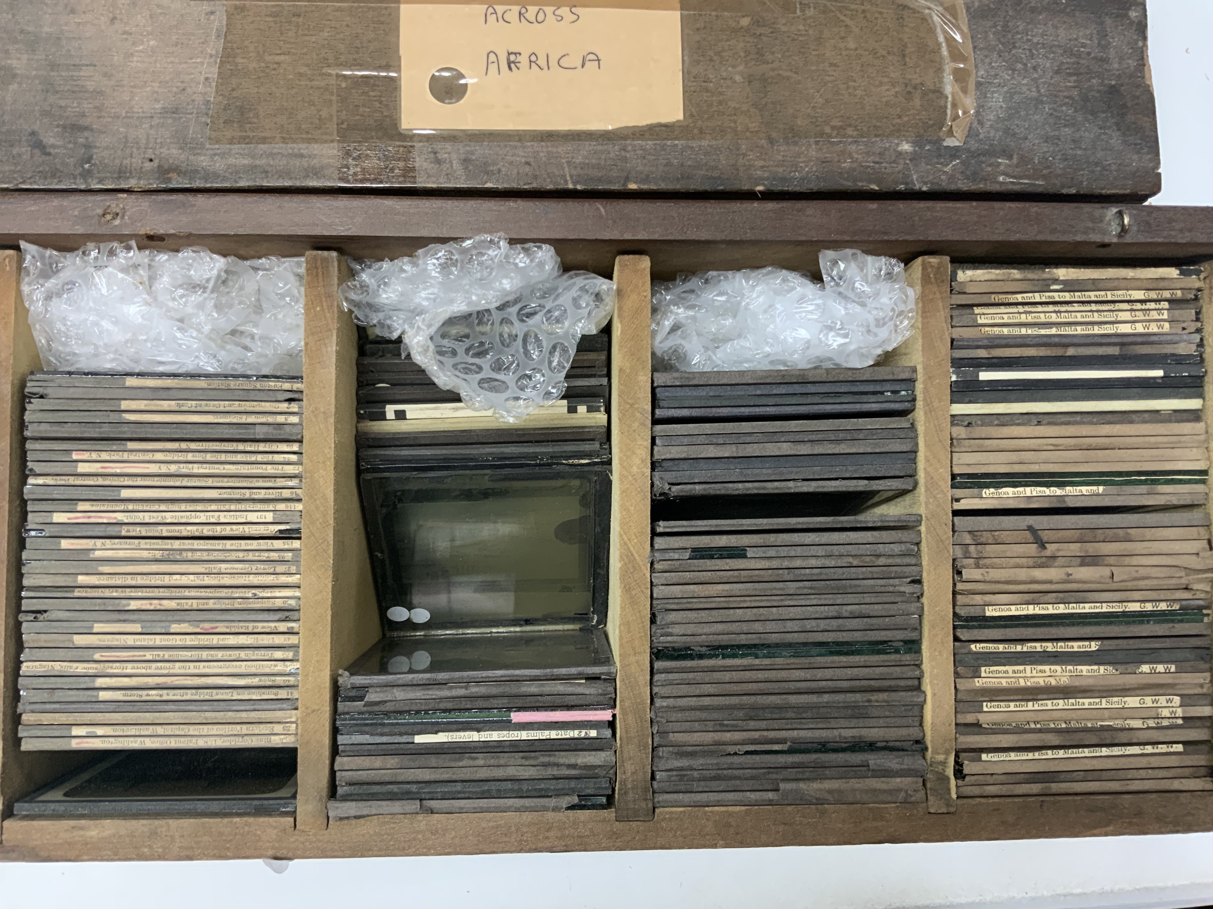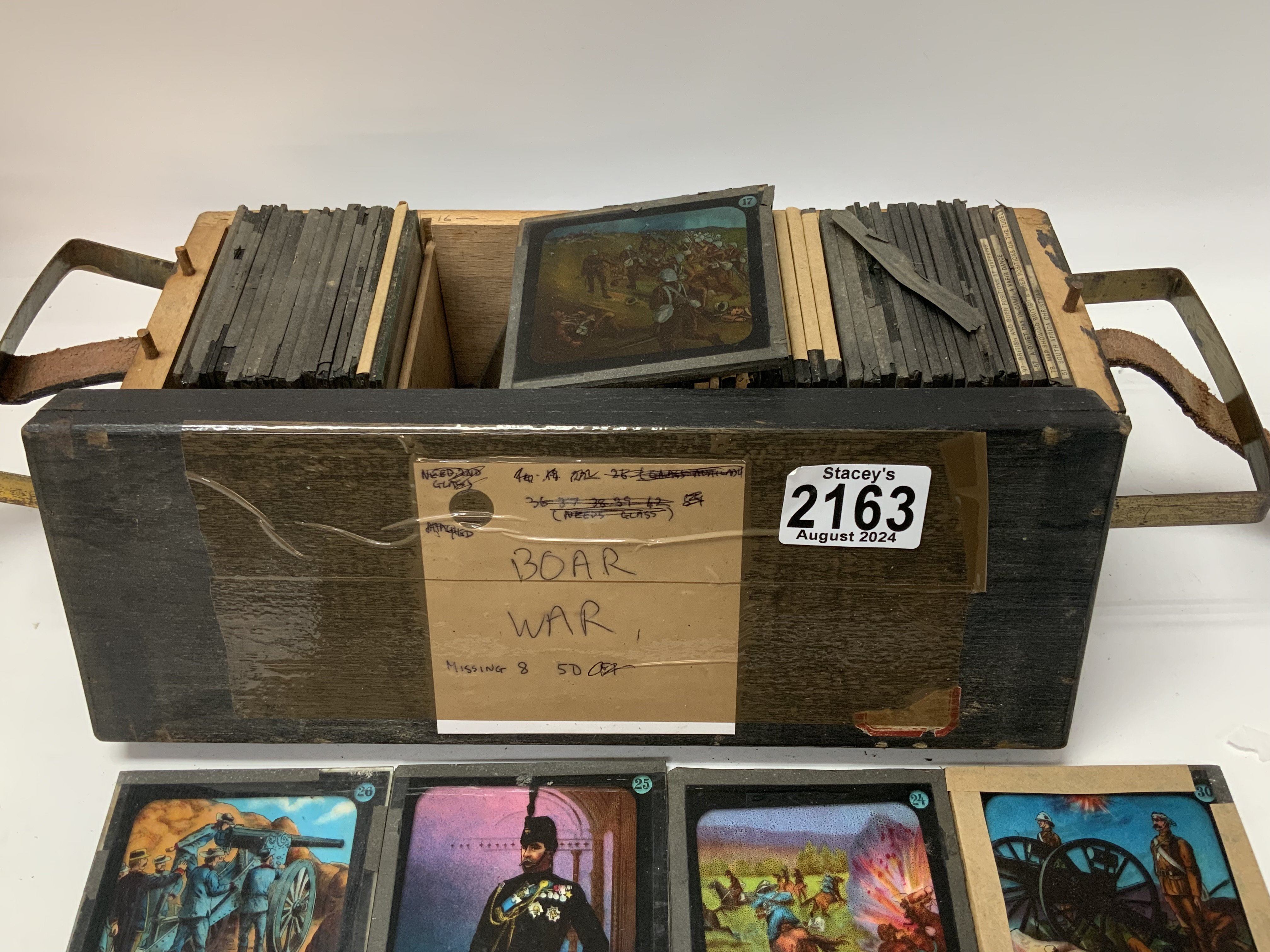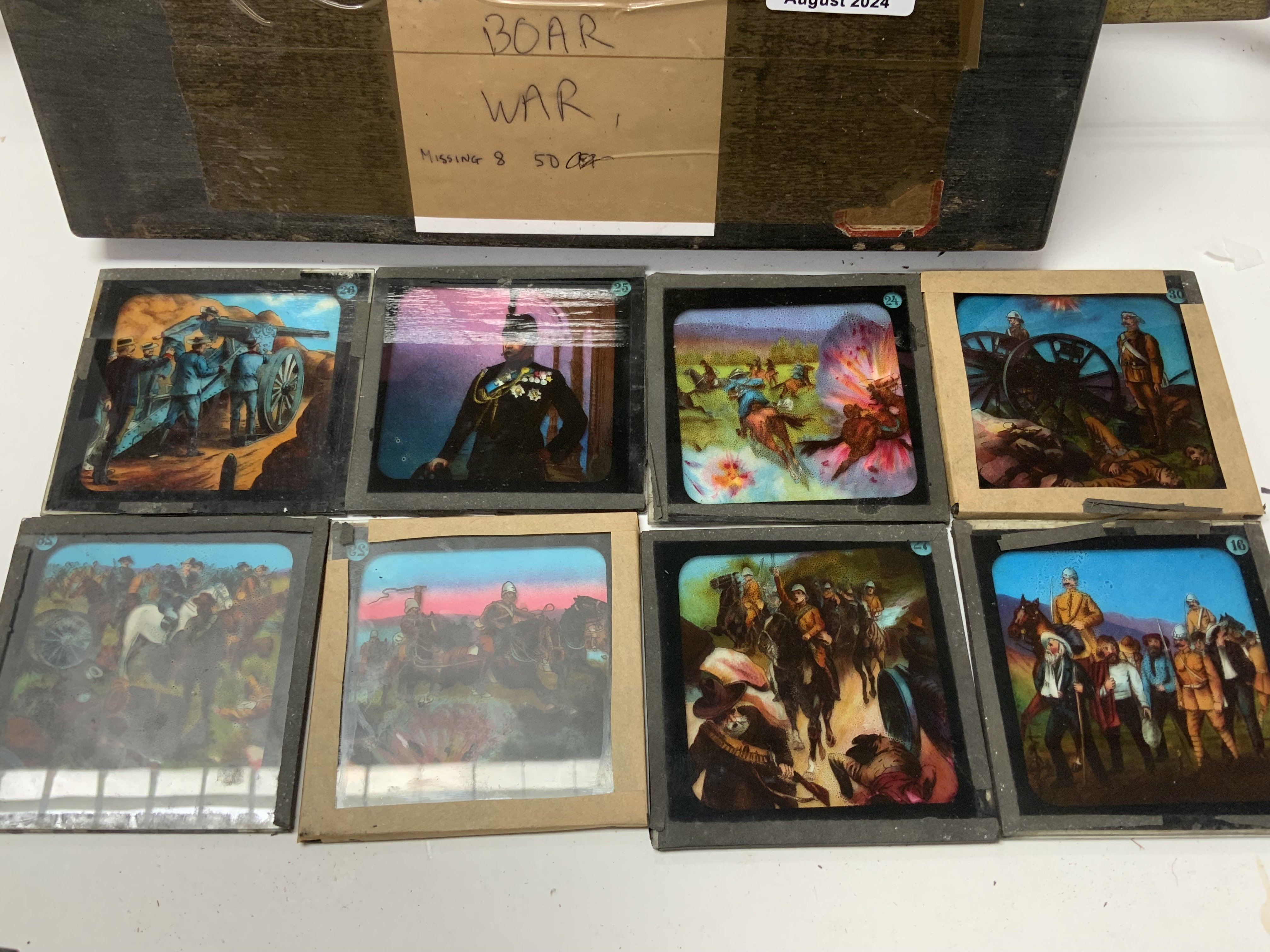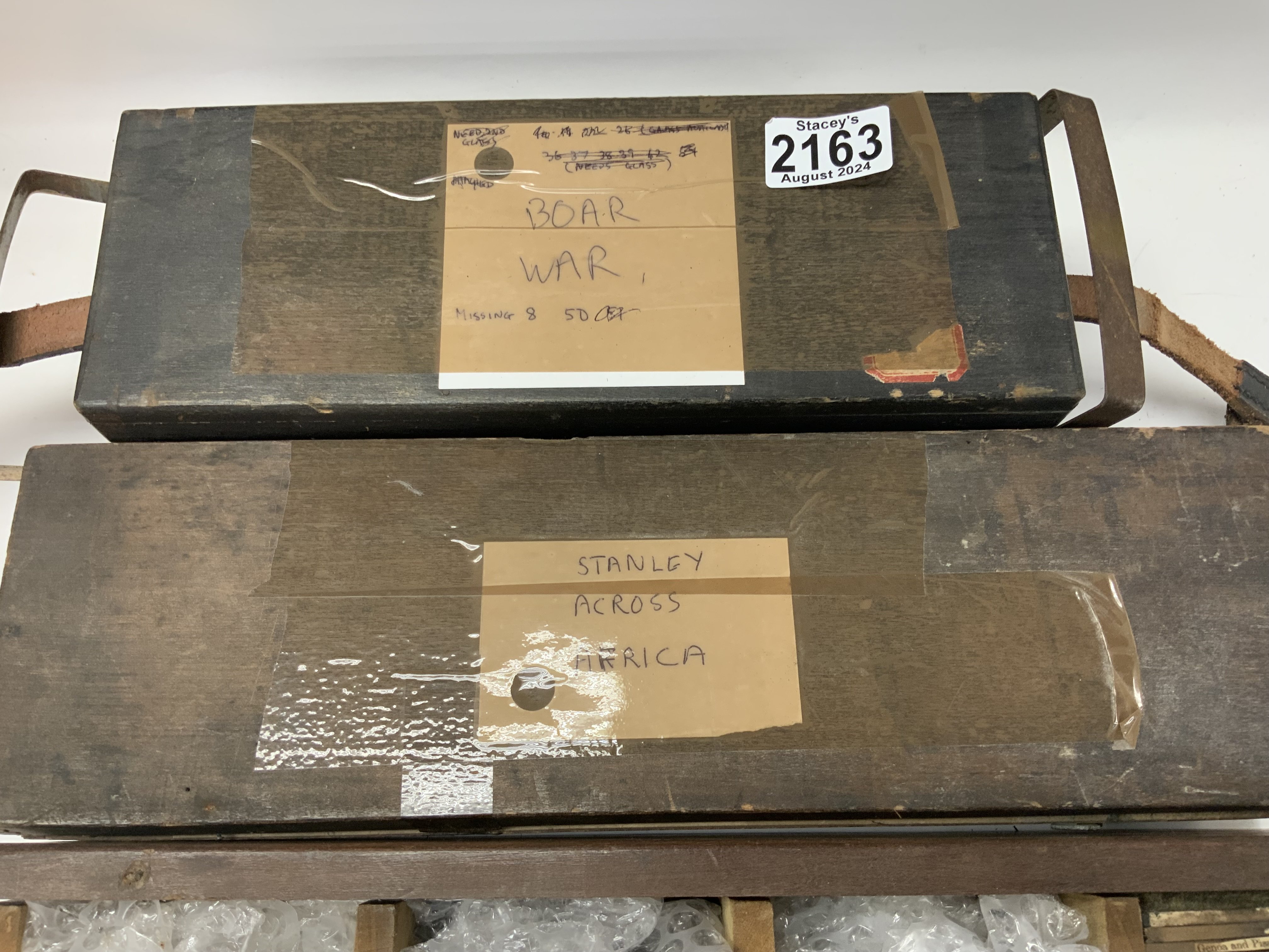 4 boxes of vintage glass slides including a collection of Boar War coloured slides, Stanley across Africa, varied collection of storyboard slides. (D)