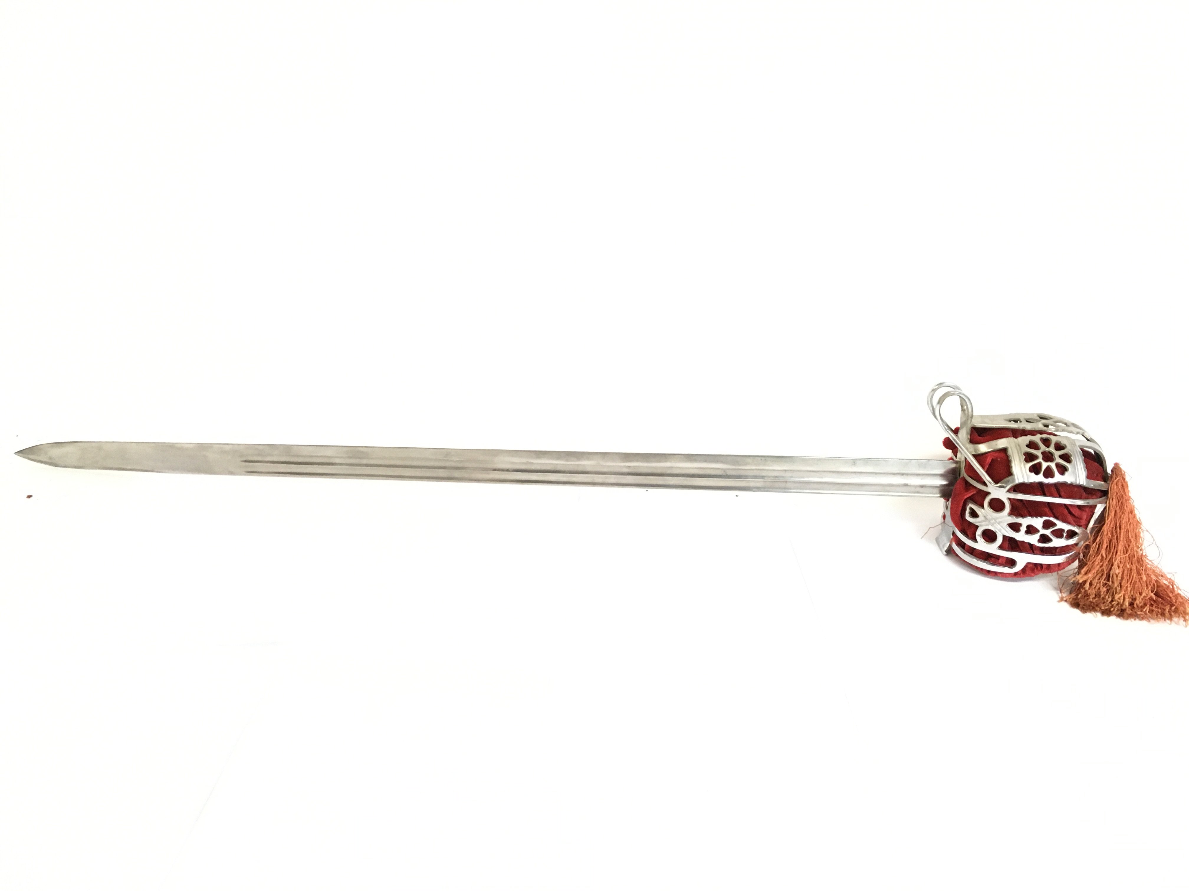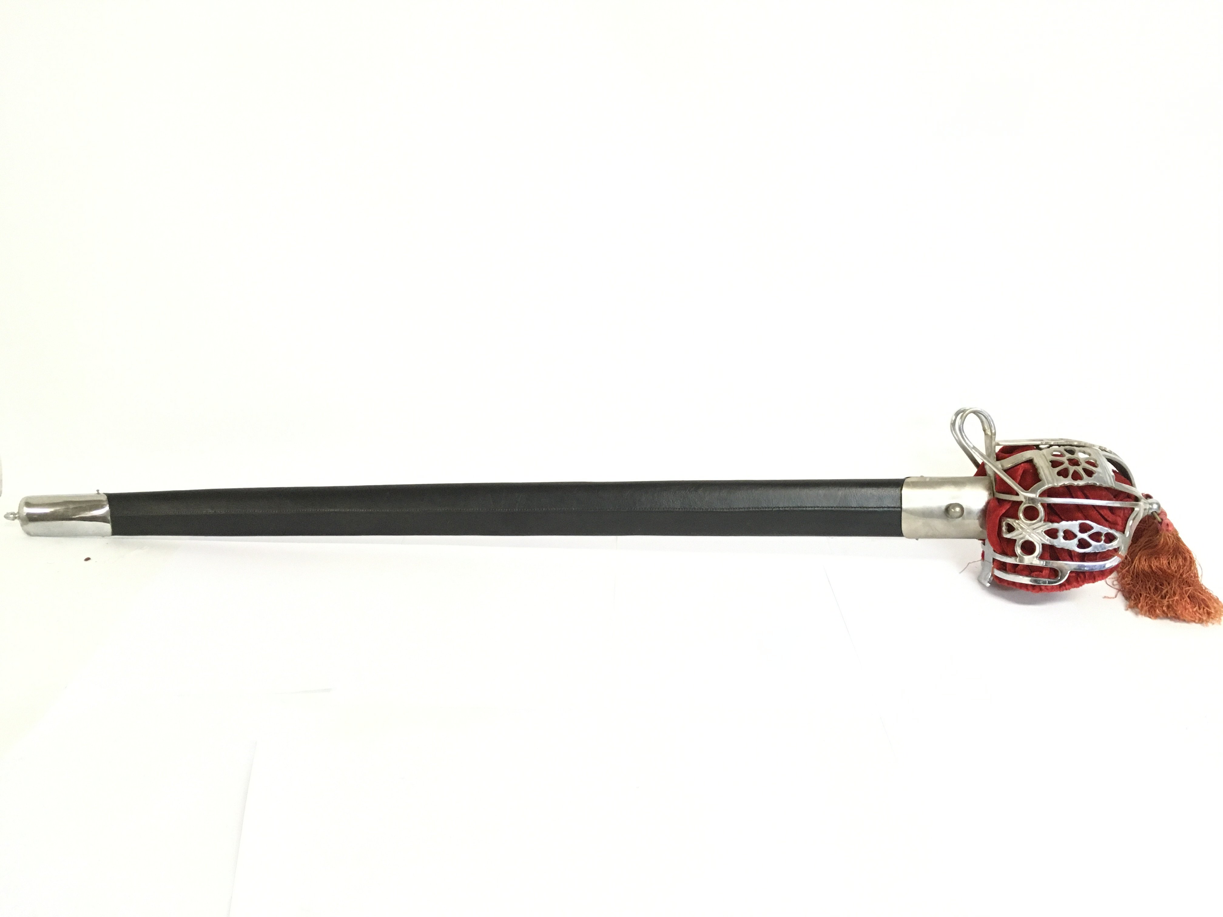 A Scottish basket hilt sword with scabbard. Blade approximately 90cm long