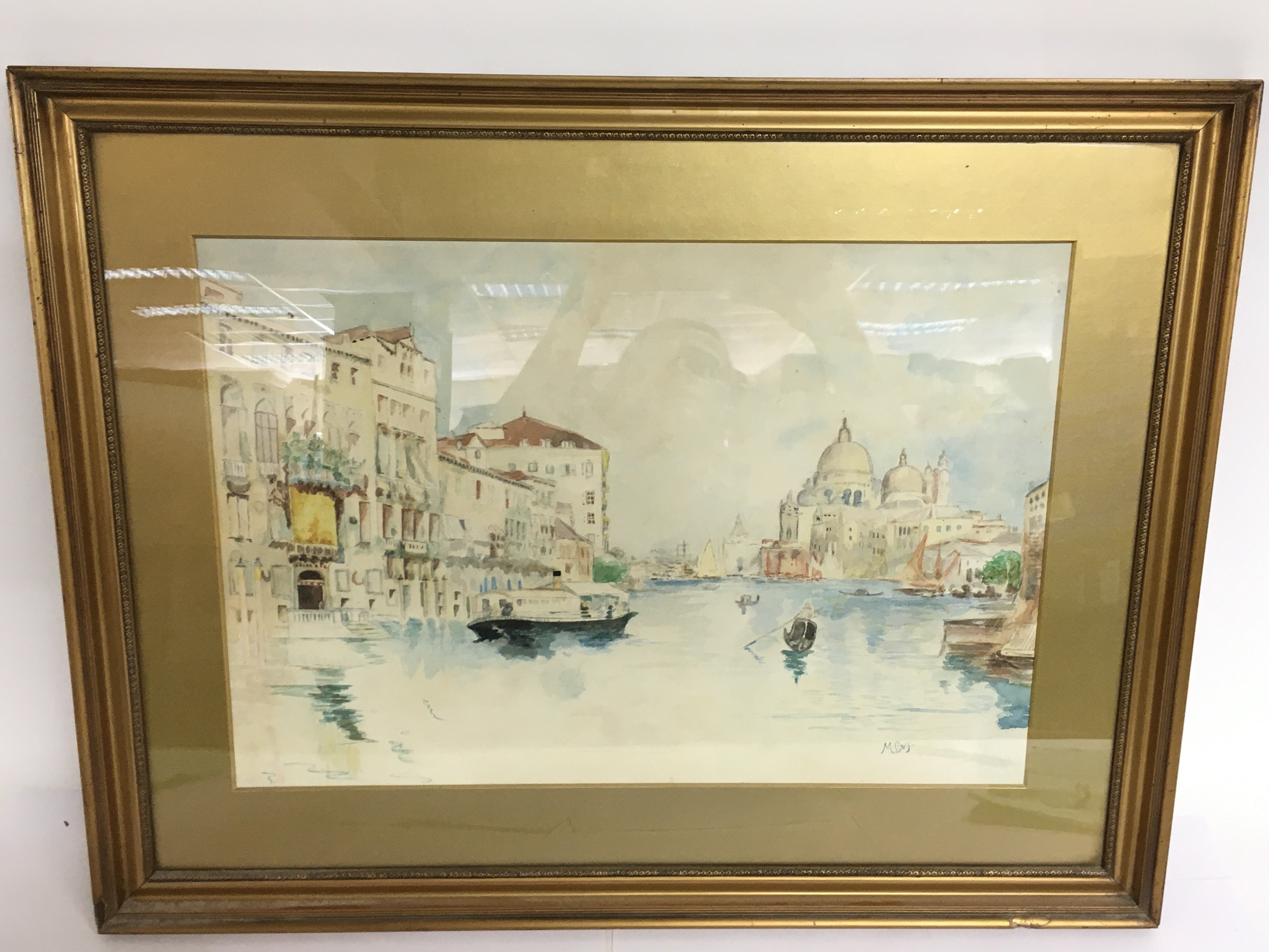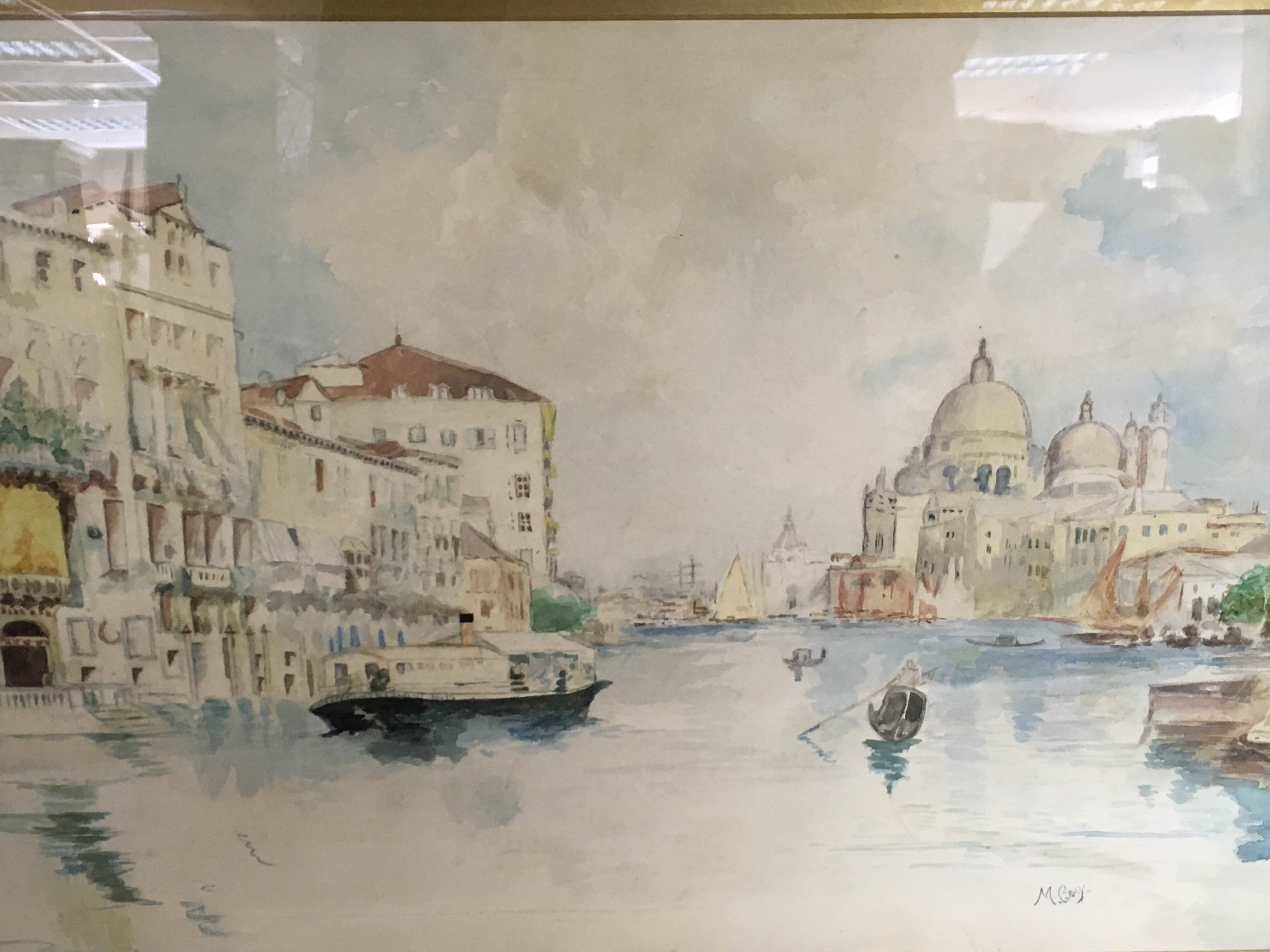 A framed watercolour painting of a Venetian scene signed M. Gray. This lot cannot be posted