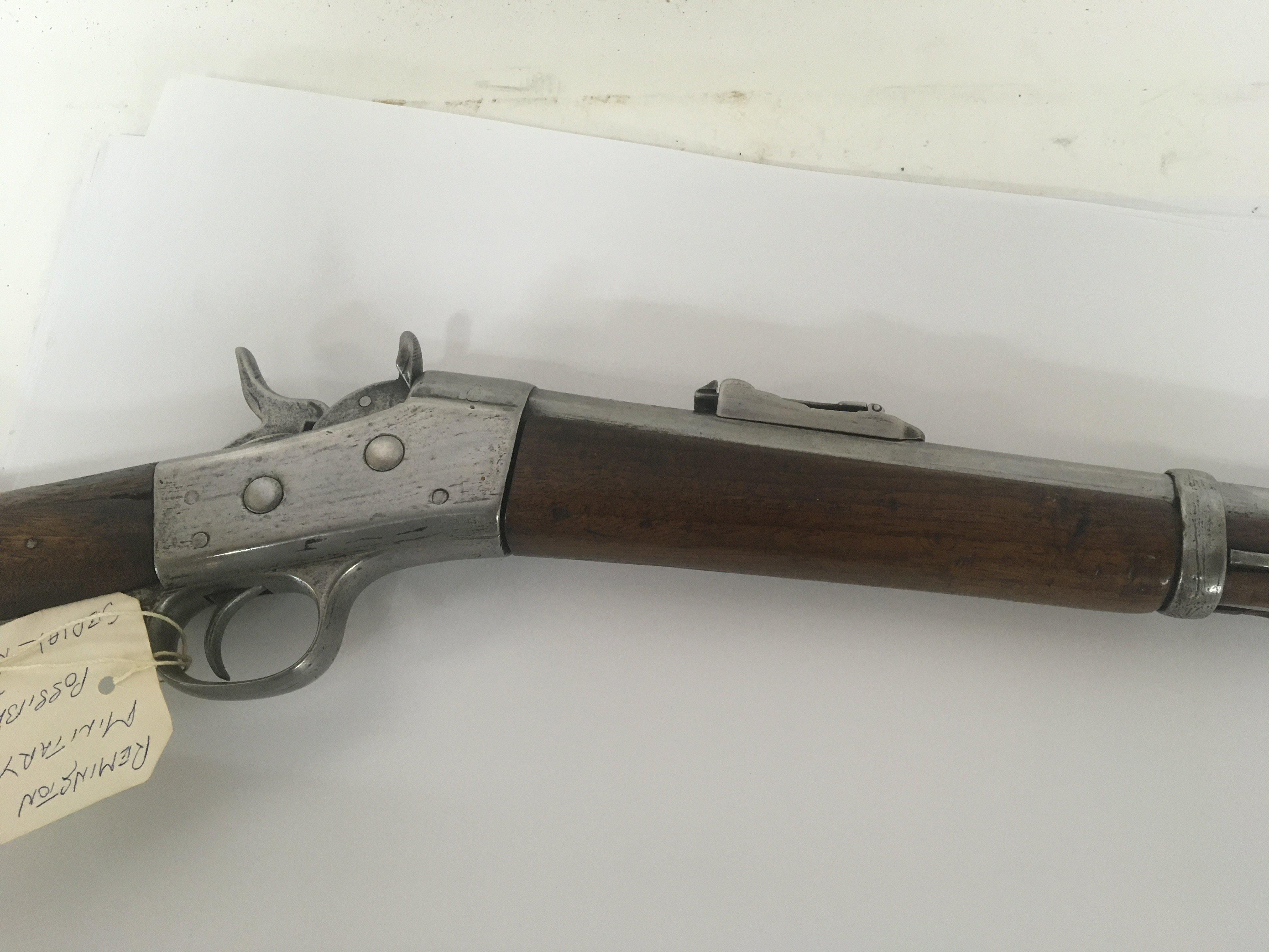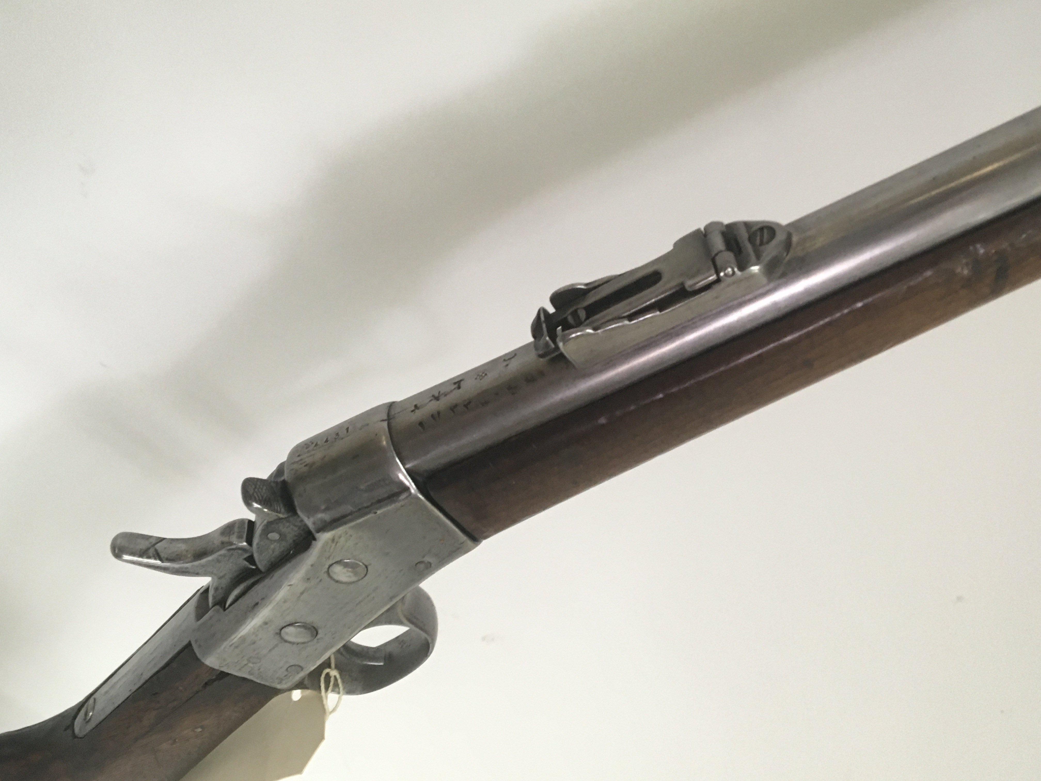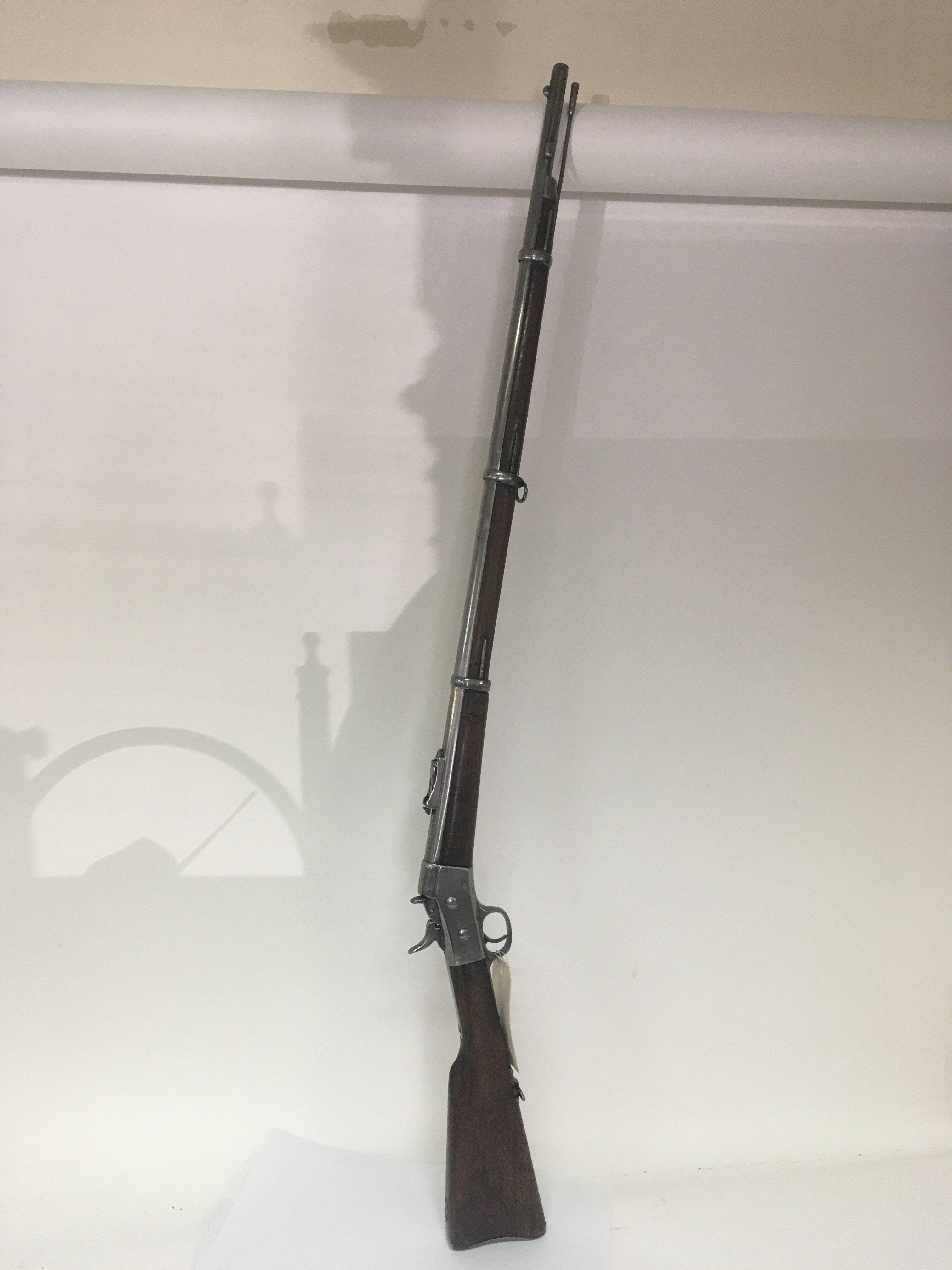 Late 19th century Swedish .50 cal. rolling block centre fire Remington rifle, polished steel action and round barrel with bayonet bar to front, three barrel bands clearing rod under, full length stock and two sling swivels, , folding adjustable rear sight to 300yds., serial no 4431 with other marks .50 obsolete caliber no license required.