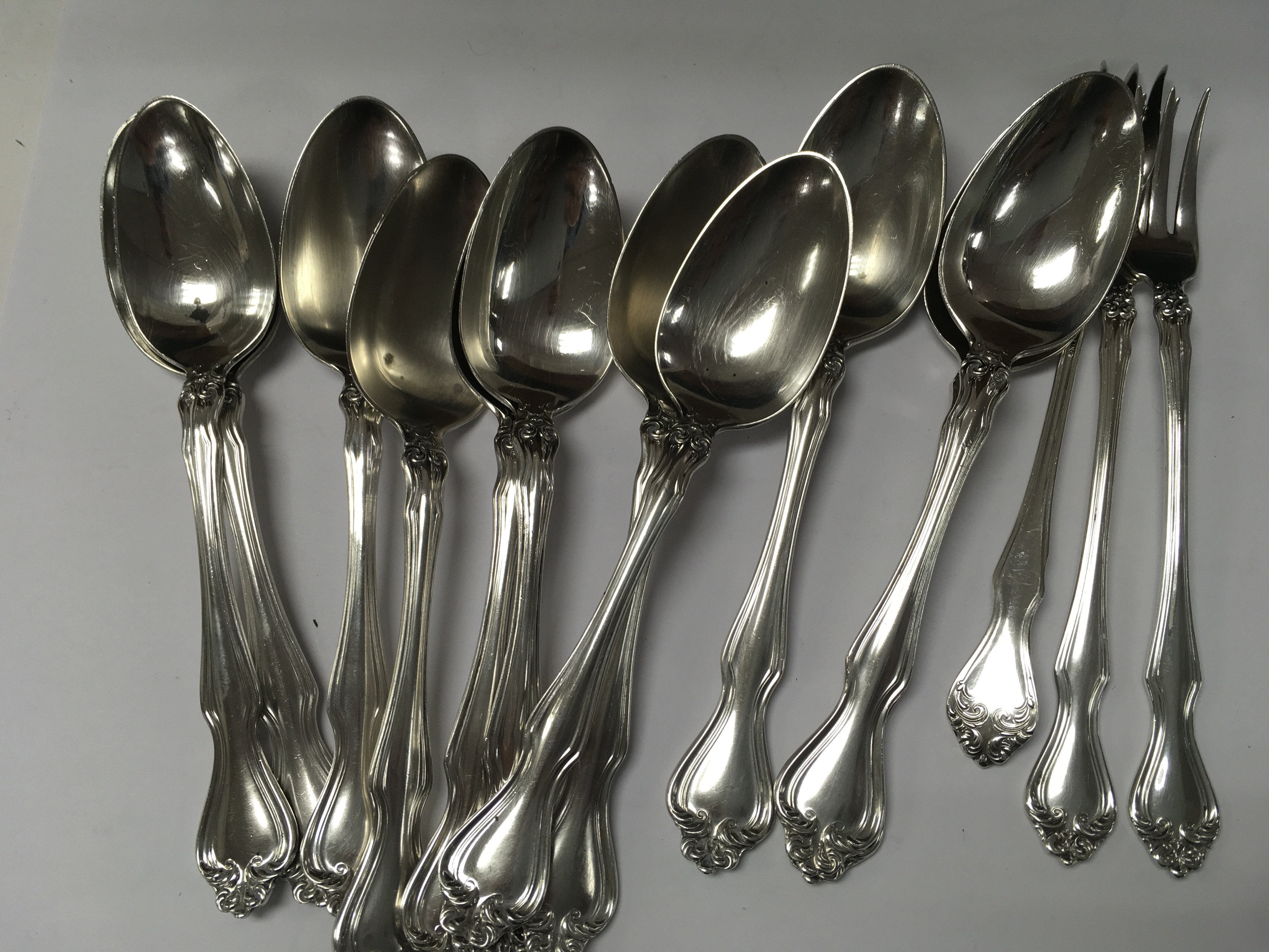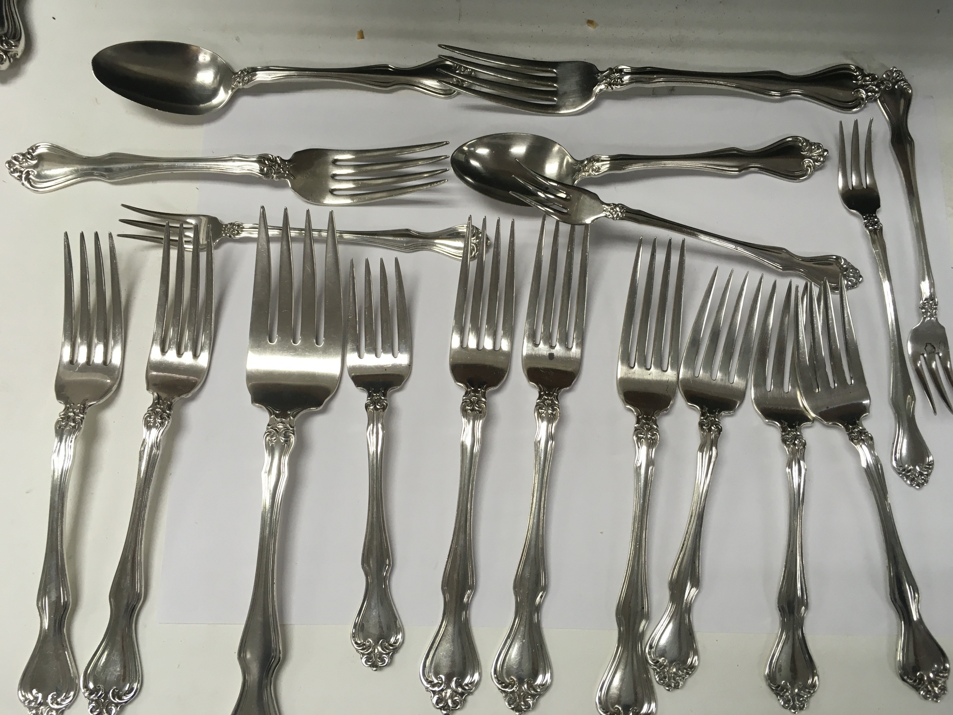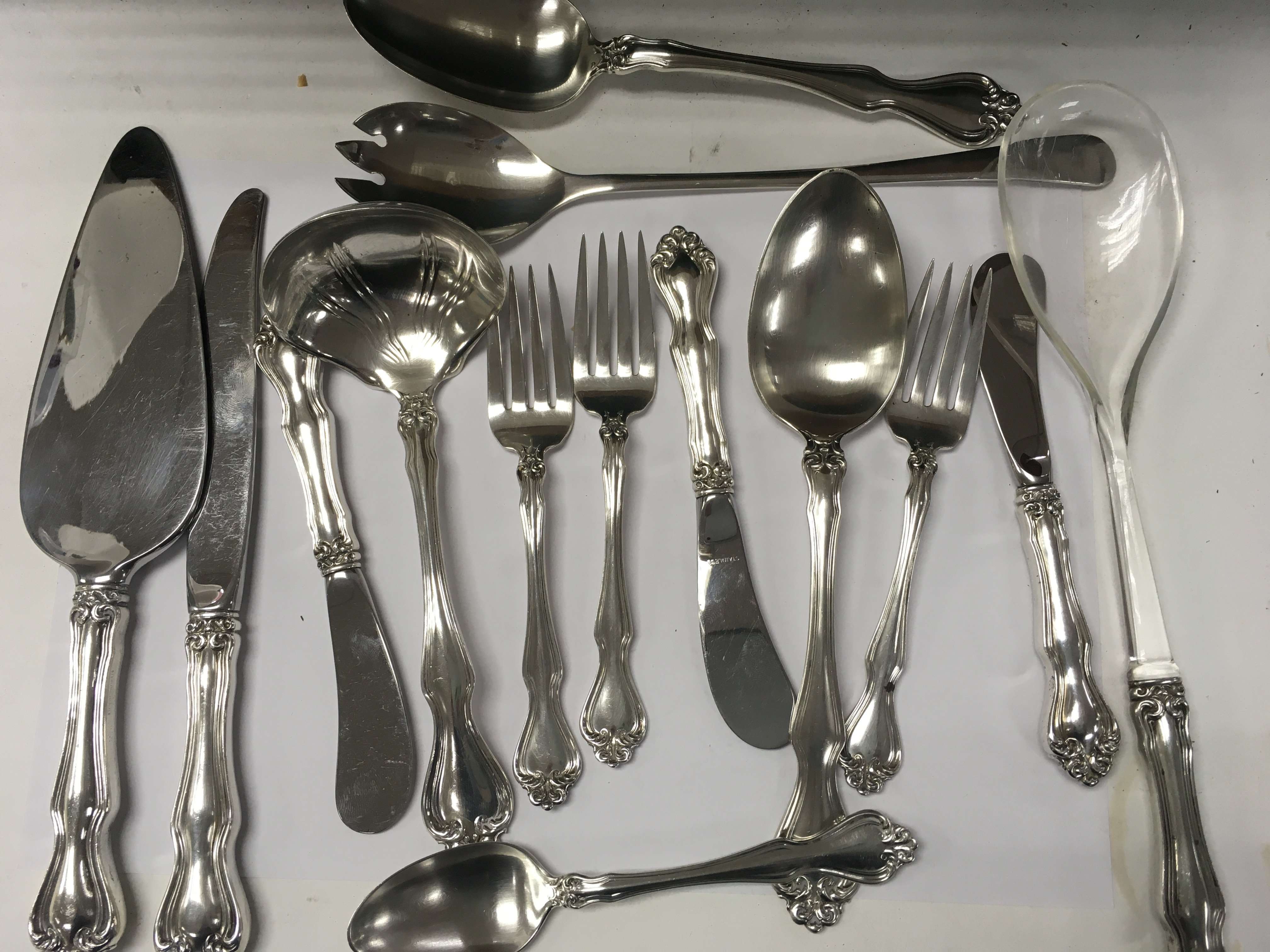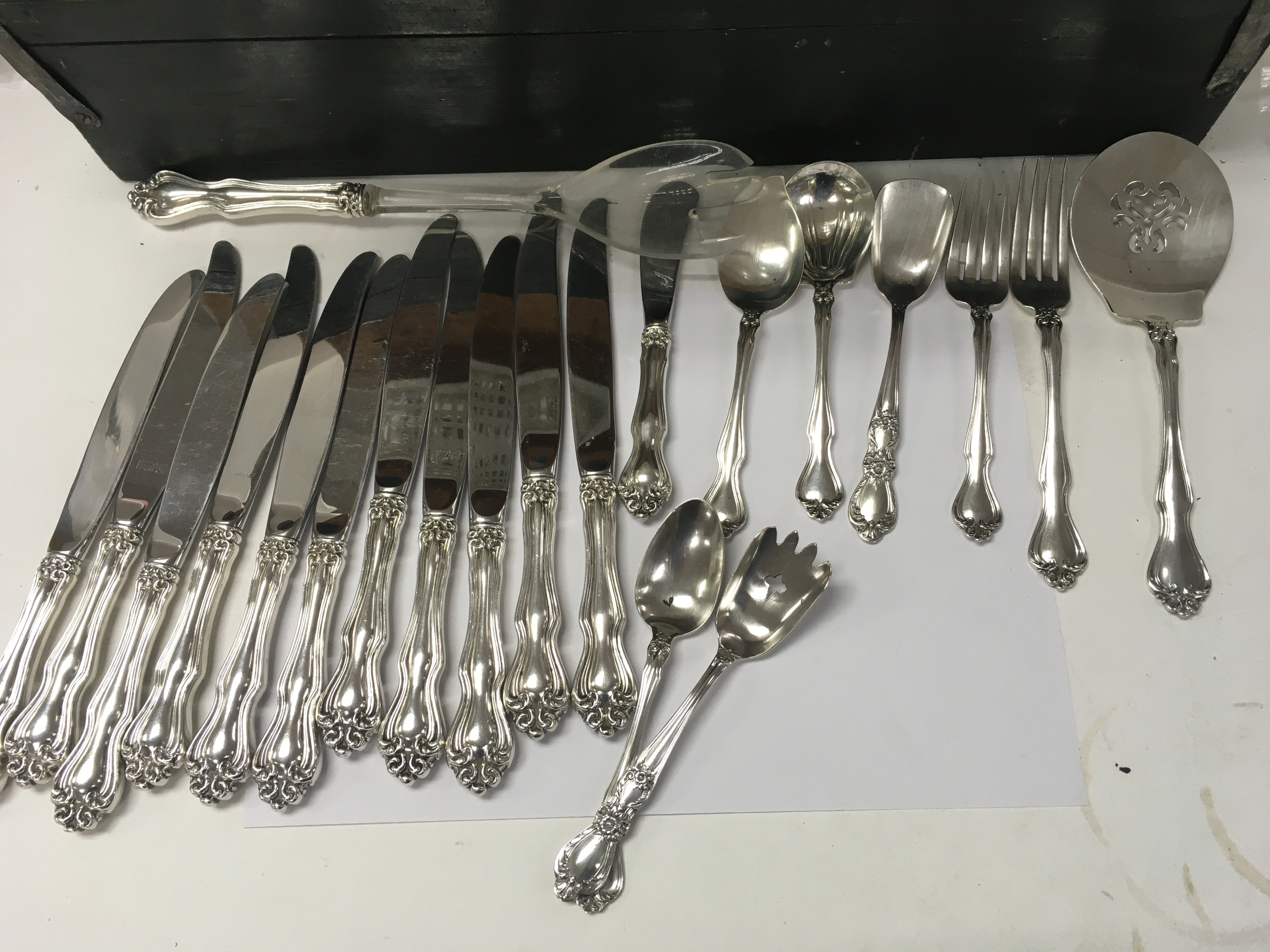 A collection of sterling cutlery including knives forks spoons serving spoons.