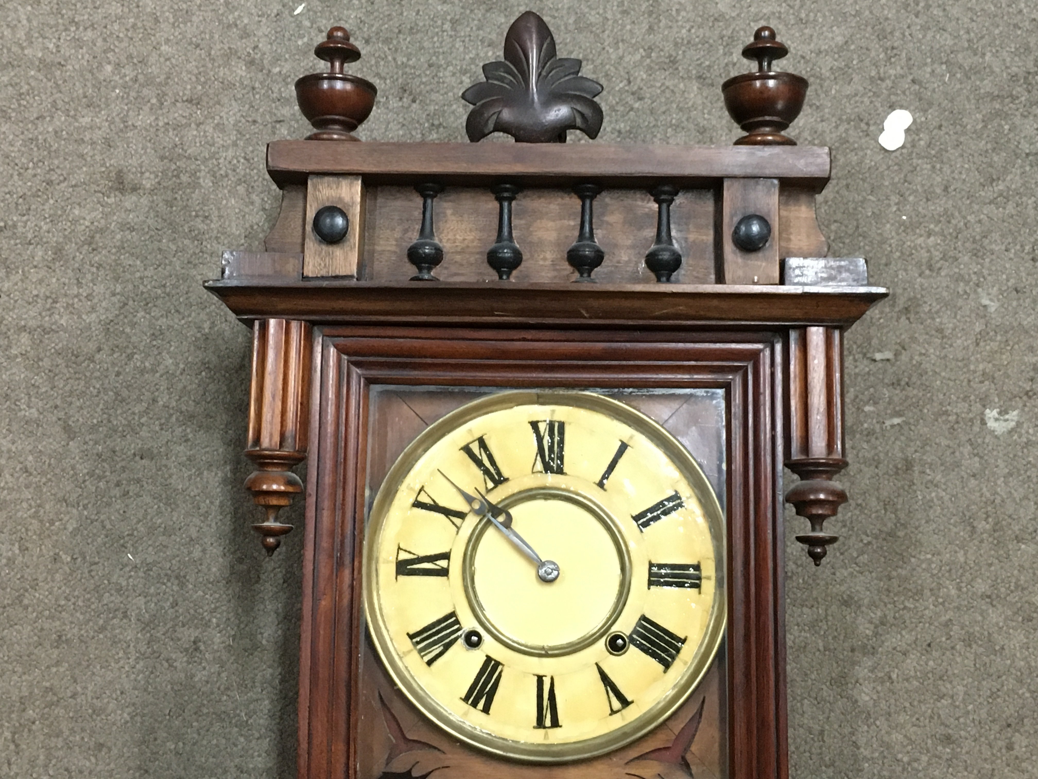 A Continental wall clock with inlaid and carved wood design. Dimensions approximately 16x38x100cm