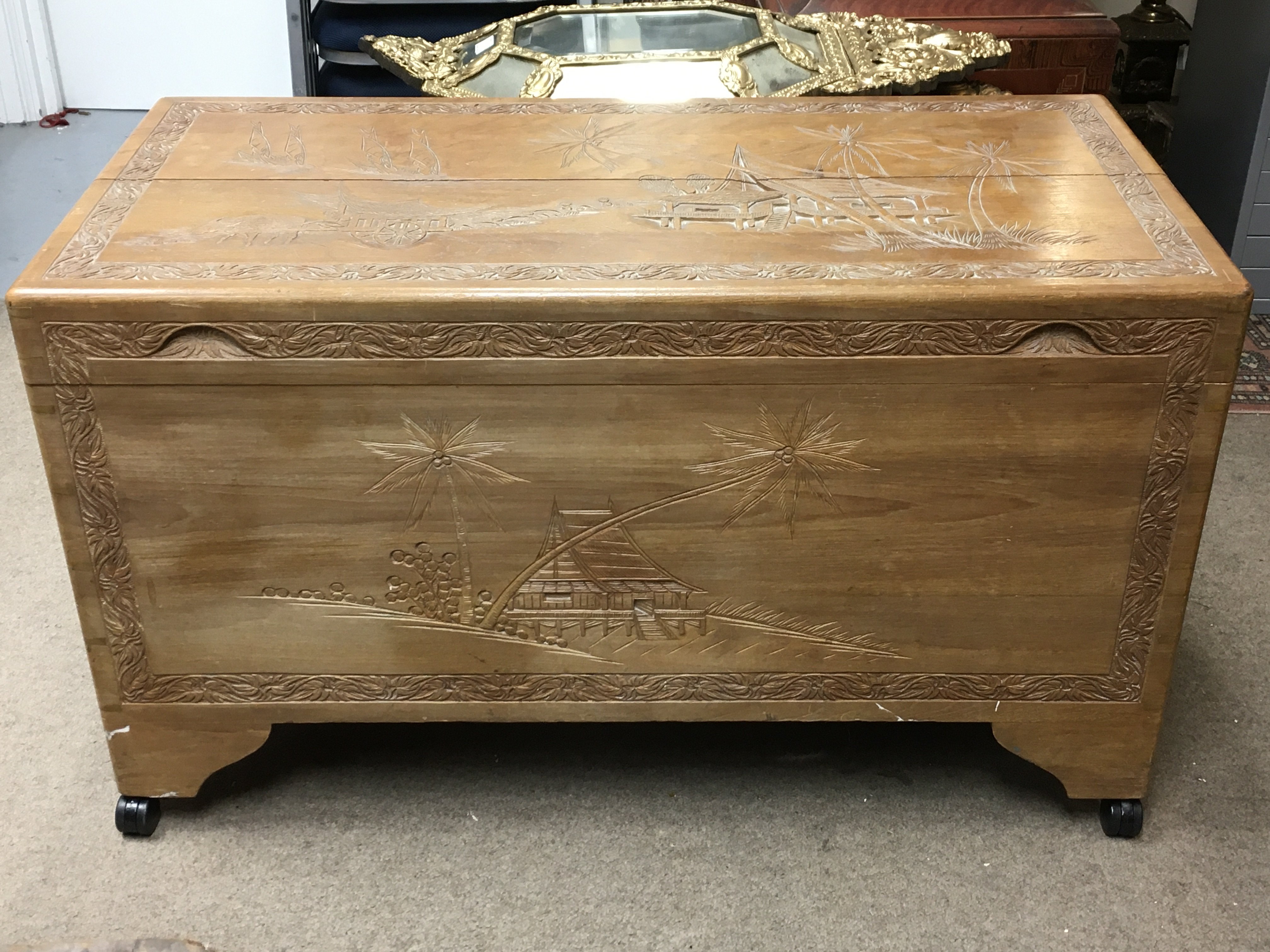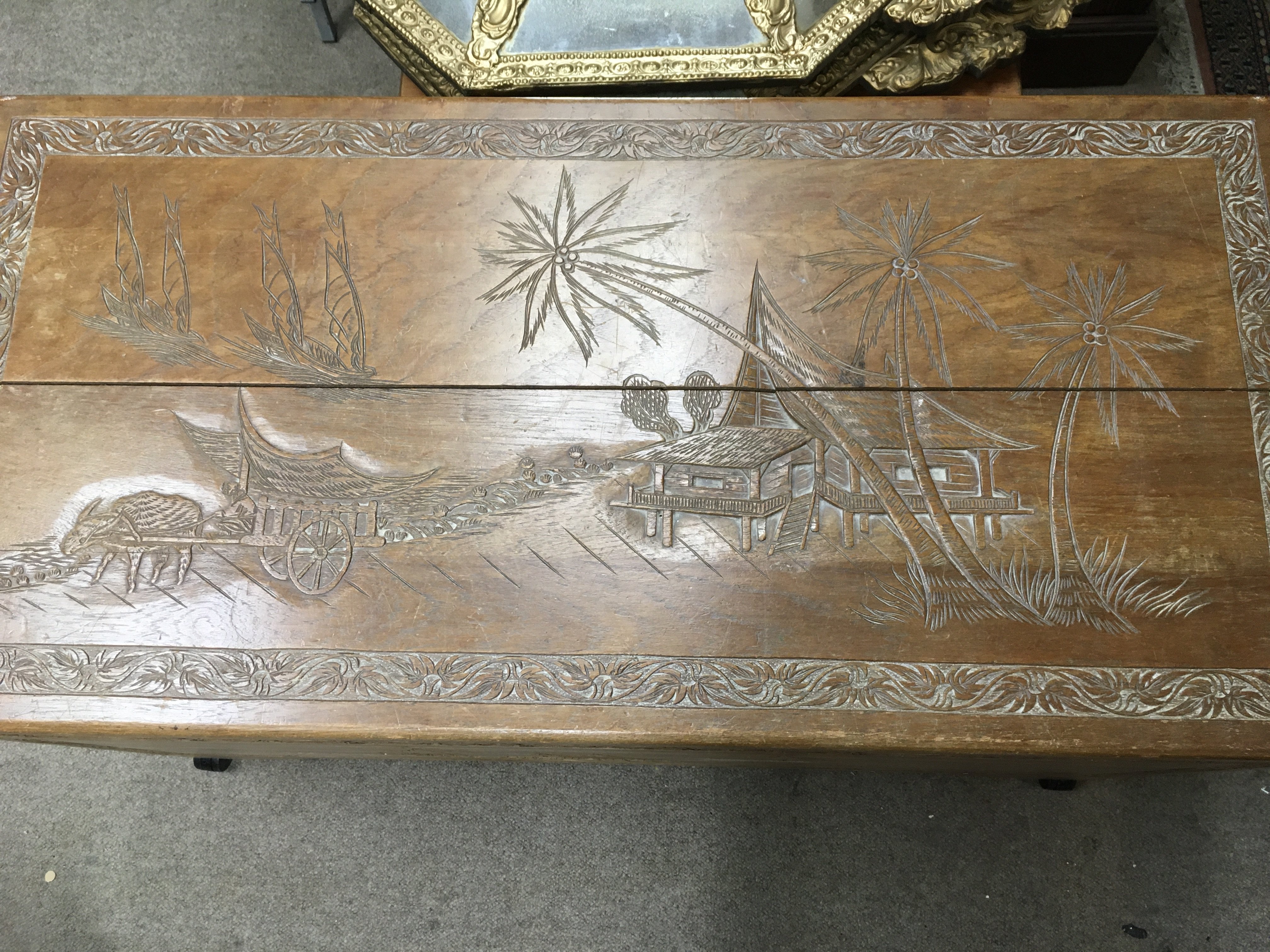 A Camphore wood trunk with carved oriental style design of temples and a ox cart. Dimensions 50x100x58cm