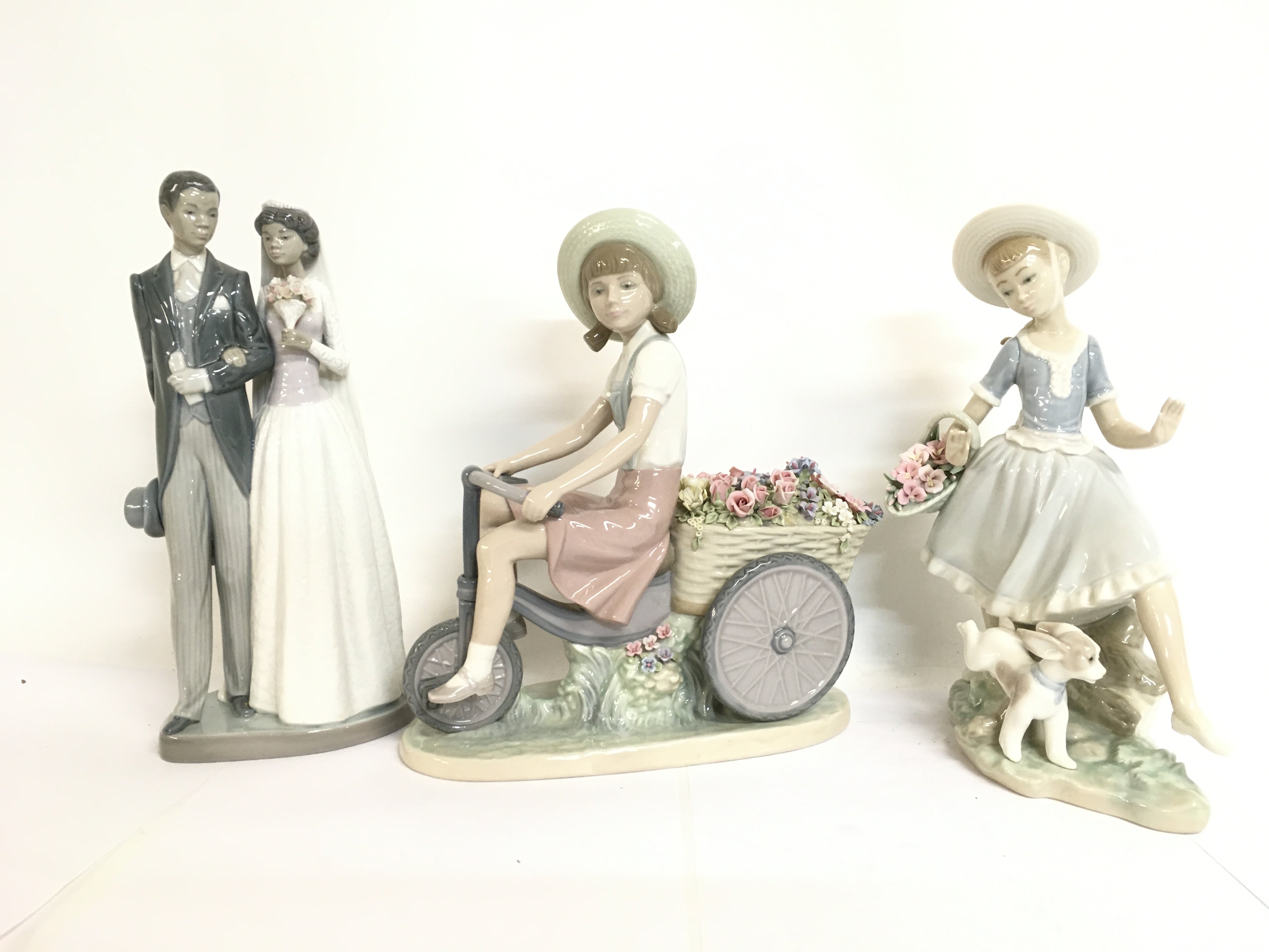 Boxed Lladro figures including Girl with flowers in tow, Country Lass and Wedding Day. Approx 28cm tall. No obvious damage or restoration This lot cannot be posted