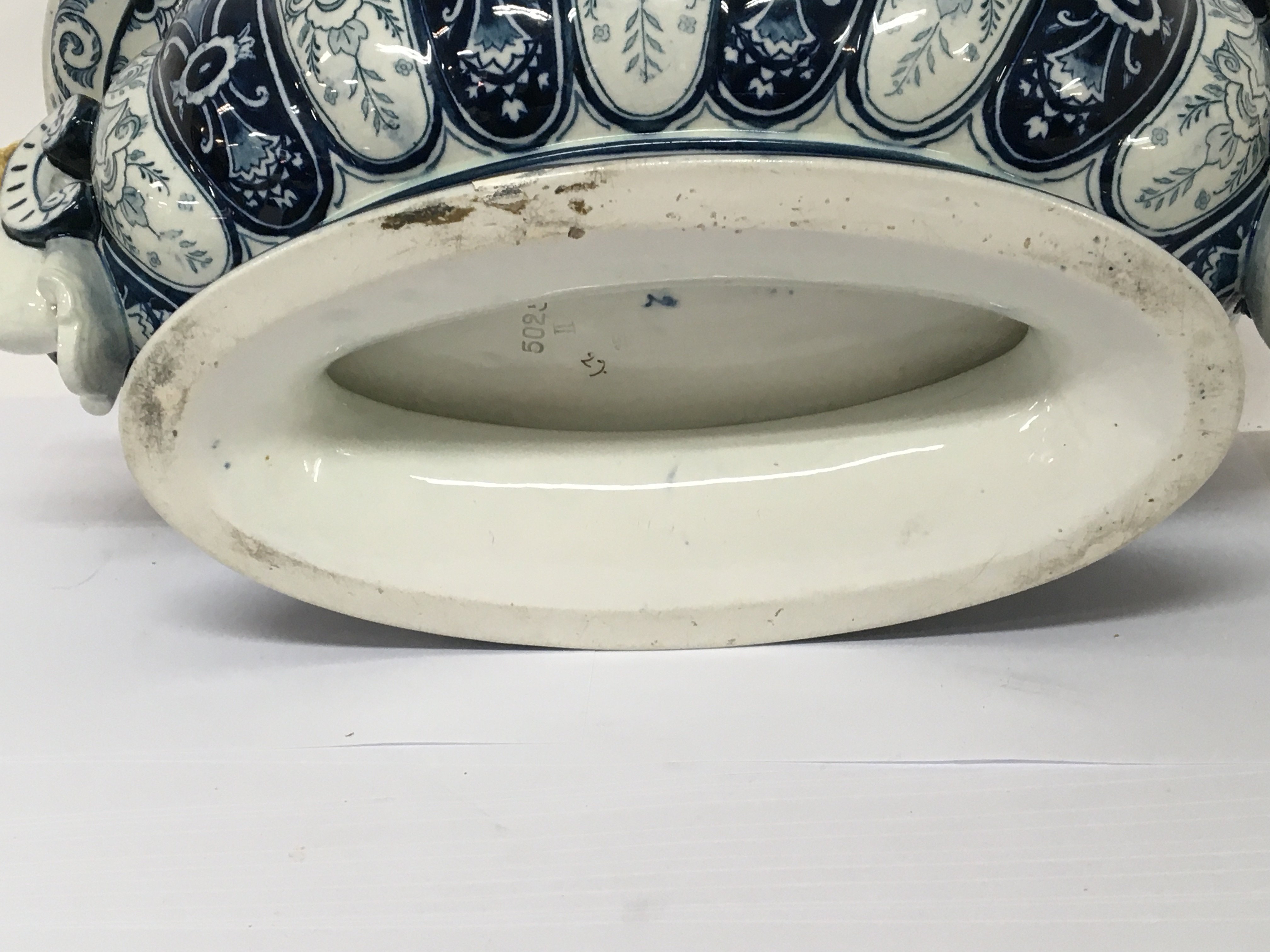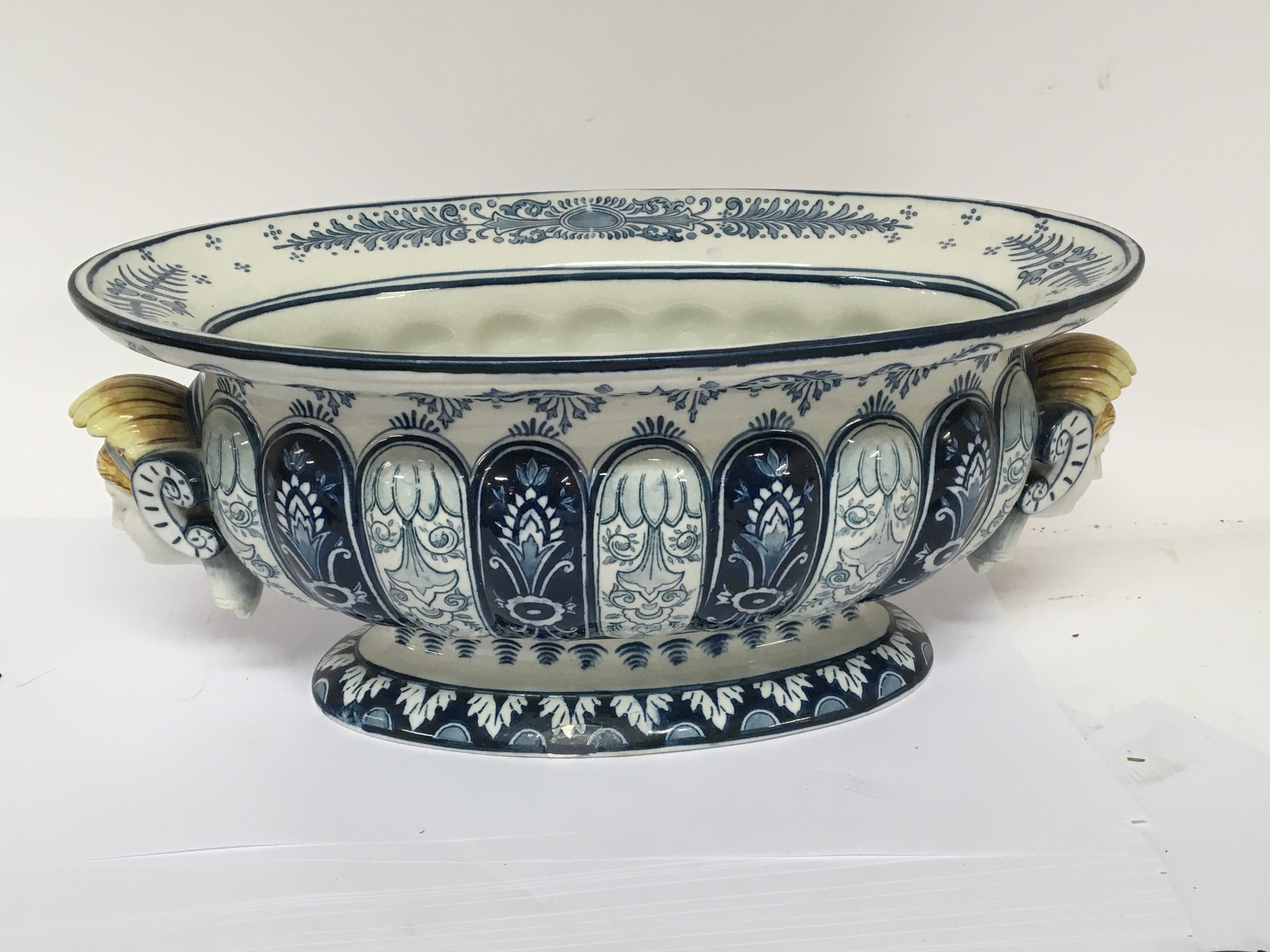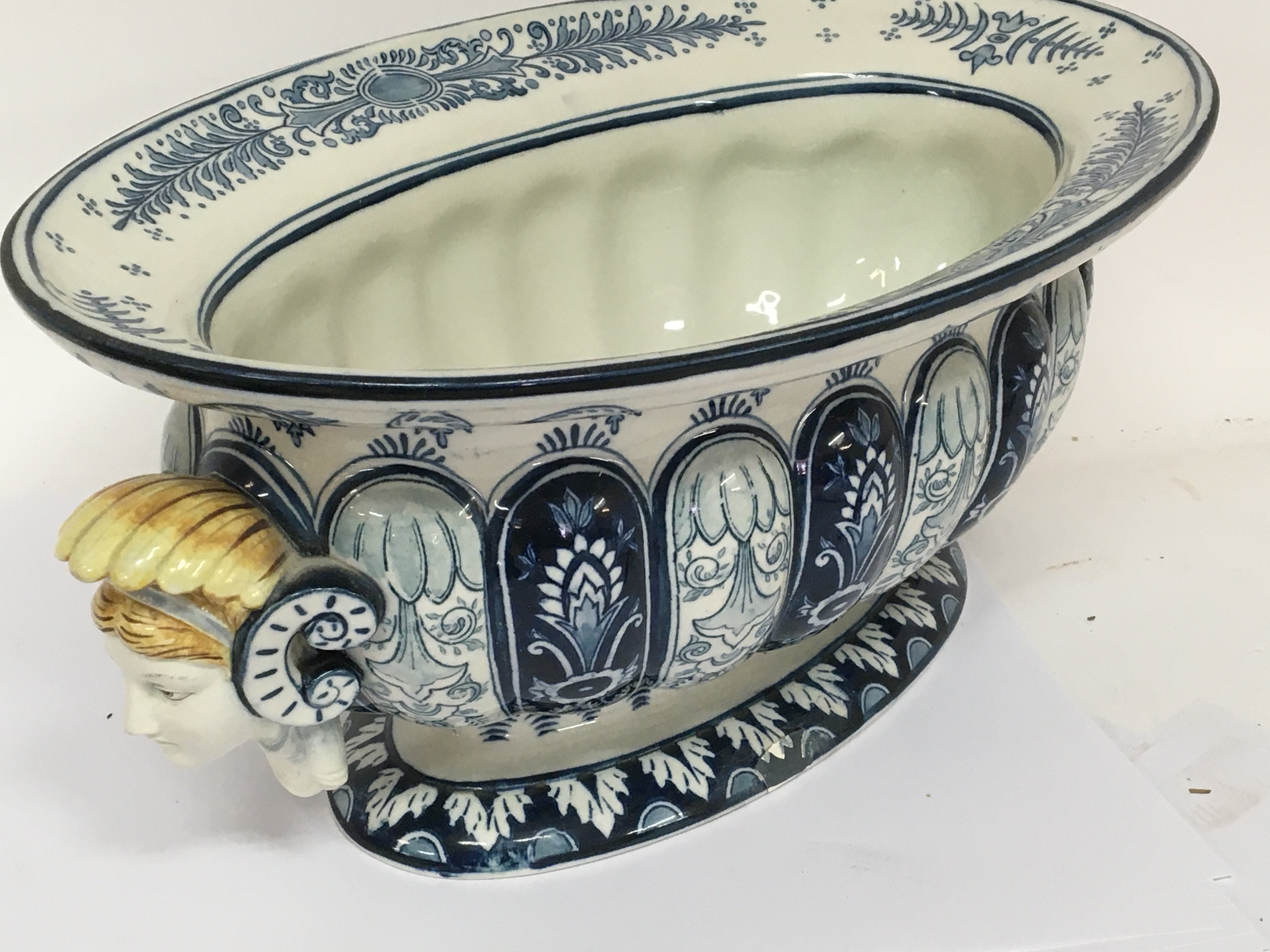 A Quality Continental late 19th century blue and white jardiniere of oval shape with raised and applied heads. Impress marks to the base. 44cm wide.