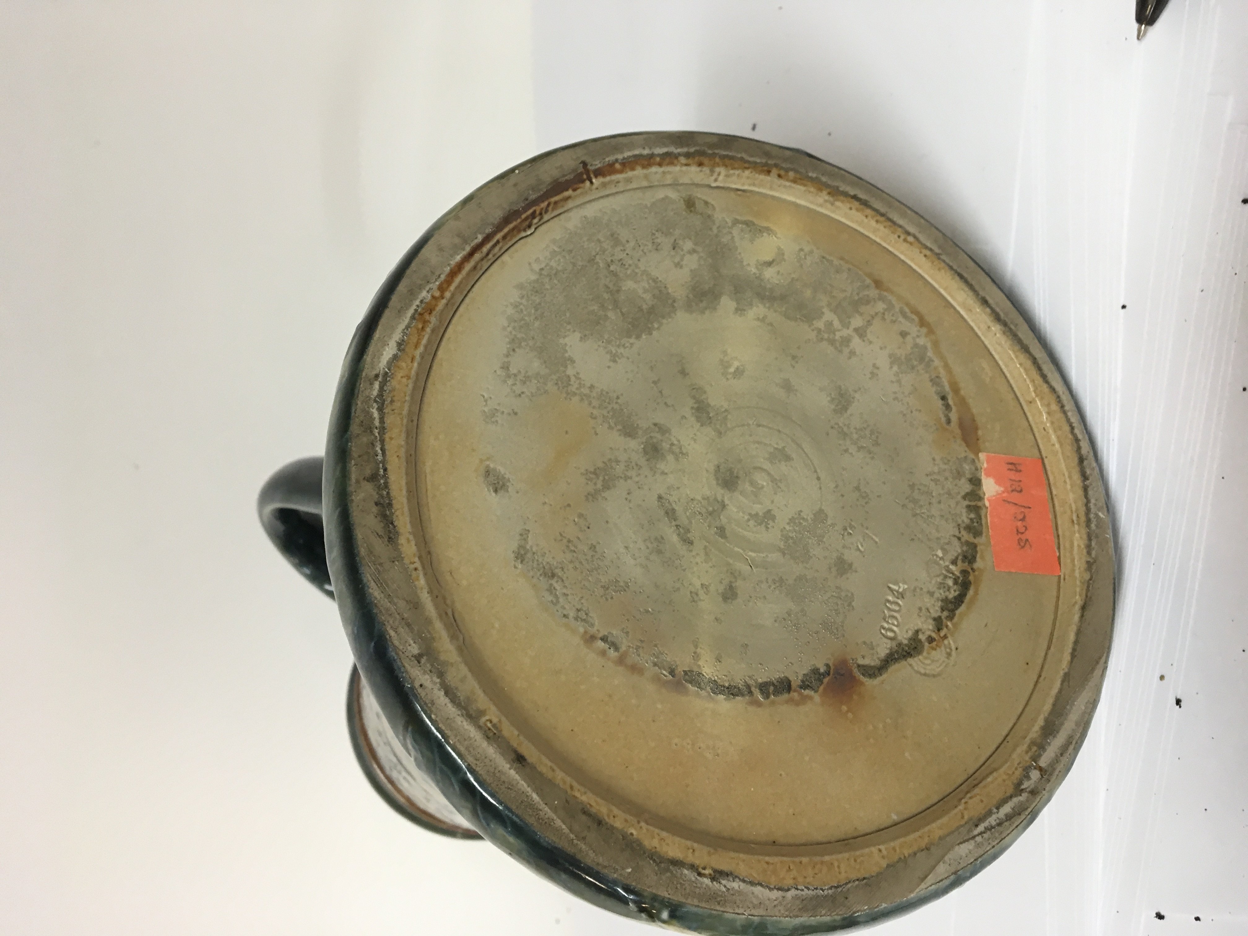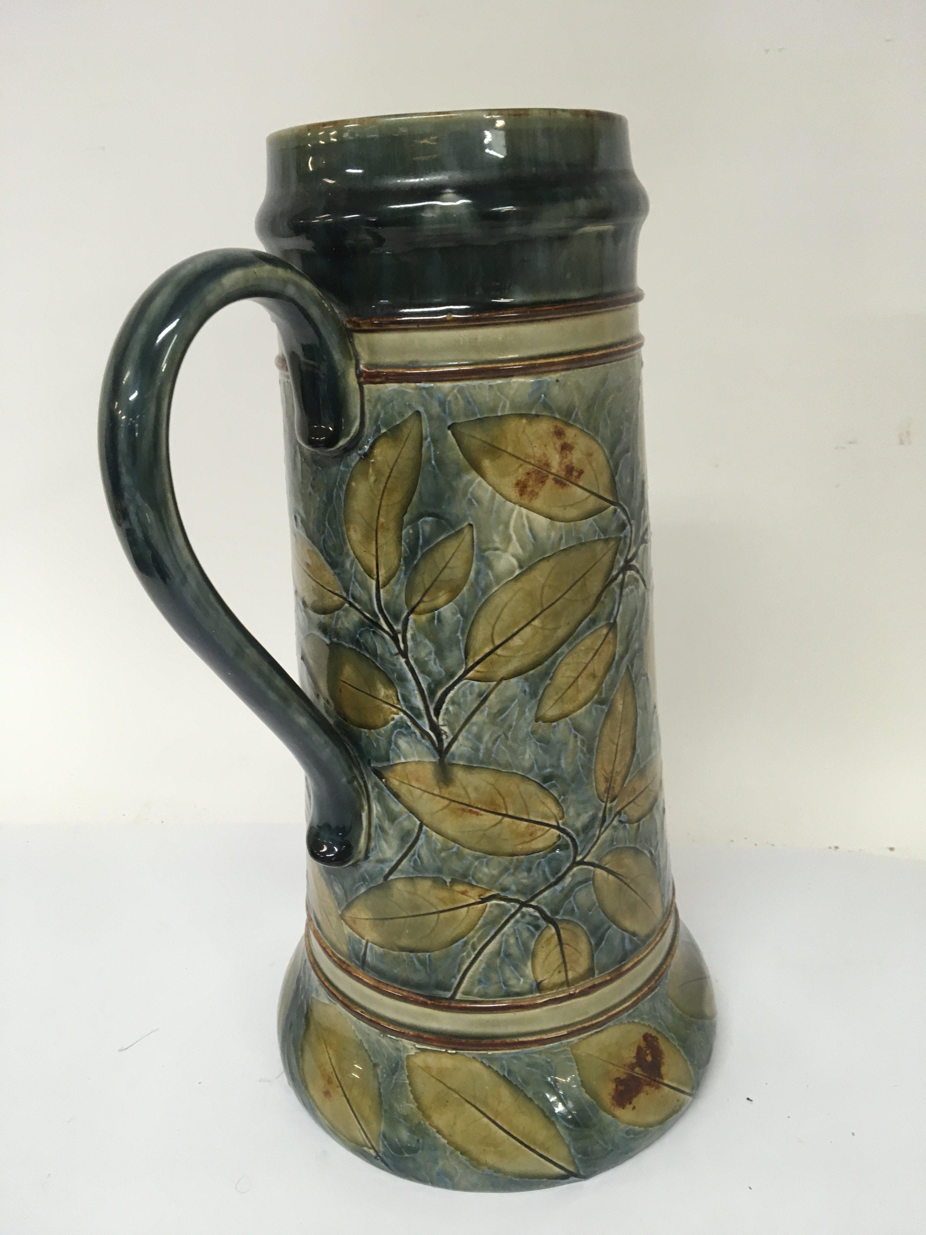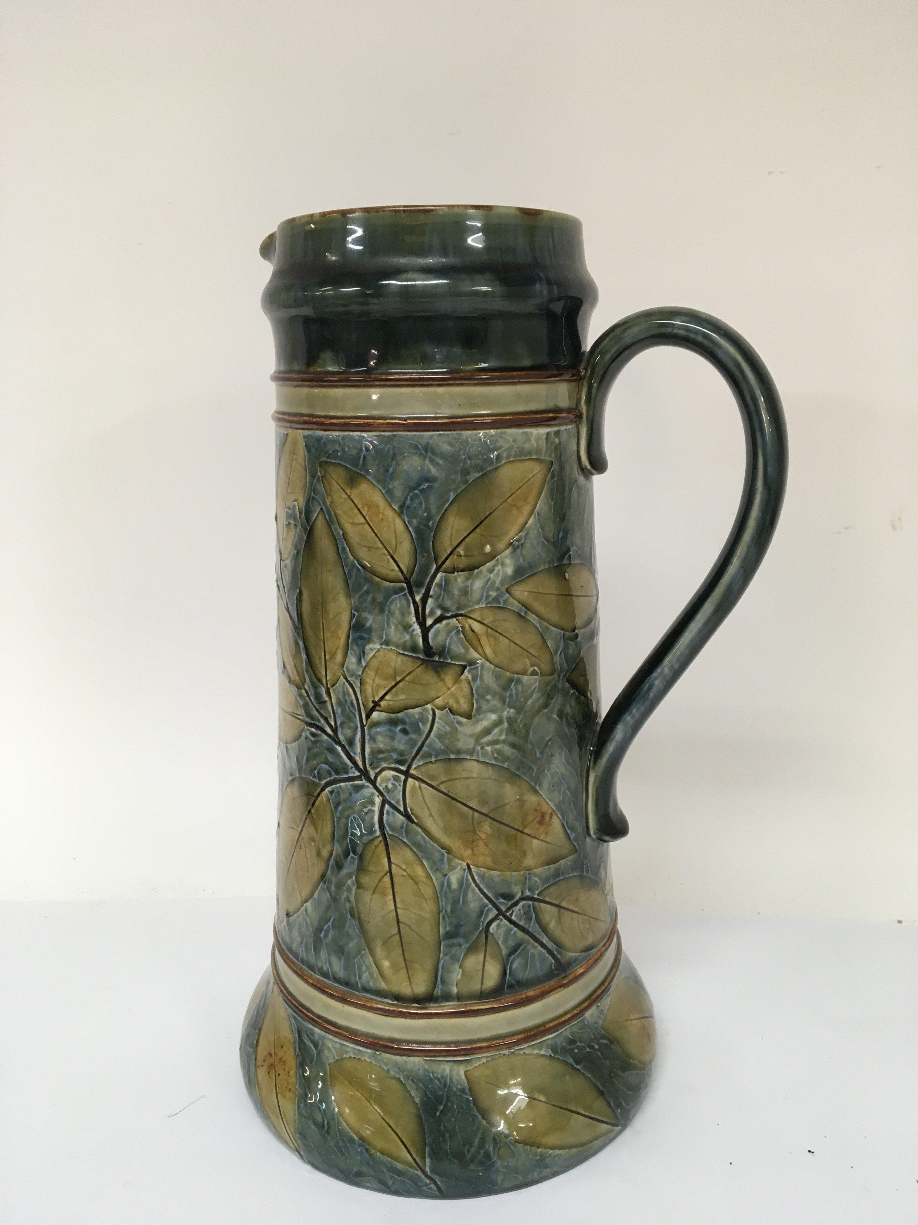 A large Royal Doulton stoneware jug with impressed leaf pattern on a blue green ground. Height 36cm