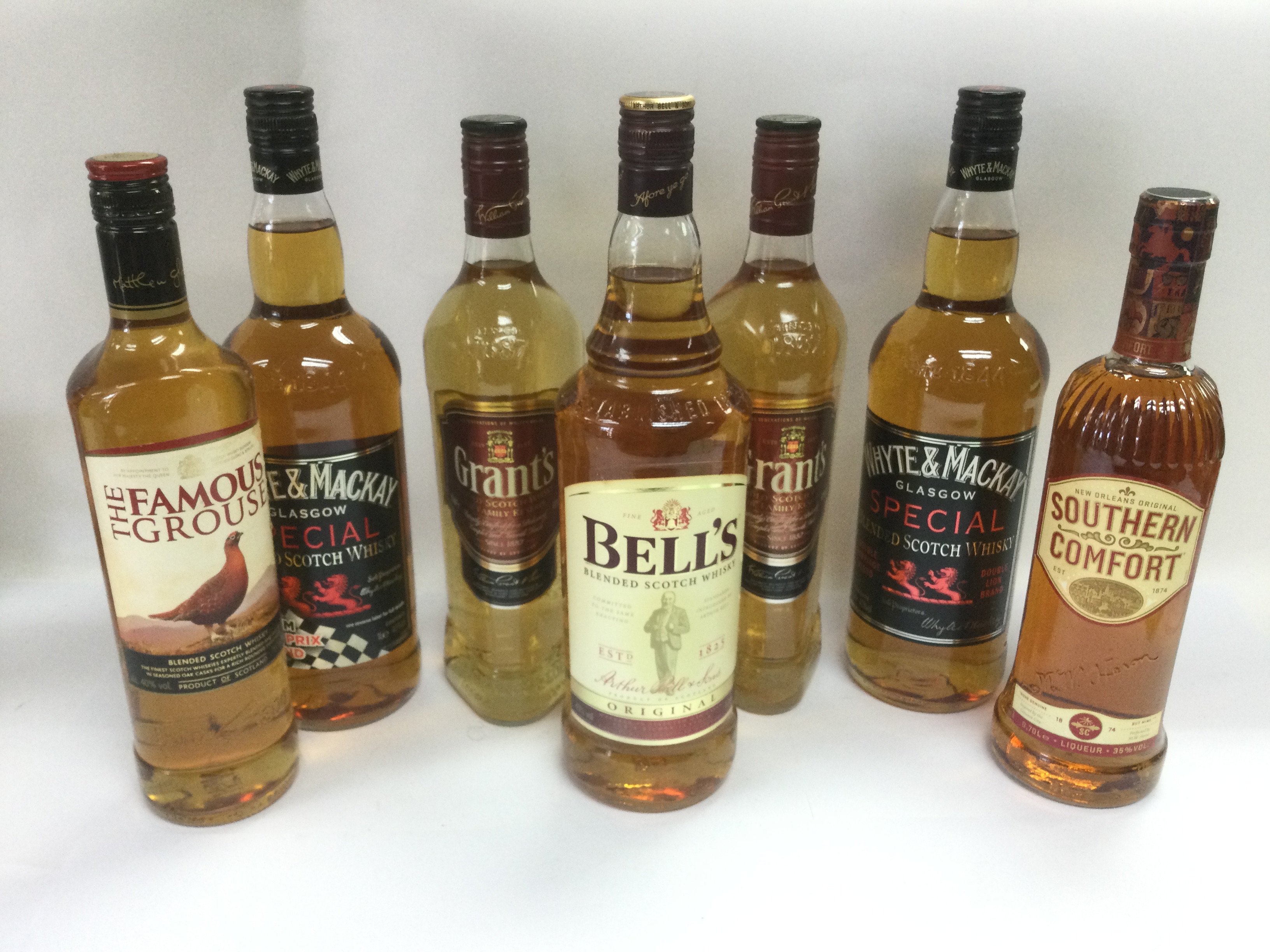 Seven bottles of whisky, various makes including Grants, Whyte & Mackay, Bells and others. Shipping category D