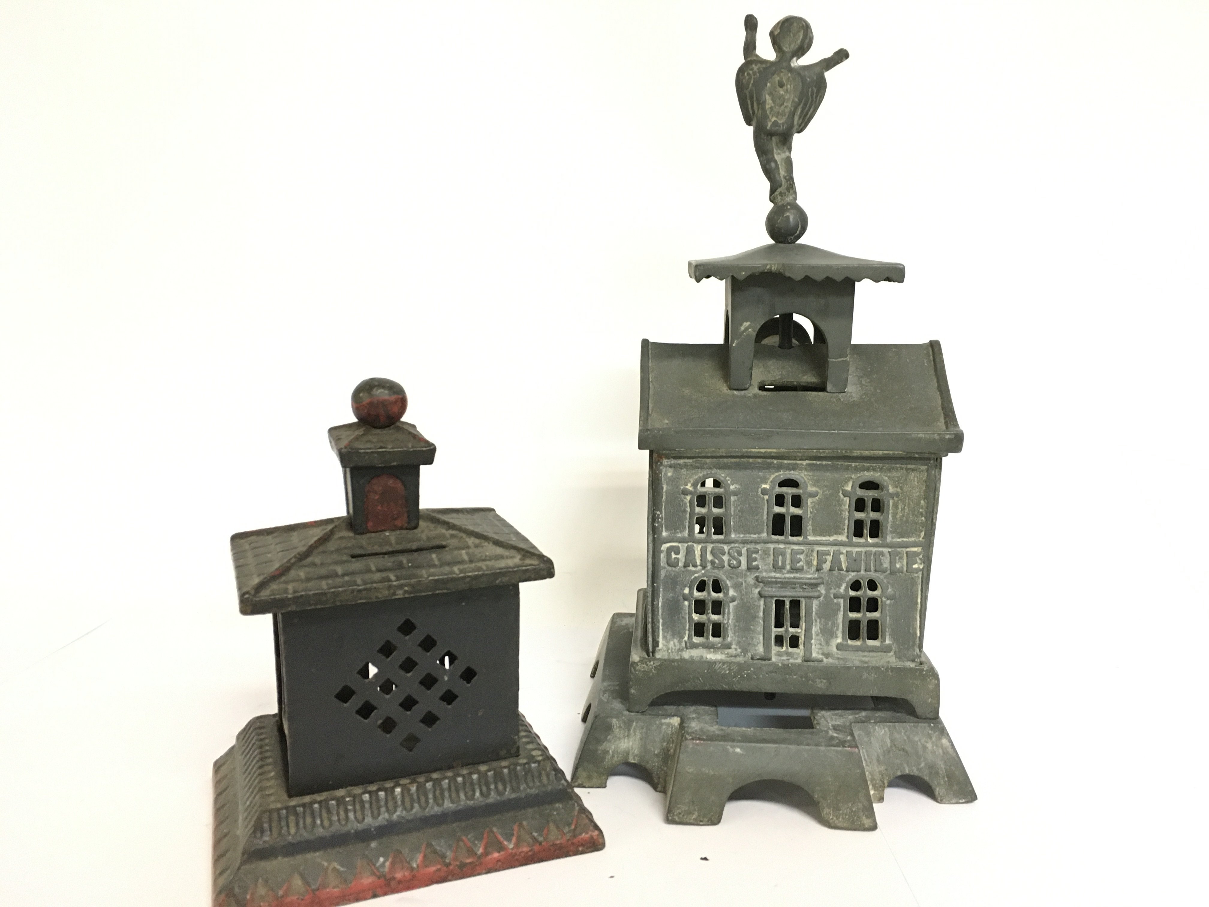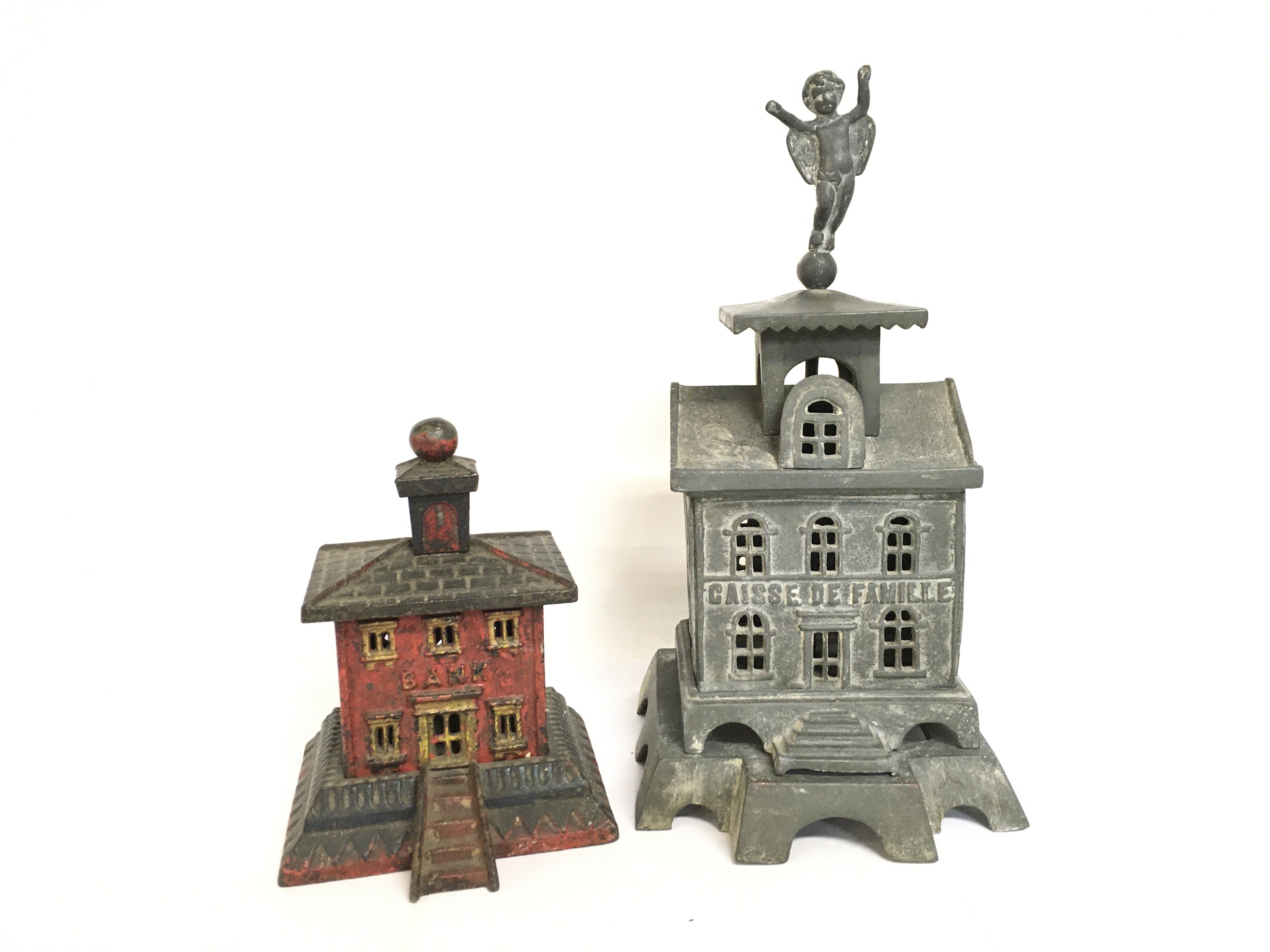 Cast iron money box buildings, a bank and a French Family Fund building. 18 and 32cm tall. Postage category C